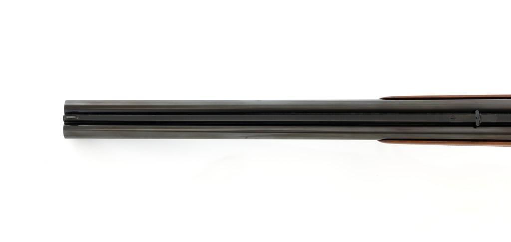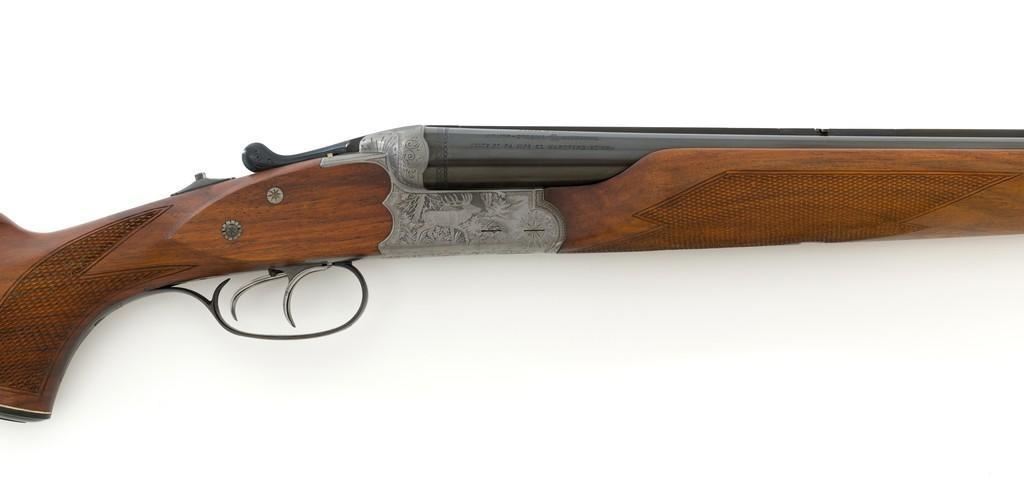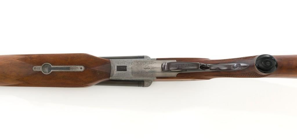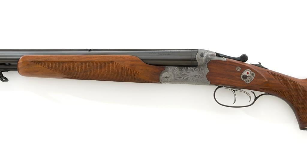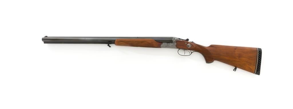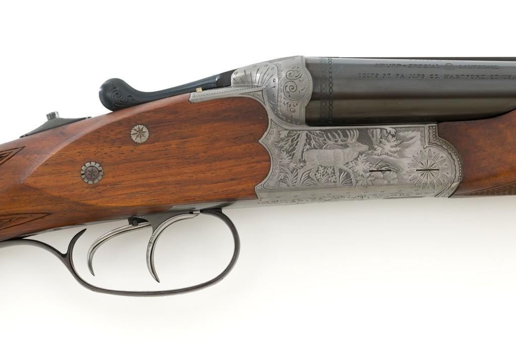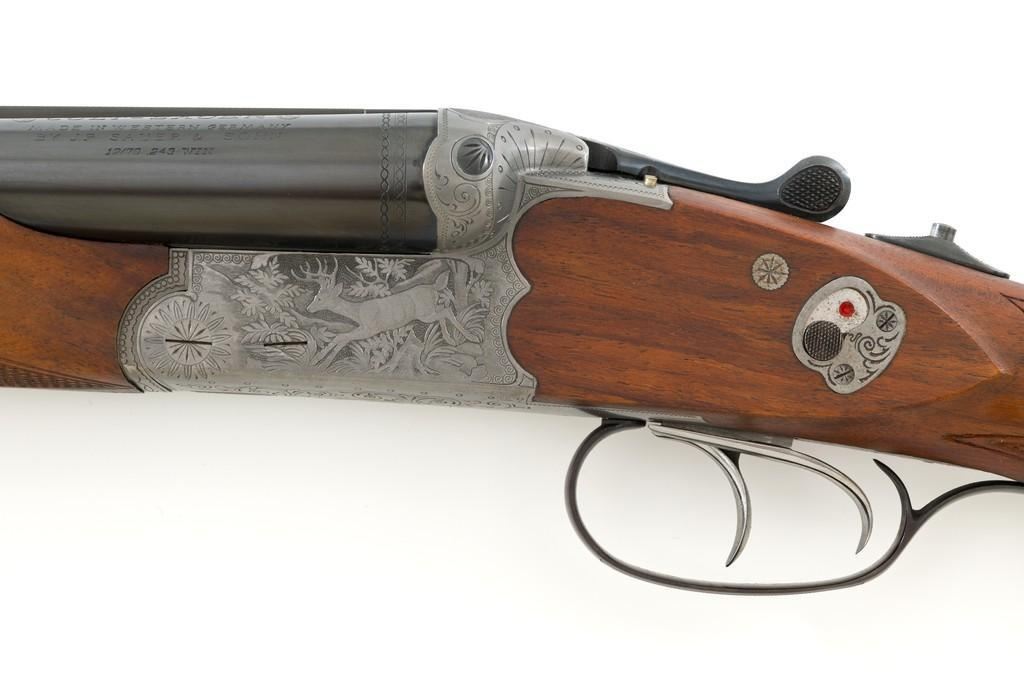 Colt Sauer Model 3000 Boxlock Drilling, #GG8221, 12 gauge over .243 Win. cal., 25'' Krupp steel blue finished barrels. French gray receiver is finely relief engraved with Germanic game scenes on two sides; depicting a bull elk on the right and stag on the left. The metal work is first rate with engraved screw heads, scroll and border engraving complementing the game scenes. The checkered deluxe walnut pistol grip stock has sling swivels, beavertail forend with Deeley style lever release, hard rubber grip cap, and ending with a ventilated rubber pad, providing a 14.5'' LOP. Other features include blade front sight with full-length filed rib, folding rear sights, double triggers, tang safety, Greener crossbolt, and side stalking safeties. Marked ''MADE IN WESTERN GERMANY'' on the left barrel and import marked on the right. Mfg'd 1976. In excellent overall condition, retaining approx. 98%-99% factory finish, with a minor spot of light corrosion on the right barrel, and clear factory markings. Stock is in excellent condition with sharp checkering detail and attractive figure, showing little use. Action is crisp, locking up securely. Bores are bright; rifling is excellent. Est.: $2,500-$3,500. (Modern)