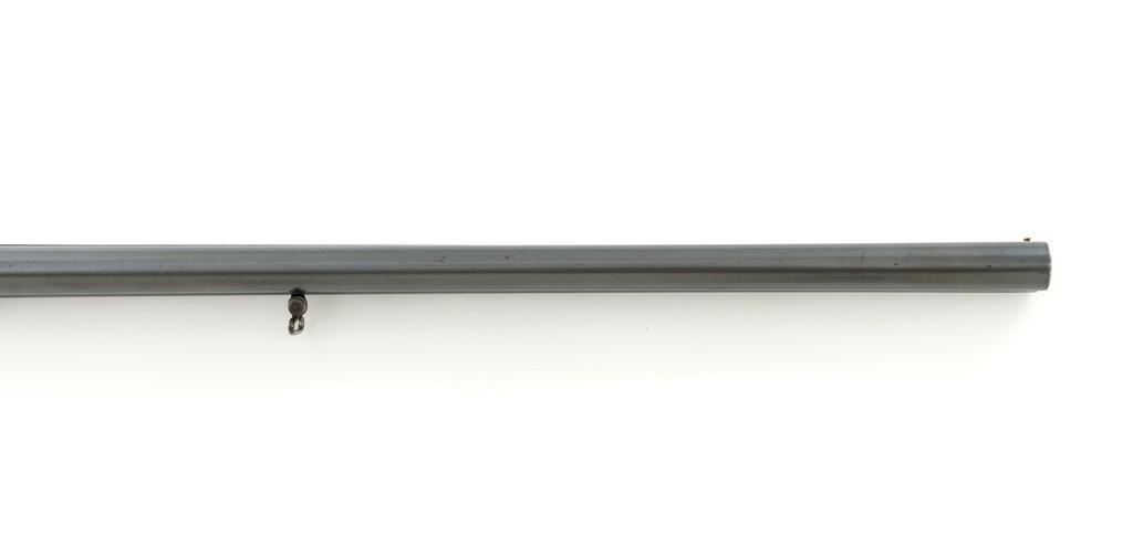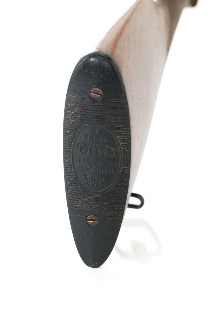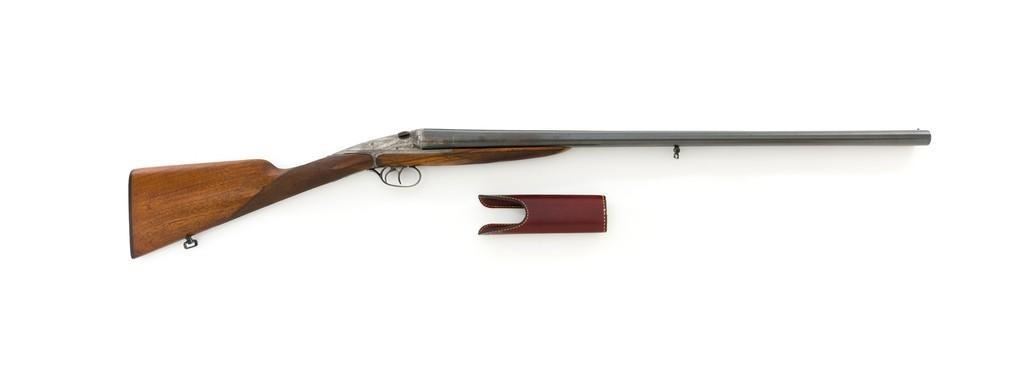 Engraved Darne Model R11 Sliding Breech Side-by-Side Shotgun, #A589, 12 ga., 27'' barrels with concave solid rib, chambers are stamped ''65'' for 2-1/2'' but measure a little over 2-3/4'', bores gauge to Cyl/Full, with brass bead front sight. Barrels are blued; coin finished trigger guard and sliding breech with extensive floral scroll and border engraving. Shotgun also features double triggers, rotating safety lever, extractors, and all matching serial numbers. Checkered straight grip walnut stock with grooved black plastic Darne buttplate. Stock dimensions are 14-3/8'' x 1-7/8'' x 2-3/8''. Top of the lever is marked ''Darne''. Includes a slip on leather handguard. Condition is good, retaining approx. 90% toning blue, showing spots of mild frosting, thinning and patina. There are intermittent spots of light rust visible in the protected areas where the barrel rib meets the barrel. Bright metal surfaces with moderate brown patina at rear of the breech and trigger guard; engraving is crisp. Wood was sanded and refinished, with a chip missing and small crack from behind the upper tang, fine crack and long impression to left side of the wrist. Checkering shows moderate wear. Action is a little sticky at times but functions properly and locks up tight. Bores are smoky and pitted. Est.: $1,200-$1,600. (C&R/PPT)