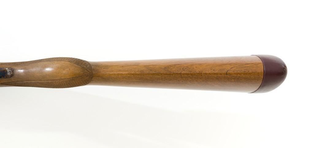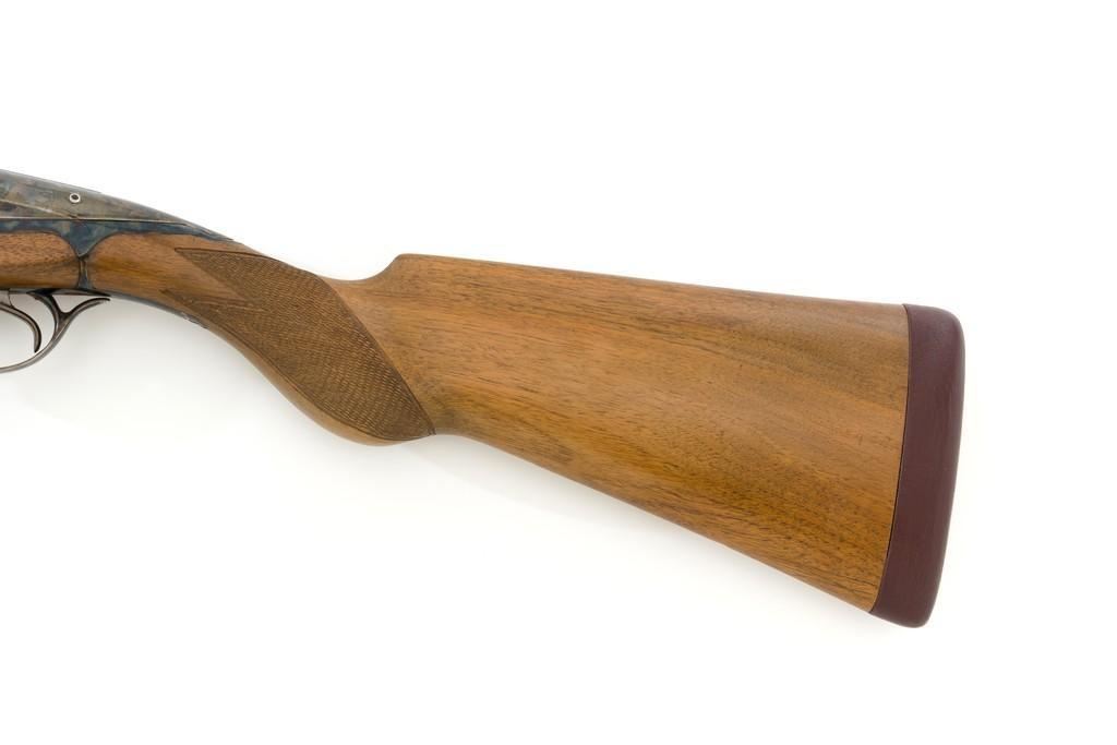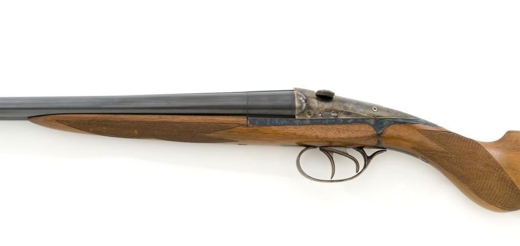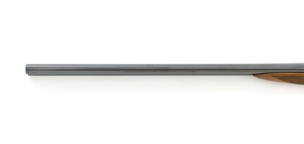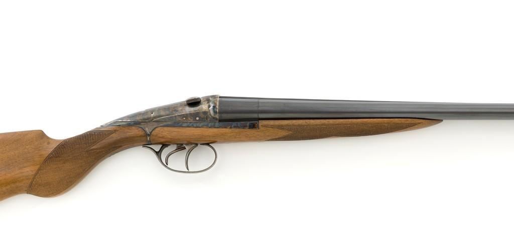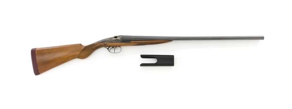 Darne Model R10 Sliding Breech Side-by-Side Shotgun, #SPC795, 20 ga., 25.5'' barrels with solid rib, 2-3/4'' chambers, fixed Cylinder bores, with brass bead front sight. Barrels are blued; trigger guard and sliding breech action are case colored and has double triggers, rotating safety lever and all matching serial numbers. Checkered semi-pistol grip walnut stock with round knob and added solid brown recoil pad. Stock dimensions are 14-7/8'' x 1-5/8'' x 3''. Top of the lever is marked ''Darne''; barrel rib ''MADE IN FRANCE''. Includes a slip on leather handguard. Condition is near excellent, retaining approx. 95% blue; majority of the case colors remain and are vibrant, except for the breech that shows moderate toning and muting. Wood has been refinished with a repair visible at the toe, now with intermittent light handling marks. Checkering detail is primarily crisp, with a few small marks to left side of the forend. Recoil pad is soft and pliable. Action is tight and functions smoothly. Bores are bright throughout. Est.: $1,600-$2,200. (C&R/PPT)