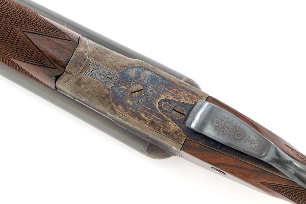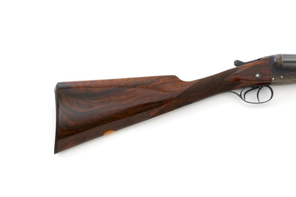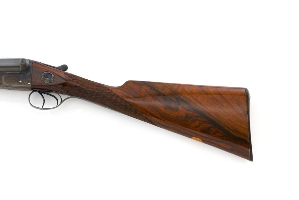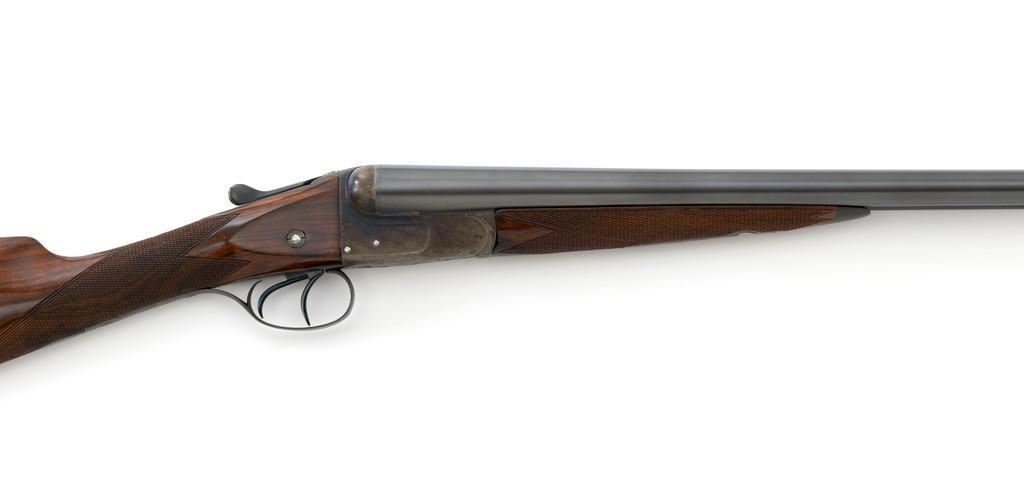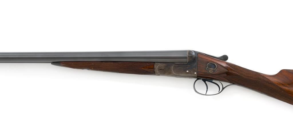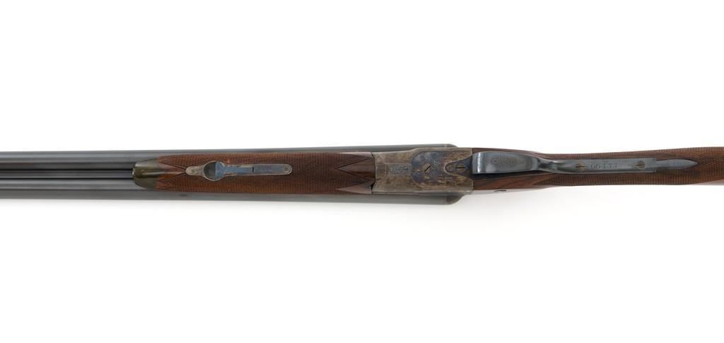 W.W. Greener Facile Princeps Hammerless Grade F.H. 50, Side-by-Side Shotgun, #66455. 20 ga., 28'' matted rib barrels have 2-9/16'' chambers and are choked IC/FULL. The rib is marked ''W.W. Greener, Maker. 29 Pall Mal. London S.W.'' The action utilizes two underlugs plus a greener crossbolt lockup, and features double triggers, non-automatic external safety, and selective ejectors. The receiver, forend iron and top tang are case hardened, trigger guard and bottom tang are blued. The receiver is engraved with very fine rose and scroll designs. Lower tang is marked ''Grade F.H. 50''. The splinter forend and straight grip buttstock are highly-finished ''C'' grade walnut, and feature a bone forend tip, brass oval for later engraving, and a composite checkered buttplate. Stock dimensions are 14'' x 1-3/8'' x 2''. Mfg'd prior to 1927.Condition is overall fine. Barrels have been professionally refinished and retain approx. 98% blue; 50% original case colors. Wood with few handling marks, retaining nearly all the gloss finish, but there is a slight .75'' crack on the left hand side; from receiver to safe switch. The action is likewise in very good condition, closing tight and usually ejecting the shells; bores are mirror bright. There is an occasional malfunction of the right hand ejector and can be correctly repaired by a qualified gunsmith. Est.: $3,500-$4,500. (C&R/PPT)