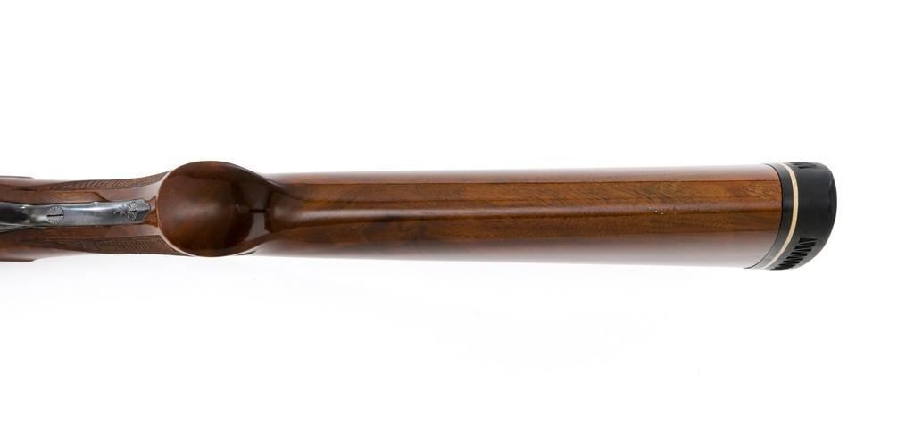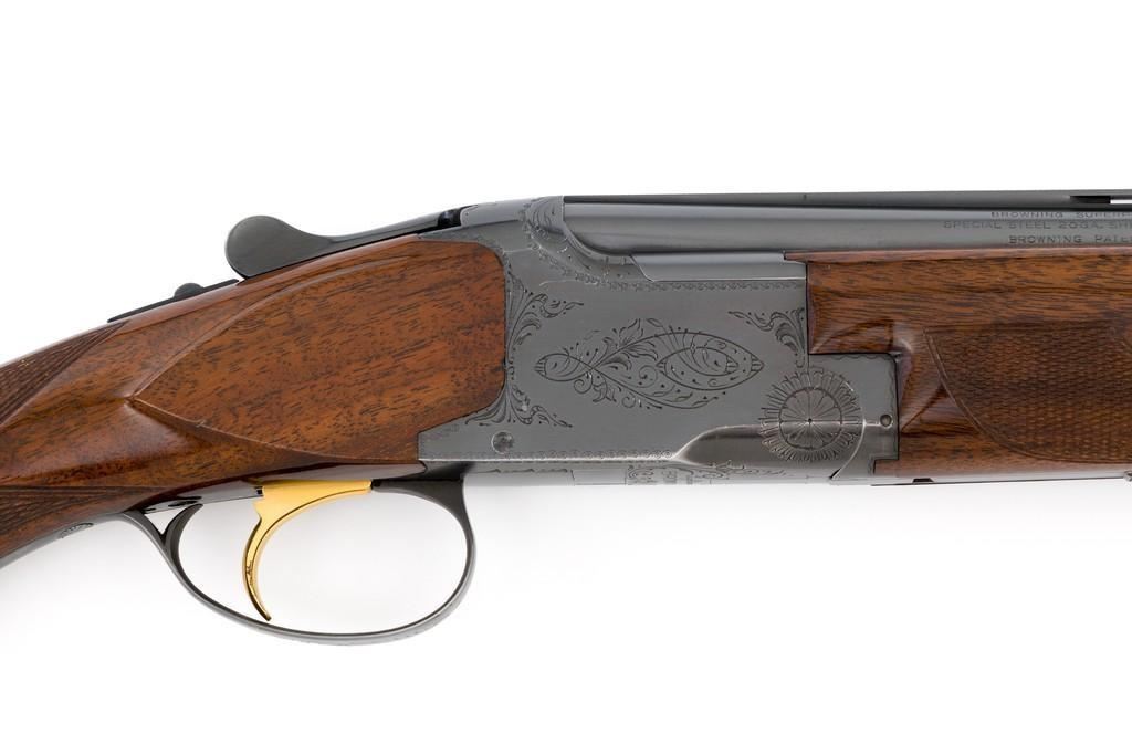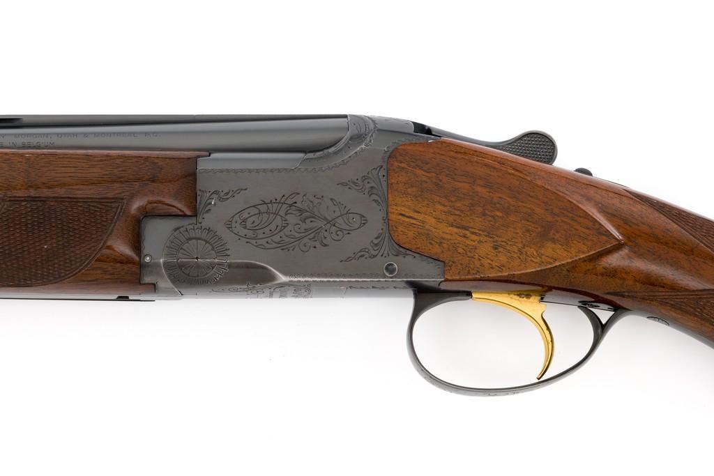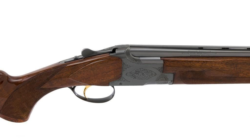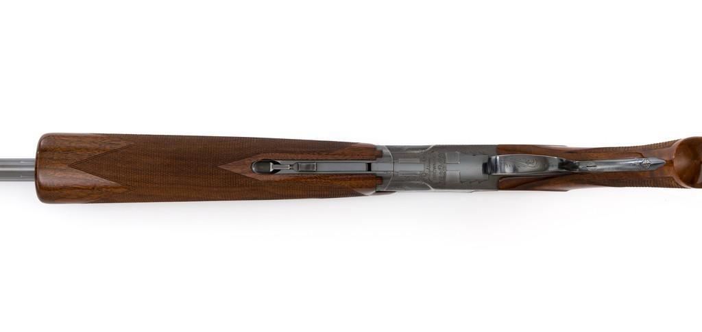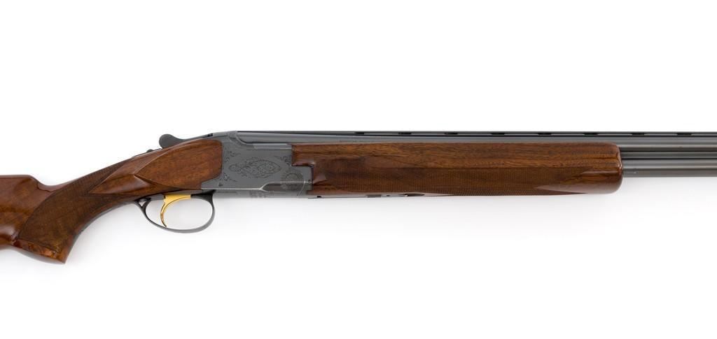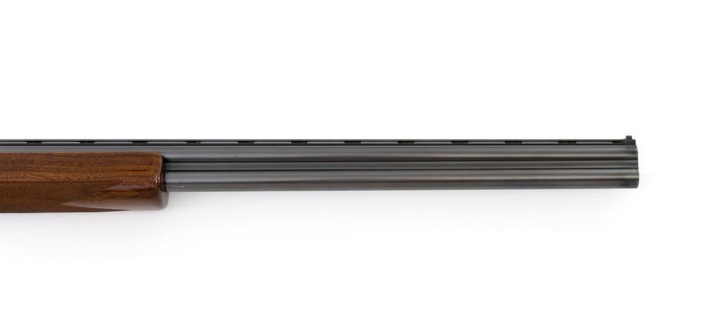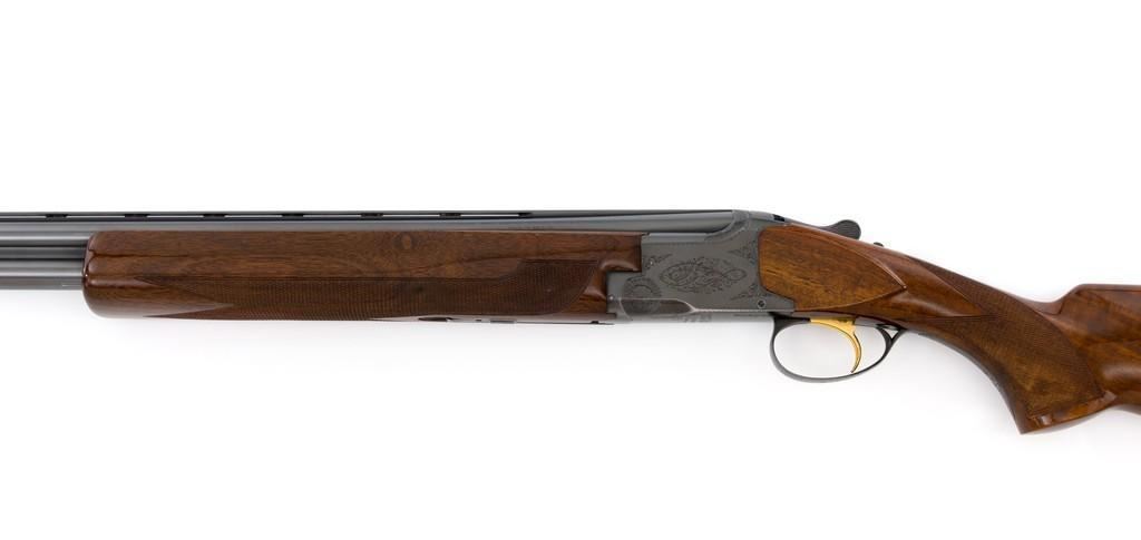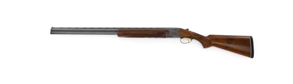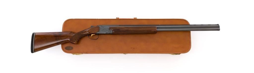 Browning Superposed Grade 1 Lightning Over/Under Shotgun, #4445V73, 20 ga., 28'' vent rib special steel barrels have target beads, 2-3/4'' chambers, and are choked SKT/SKT. The action uses a single underlug as lockup, and features a single selective mechanical trigger, non-automatic safety, and selective ejectors. The blued receiver is nicely engraved with Browning scrolls. The beavertail forend with finger grooves and flat knob long tang buttstock are high gloss ''B'' grade European walnut with hand checkering at 20 LPI, no grip cap, and a Pachmayr ''White Line'' skeet recoil pad. Stock dimensions are 14-1/8'' x 1-3/4'' x 2''. Gun was made in 1973 by FN in Belgium for Browning. Gun is contained in an early fitted Browning tan Naugahyde case, with keys. Condition is near excellent for a 50-year-old target gun. The wood shows only a few minor handling marks, and presents a strong longitudinal grain, there are no splits or chips present, checkering shows very positive grips. The receiver has a small amount of edgewear at carry points and lower tang; overall approx. 95%+ factory blue remains. Despite its age the action locks up very tight and functions perfectly; the bores are mirror bright. An excellent gun for skeet or upland bird hunting. Est.: $1,800-$2,400. (C&R/PPT)