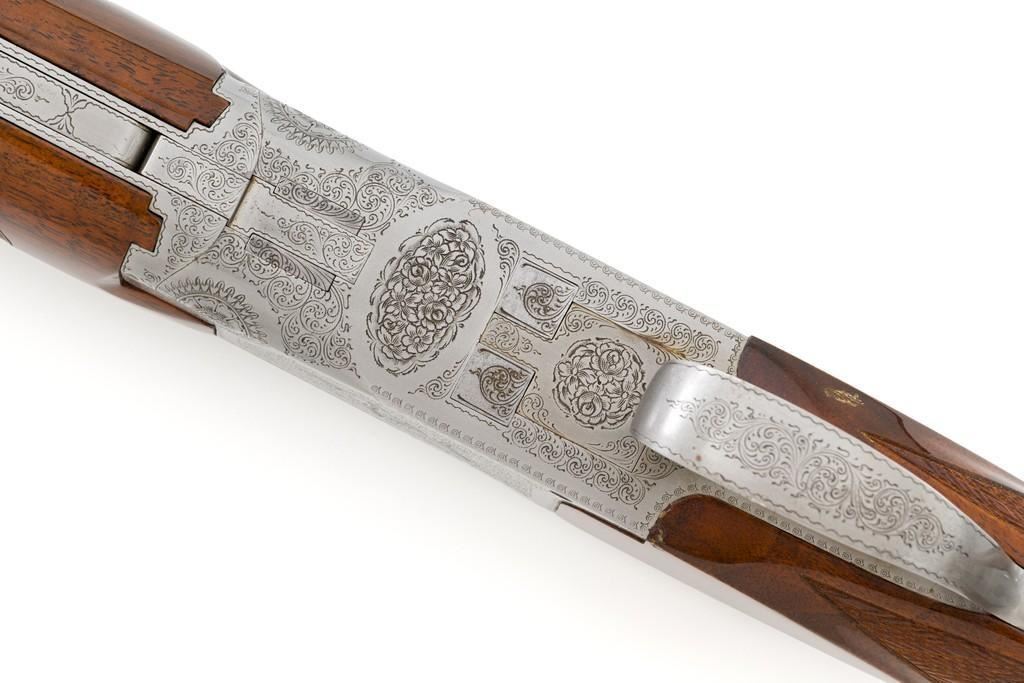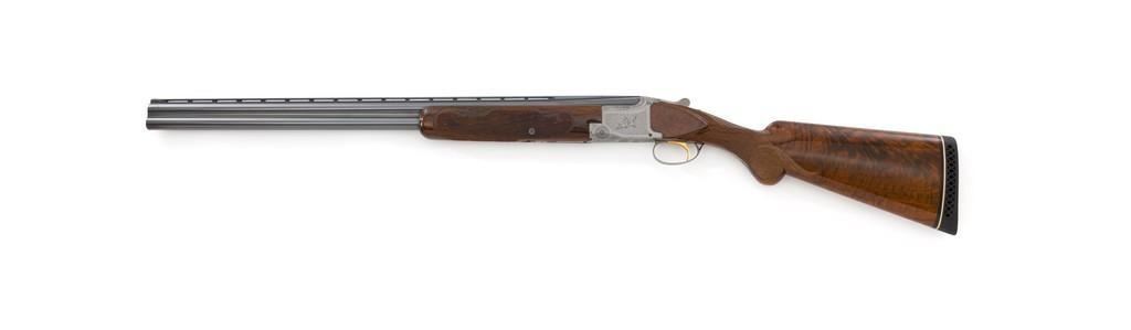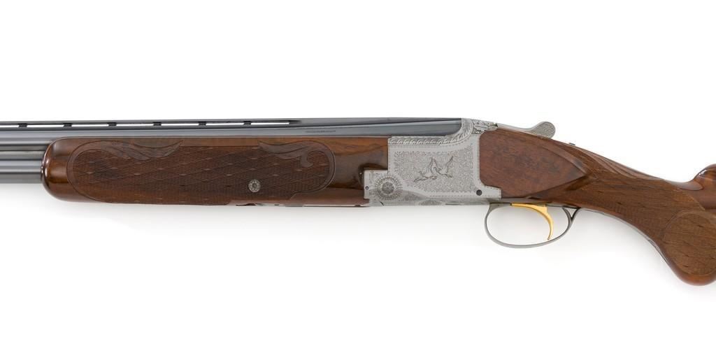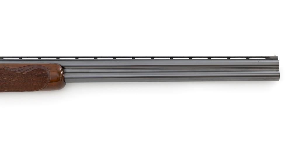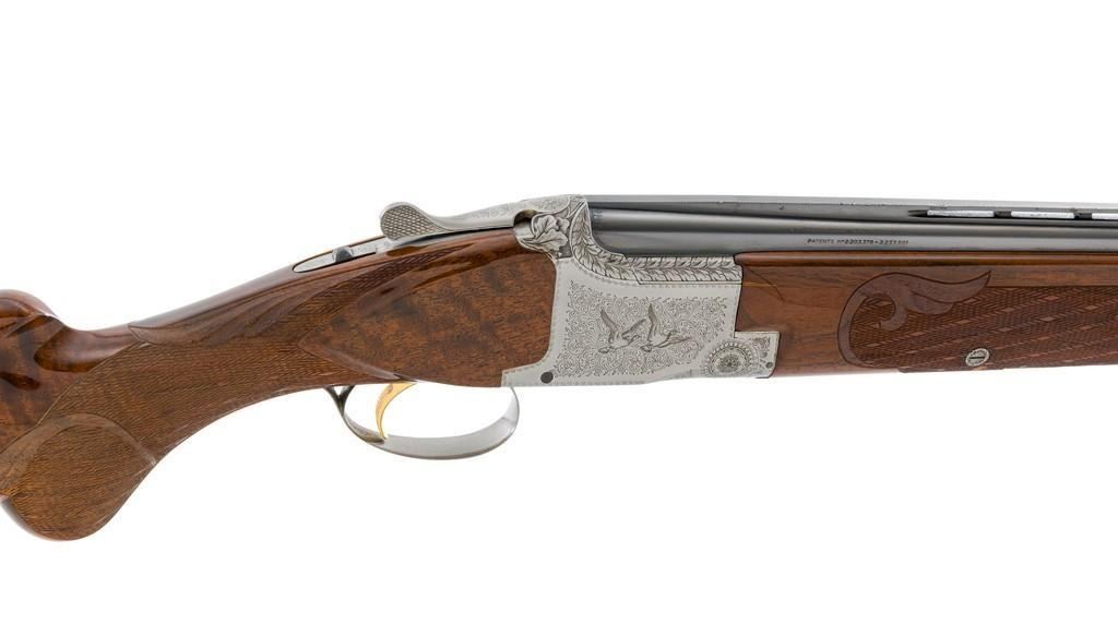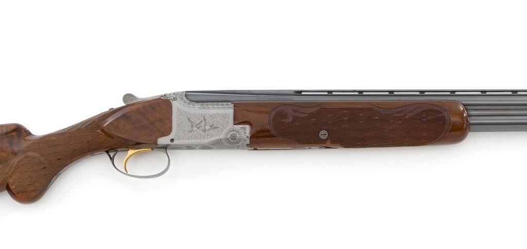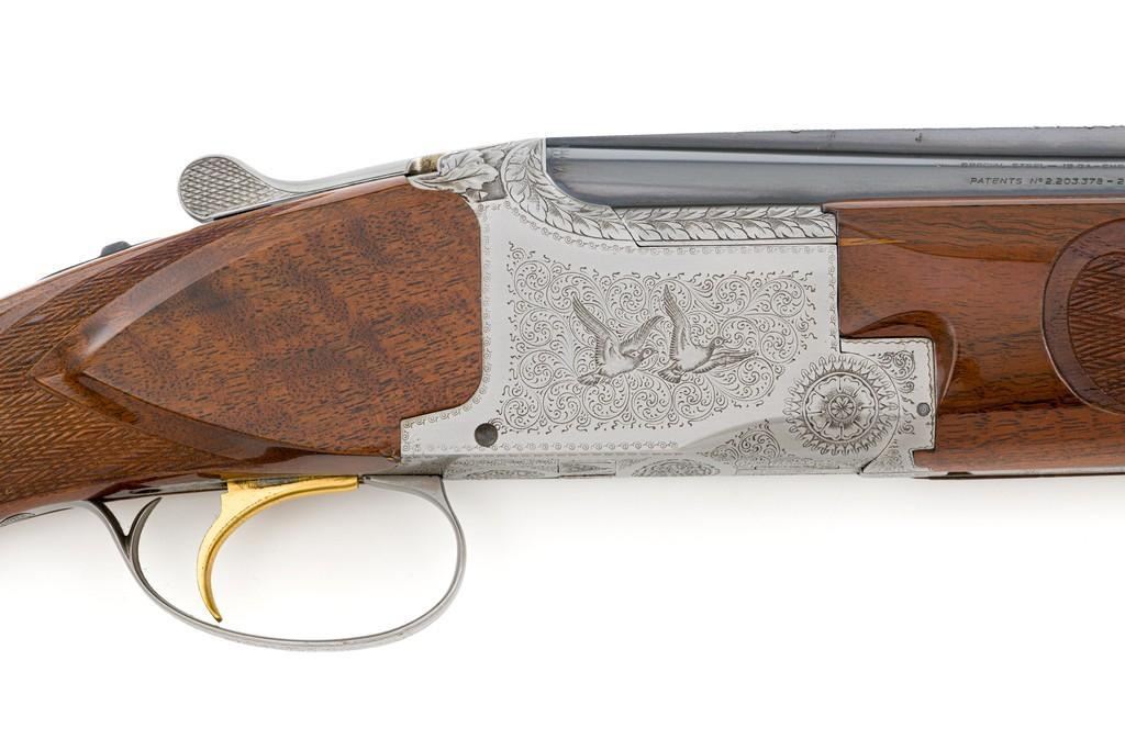 Belgian Browning Superposed Pigeon Grade Over/Under Shotgun, #55329S6, 12 ga., 28'' barrels have a ventilated rib with silver bead front sight, 2-3/4'' chambers, and are choked Mod/Full. The superposed action has underlug lockup, single selective inertia trigger, non-automatic safety, and selective ejectors. Engraved French gray receiver; left and right side both feature two engraved pigeons in flight and are surrounded by extensive floral scroll engraving. Beautifully figured round knob long tang pistol grip stock are skipline checkered with hand carved detail, and vented black rubber Pachmayr recoil pad. Stock dimensions are 14-1/2'' x 1-1/2'' x 2-1/8''. Manufactured in 1966. Shotgun is in near excellent condition overall. Barrels retain approx. 96% factory blue, showing light wear to the underside of the bottom barrel, from sliding the forend forward; few tiny nicks to edge of the ventilated rib. Bottom of the receiver and trigger guard with a few dark specks and minor handling marks; lower tang shows light finish wear; factory lettering and engraving remains crisp. Forend with one more noticeable impression near the retaining screw. Otherwise, wood has only a few light handling marks, light scuffs to sides of the buttstock; no significant wear to the finish. Recoil pad is soft and pliable. Action functions very smoothly and locks up tight. Bores are bright. Est.: $2,500-$3,500. (C&R/PPT)