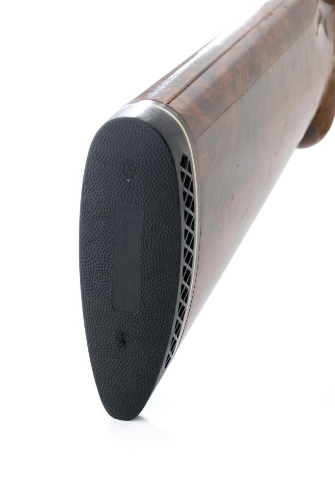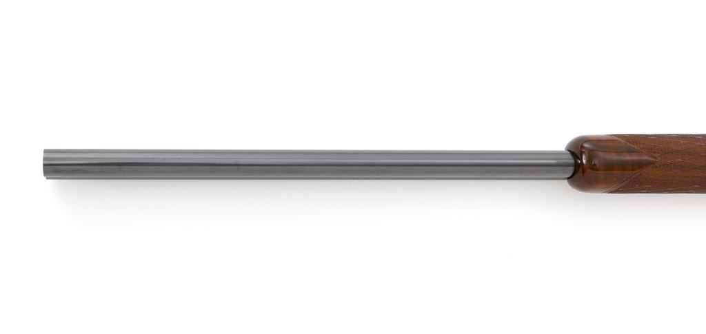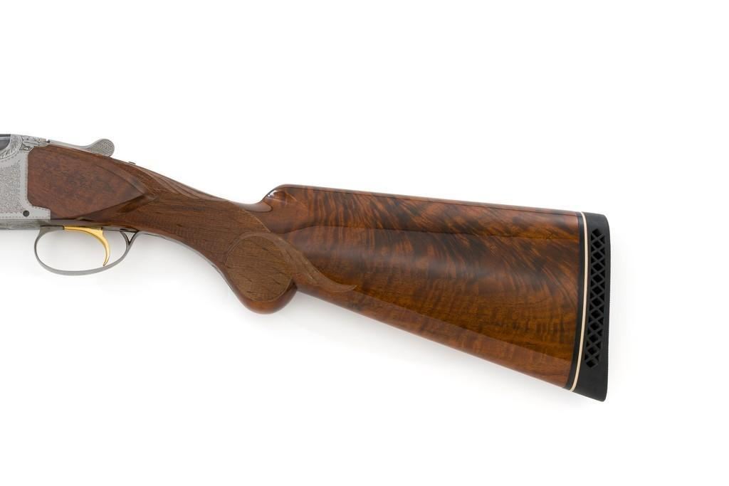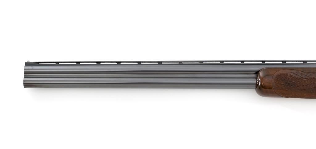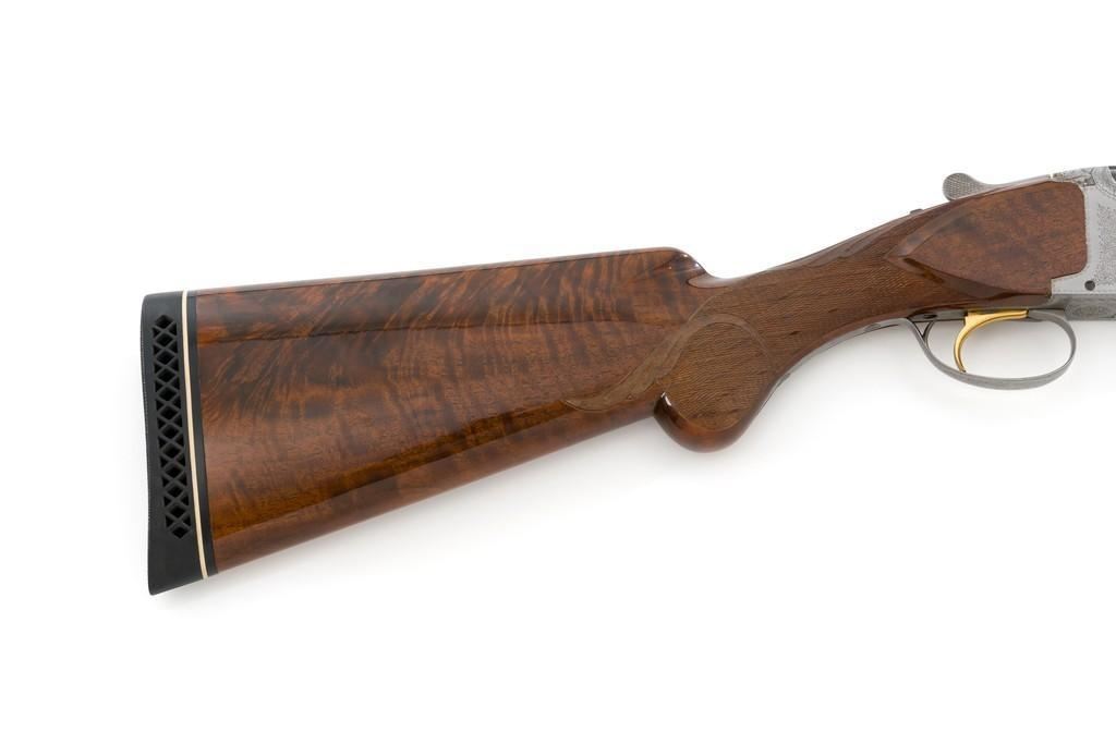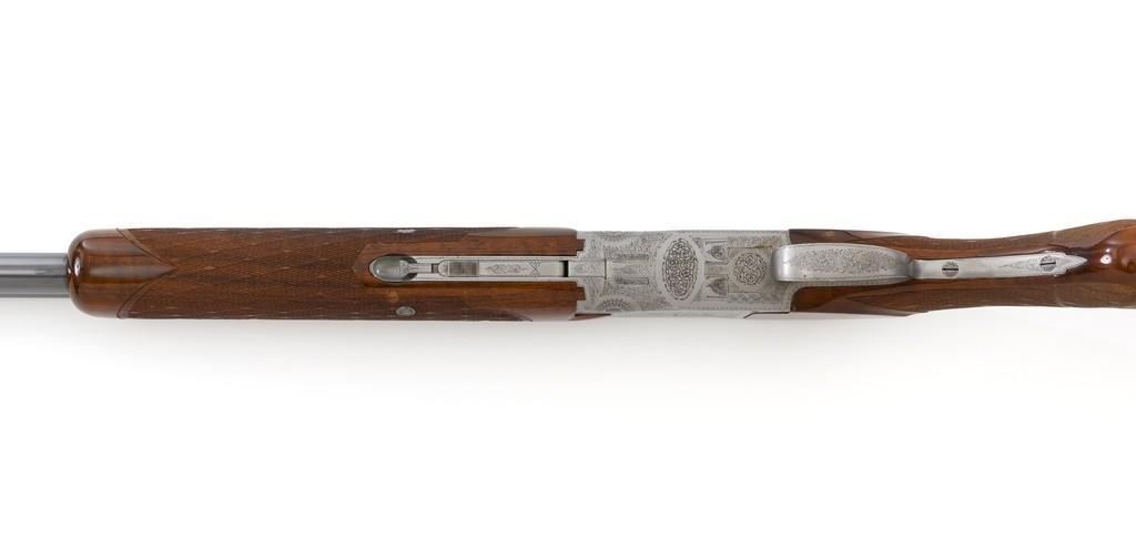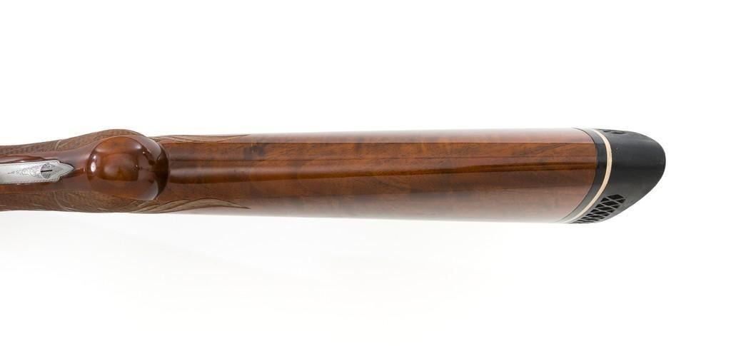 Belgian Browning Superposed Pigeon Grade Over/Under Shotgun, #55329S6, 12 ga., 28'' barrels have a ventilated rib with silver bead front sight, 2-3/4'' chambers, and are choked Mod/Full. The superposed action has underlug lockup, single selective inertia trigger, non-automatic safety, and selective ejectors. Engraved French gray receiver; left and right side both feature two engraved pigeons in flight and are surrounded by extensive floral scroll engraving. Beautifully figured round knob long tang pistol grip stock are skipline checkered with hand carved detail, and vented black rubber Pachmayr recoil pad. Stock dimensions are 14-1/2'' x 1-1/2'' x 2-1/8''. Manufactured in 1966. Shotgun is in near excellent condition overall. Barrels retain approx. 96% factory blue, showing light wear to the underside of the bottom barrel, from sliding the forend forward; few tiny nicks to edge of the ventilated rib. Bottom of the receiver and trigger guard with a few dark specks and minor handling marks; lower tang shows light finish wear; factory lettering and engraving remains crisp. Forend with one more noticeable impression near the retaining screw. Otherwise, wood has only a few light handling marks, light scuffs to sides of the buttstock; no significant wear to the finish. Recoil pad is soft and pliable. Action functions very smoothly and locks up tight. Bores are bright. Est.: $2,500-$3,500. (C&R/PPT)