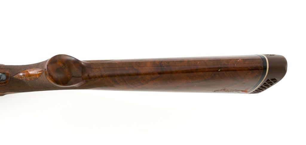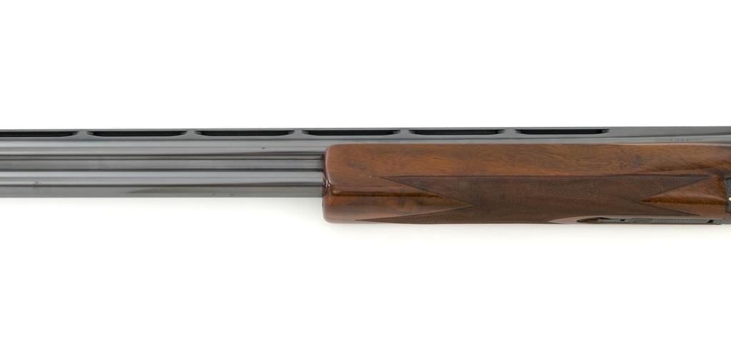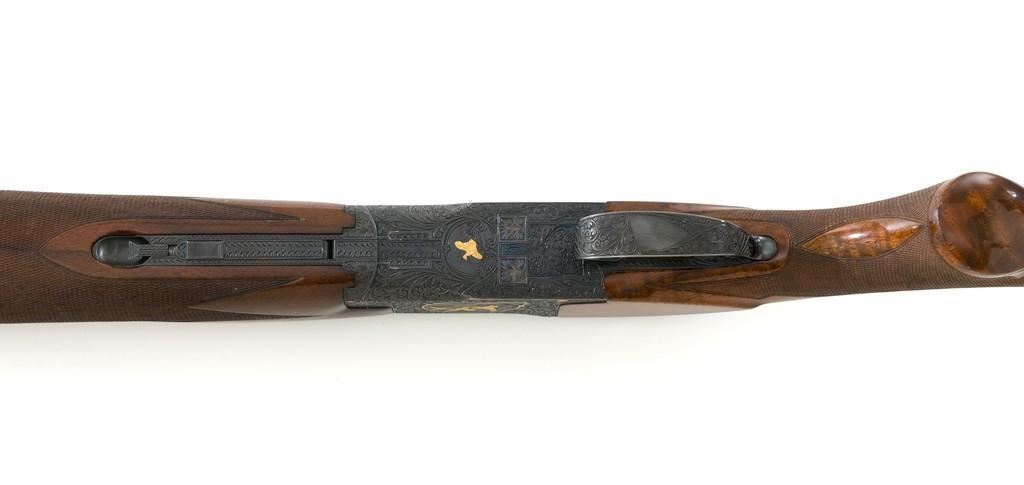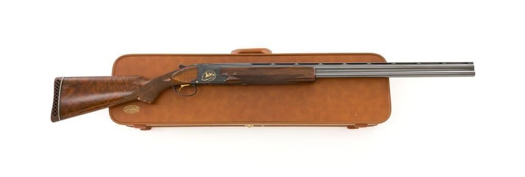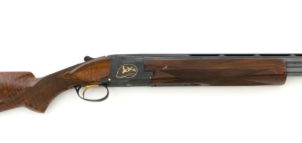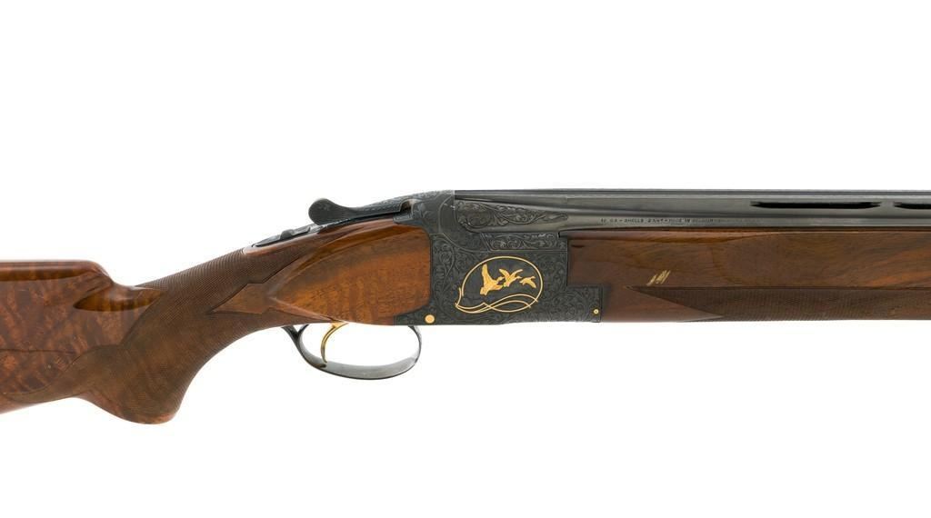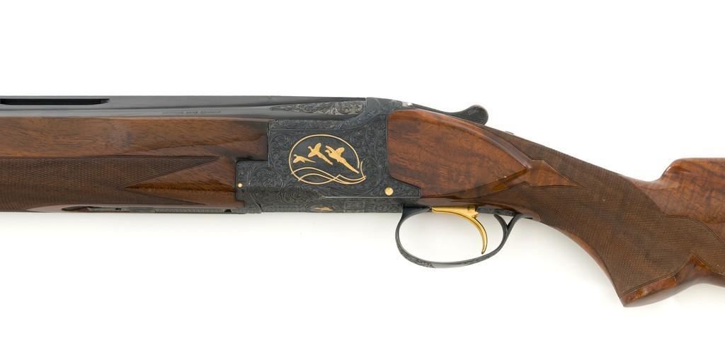 Beautiful Master Engraved Belgian Browning ''Broadway Trap'' Midas Grade Over/Under Shotgun, Signed M. Magis, #6836S69. 12 ga., 32'' barrels have a wide 5/8'' trap vent rib, target beads, 2-3/4'' chambers, and chokes measuring IM/Full. The action is typical Browning superposed, with a large single underlug for lockup, single selective inertial trigger, and selective ejectors. The blued receiver has deep relief scroll engraving, with gold inlaid ducks and pheasants on frame sides and a quail on the bottom; plus, gold ovals containing the rising birds. All engraving, including surrounding scroll work, done by M. Magis of FN in Belgium; signed on left side of the receiver. The finger groove beavertail forend and flat knob pistol grip buttstock are of high gloss presentation grade walnut, with elaborate checkering done at 24 LPI and a Browning ''White Line'' trap recoil pad attached. Stock dimensions are 14-1/2'' x 1-3/8'' x 1-5/8''. Mfg'd in 1969 by FN in Belgium for Browning. Condition is near excellent, showing light use, retaining approx. 97%-98% factory blue, with a few marks and spots of wear along the edge of the barrel rib. Engraving and gold inlay are beautifully done and remain sharp. Wood rates fine with outstanding figure to the buttstock, which has a few shallow dents and scratches, primarily on the left side. Right side of the forend also has one more noticeable mar to the wood. The action functions smoothly and does close very tight, however with little wear to the standing breech face and correct function of the operation process. Bores are mirror bright. Est.: $5,000- $7,000. (C&R/PPT)