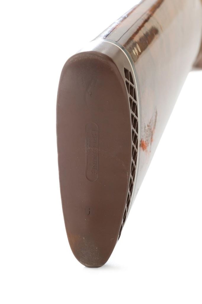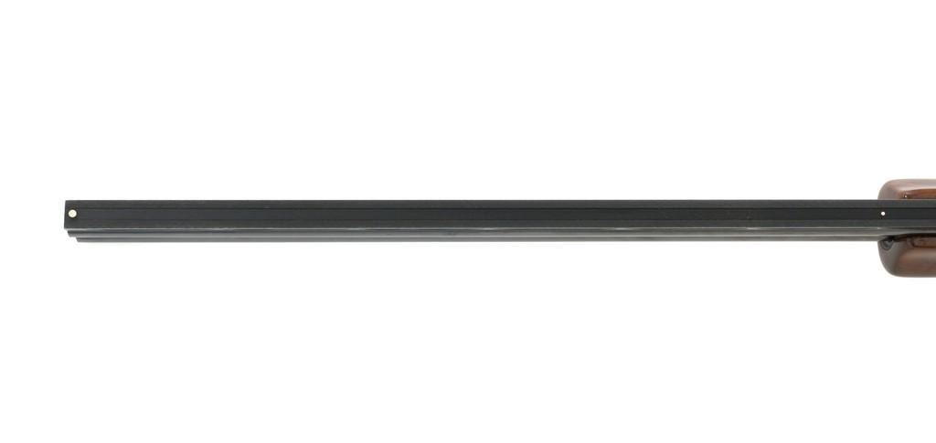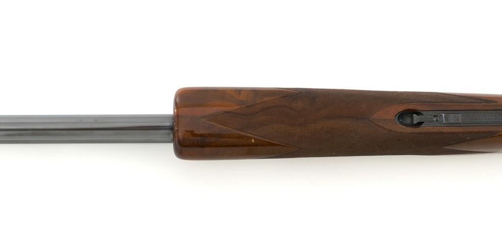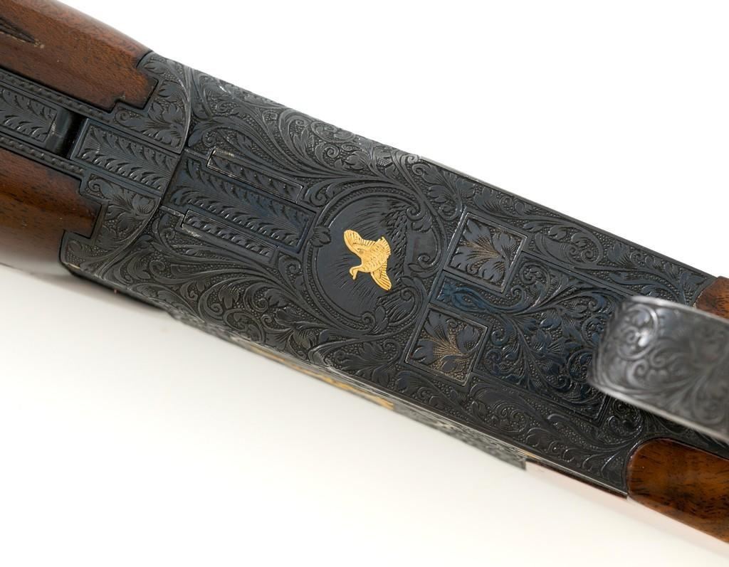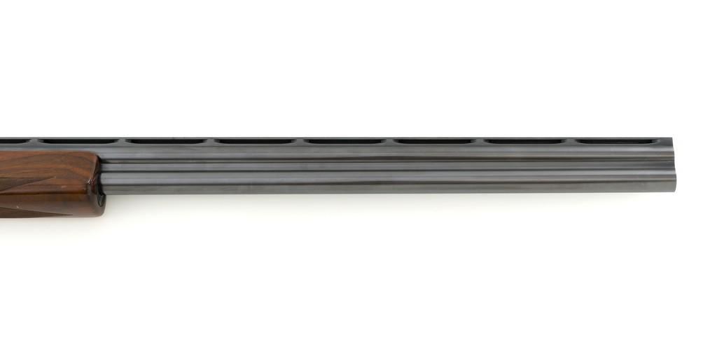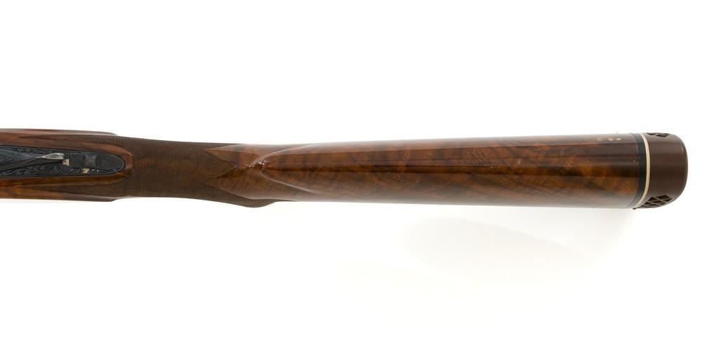 Beautiful Master Engraved Belgian Browning ''Broadway Trap'' Midas Grade Over/Under Shotgun, Signed M. Magis, #6836S69. 12 ga., 32'' barrels have a wide 5/8'' trap vent rib, target beads, 2-3/4'' chambers, and chokes measuring IM/Full. The action is typical Browning superposed, with a large single underlug for lockup, single selective inertial trigger, and selective ejectors. The blued receiver has deep relief scroll engraving, with gold inlaid ducks and pheasants on frame sides and a quail on the bottom; plus, gold ovals containing the rising birds. All engraving, including surrounding scroll work, done by M. Magis of FN in Belgium; signed on left side of the receiver. The finger groove beavertail forend and flat knob pistol grip buttstock are of high gloss presentation grade walnut, with elaborate checkering done at 24 LPI and a Browning ''White Line'' trap recoil pad attached. Stock dimensions are 14-1/2'' x 1-3/8'' x 1-5/8''. Mfg'd in 1969 by FN in Belgium for Browning. Condition is near excellent, showing light use, retaining approx. 97%-98% factory blue, with a few marks and spots of wear along the edge of the barrel rib. Engraving and gold inlay are beautifully done and remain sharp. Wood rates fine with outstanding figure to the buttstock, which has a few shallow dents and scratches, primarily on the left side. Right side of the forend also has one more noticeable mar to the wood. The action functions smoothly and does close very tight, however with little wear to the standing breech face and correct function of the operation process. Bores are mirror bright. Est.: $5,000- $7,000. (C&R/PPT)