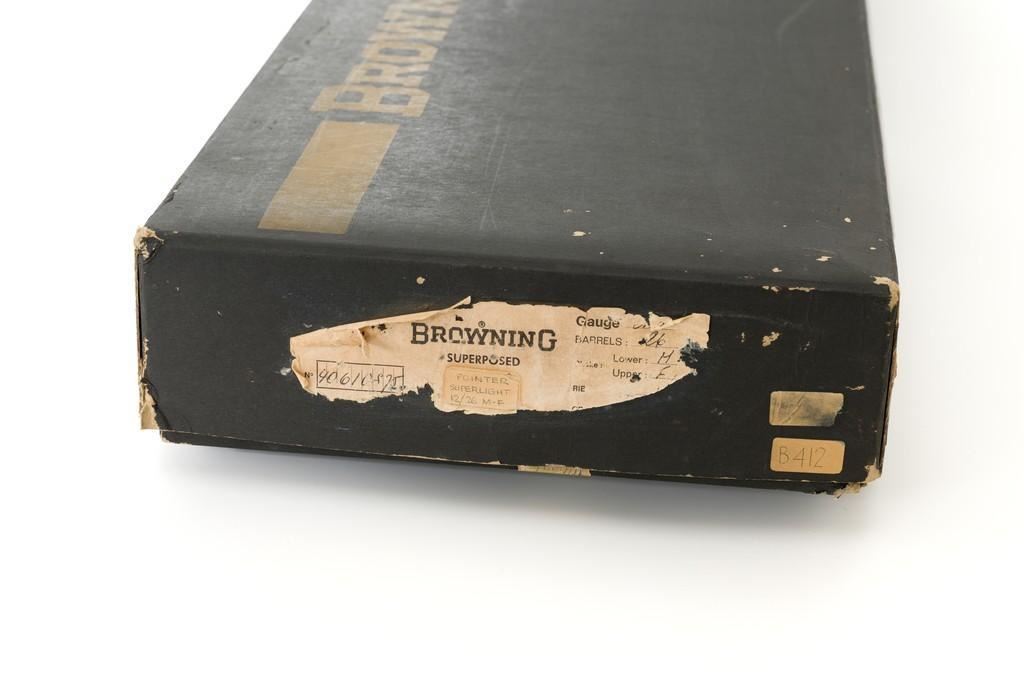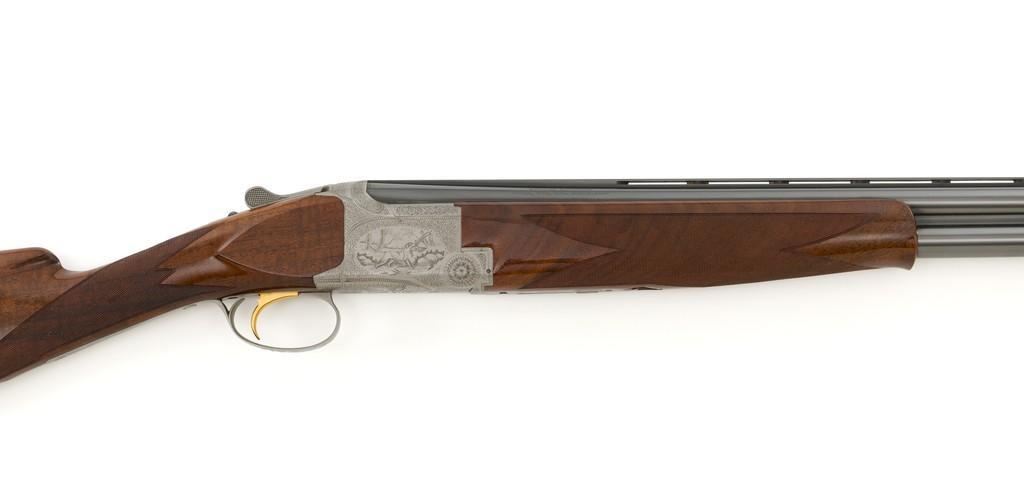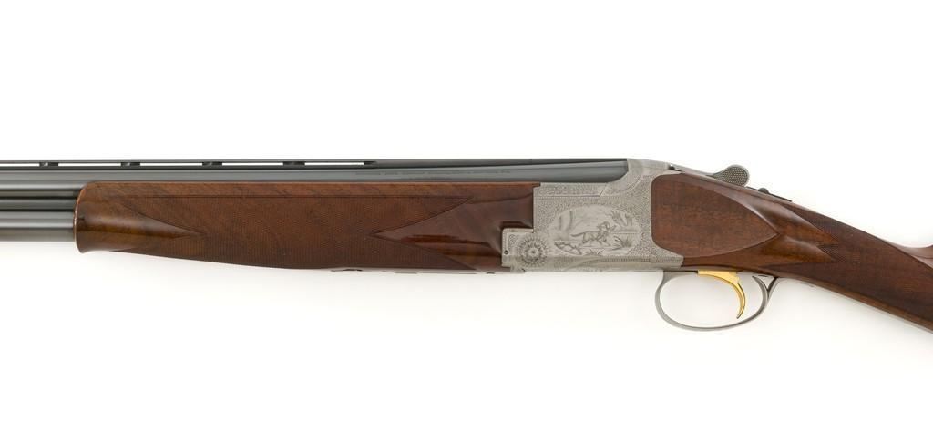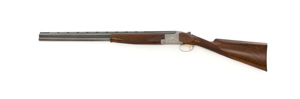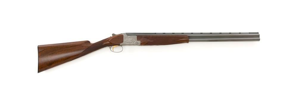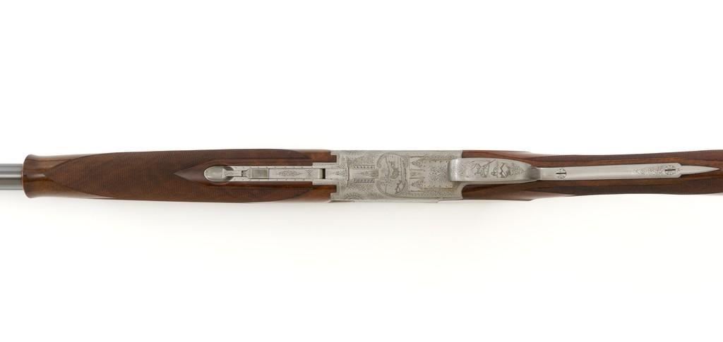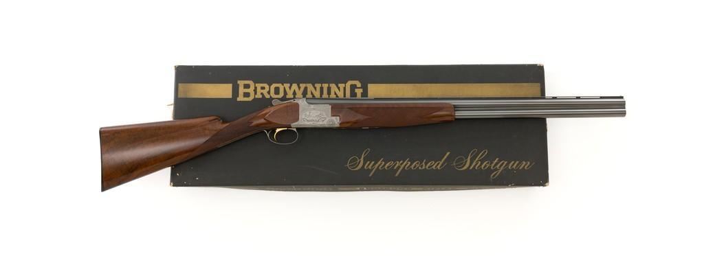 L. Ernst Engraved Browning Superposed Pointer Grade Super-Light Over/Under Shotgun, #40610S75. 12 ga., 26-1/2'' vent rib barrels have 2-3/4'' chambers and are choked MOD/FULL. The Browning boxlock action uses a single underlug lockup, and features a single selective mechanical trigger, non-automatic safety, and selective ejectors. The receiver is finished in silver gray, and features a setter on the left side, pointer on the right, and partridge on the bottom; the game scenes are surrounded by rose and scroll engraving, a pheasant on the trigger guard, and other misc. engraving done on the top and bottom tangs plus forend iron. All engraving done by FN engraver L. Ernst, The slender forend with a Schnabel nosepiece and the straight grip buttstock are of high-gloss ''C'' grade European walnut, and feature hand checkering at 22 LPI and an original Browning black buttplate. Stock dimensions are 14-1/2'' x 1-1/2'' x 2-3/8''. Gun is contained in the original box, with owner's manual. Made by FN in Belgium for Browning in 1975. Condition is excellent, appearing like new, showing almost no handling marks to wood and virtually no wear to the action, which is not broken in but closes very tight and functions correctly; bores are mirror bright. In truly pristine condition for a 50 year old gun. Est.: $8,000-$12,000. (C&R/PPT)