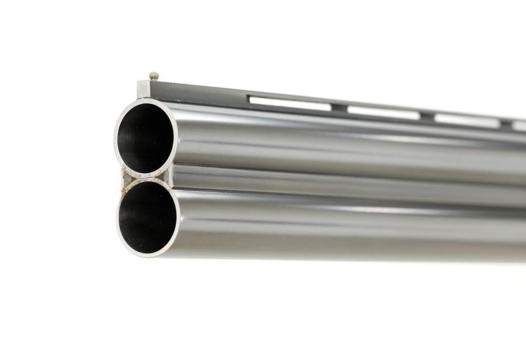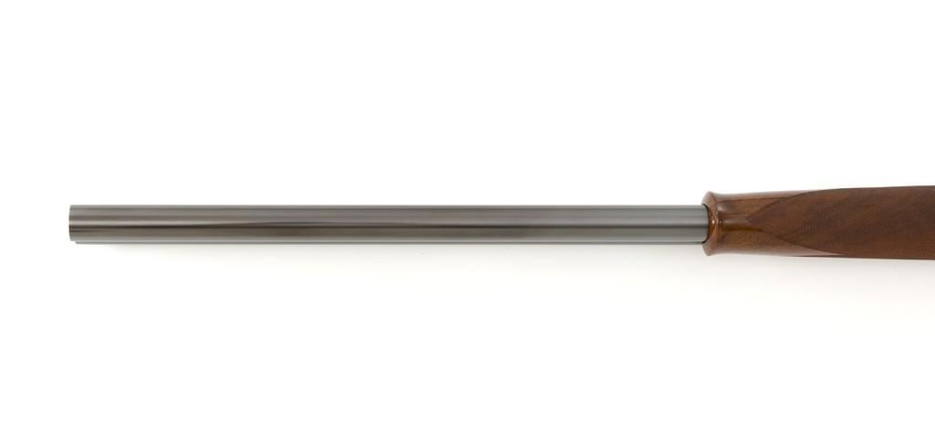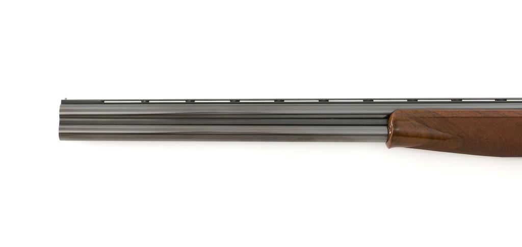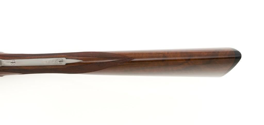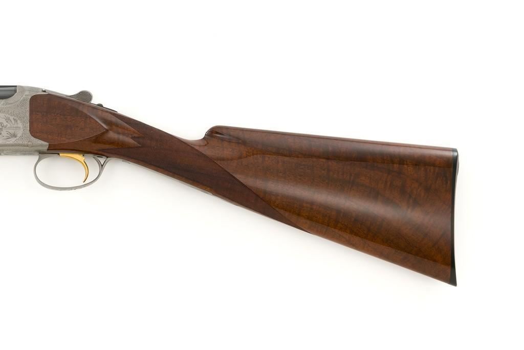L. Ernst Engraved Browning Superposed Pointer Grade Super-Light Over/Under Shotgun, #40610S75. 12 ga., 26-1/2'' vent rib barrels have 2-3/4'' chambers and are choked MOD/FULL. The Browning boxlock action uses a single underlug lockup, and features a single selective mechanical trigger, non-automatic safety, and selective ejectors. The receiver is finished in silver gray, and features a setter on the left side, pointer on the right, and partridge on the bottom; the game scenes are surrounded by rose and scroll engraving, a pheasant on the trigger guard, and other misc. engraving done on the top and bottom tangs plus forend iron. All engraving done by FN engraver L. Ernst, The slender forend with a Schnabel nosepiece and the straight grip buttstock are of high-gloss ''C'' grade European walnut, and feature hand checkering at 22 LPI and an original Browning black buttplate. Stock dimensions are 14-1/2'' x 1-1/2'' x 2-3/8''. Gun is contained in the original box, with owner's manual. Made by FN in Belgium for Browning in 1975. Condition is excellent, appearing like new, showing almost no handling marks to wood and virtually no wear to the action, which is not broken in but closes very tight and functions correctly; bores are mirror bright. In truly pristine condition for a 50 year old gun. Est.: $8,000-$12,000. (C&R/PPT)