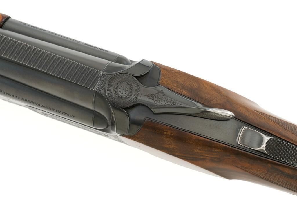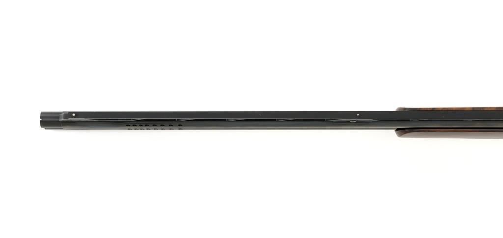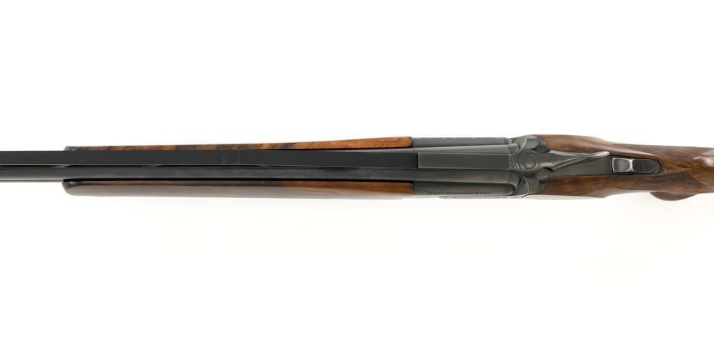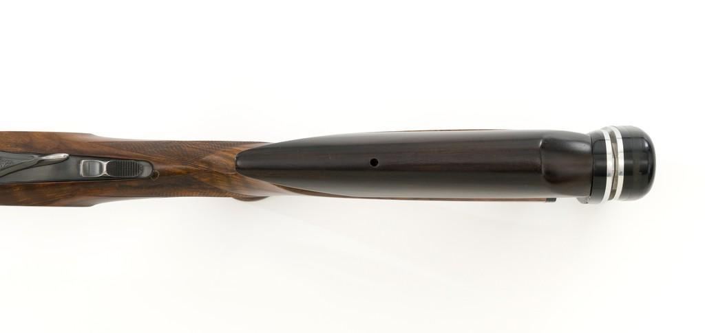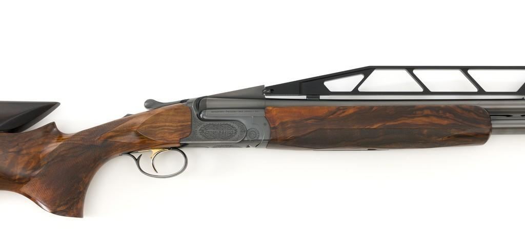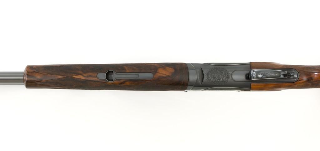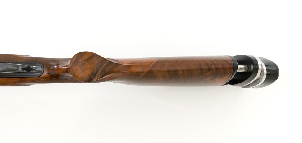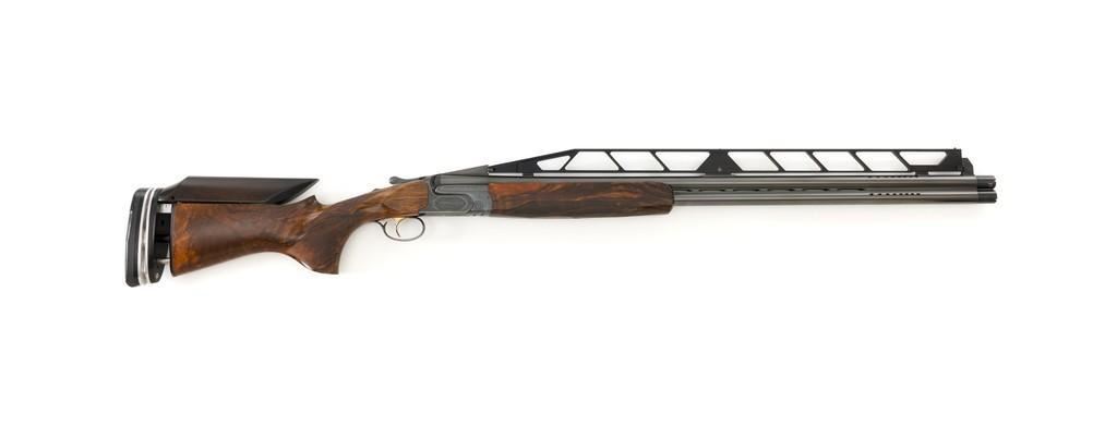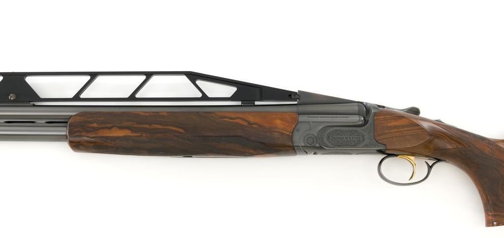 Perazzi MX 2008 Over/Under Shotgun Set for Target Competition, #145222. 12 ga., 29-1/2'' barrels utilize very high vent ribs with correspondingly high buttstock dimensions. The 3-1/2'' chambers accommodate the heaviest of loads, and the seven Briley choke tubes are sized from CYL to XFULL. There is also an extra set of 29-1/2'' barrels that comes complete with 28 ga. and .410 bore Briley sub-gauge tubes for skeet targets; making small bores more interesting. The highest point on the vent rib is 2'' above the top barrel center line, and the buttstock comb is likewise adjusted up. The action lockup is one large underlug, and the other features include a single selective trigger, adjustable comb, removable trigger group, non-automatic safety, and selective ejectors. The receiver features descriptive engraving. The full forend and pistol grip buttstock are of presentation grade walnut, and feature checkering at 24 LPI, and a fully adjustable comb and recoil pad. Stock dimensions will vary with the owners dimensions. Gun was built at Perazzi in Italy in 2010. Shotgun, barrels, and shot tubes are all contained in a new Perazzi hard case that includes the main gun, both pairs of barrels, four small bore tubes, choke tubes, lube, tools, and Perazzi paperwork. The condition of the gun and accessories is near excellent, retaining approx. 97% factory blue, with light edge wear to the trigger guard. There is a very fine 3/4'' horizontal crack on bottom of the wrist that runs from the lower tang diagonally into the checkering pattern, which does not appear to affect the integrity of the buttstock. Additionally, there was also a small chip below the upper tang that was repaired. Otherwise, the highly figured wood shows only typical intermittent light handling marks. Action is extremely smooth and locks up securely. Bores are mirror bright. Est.: $8,000- $12,000. (Modern/PPT)