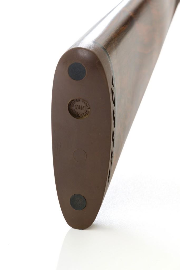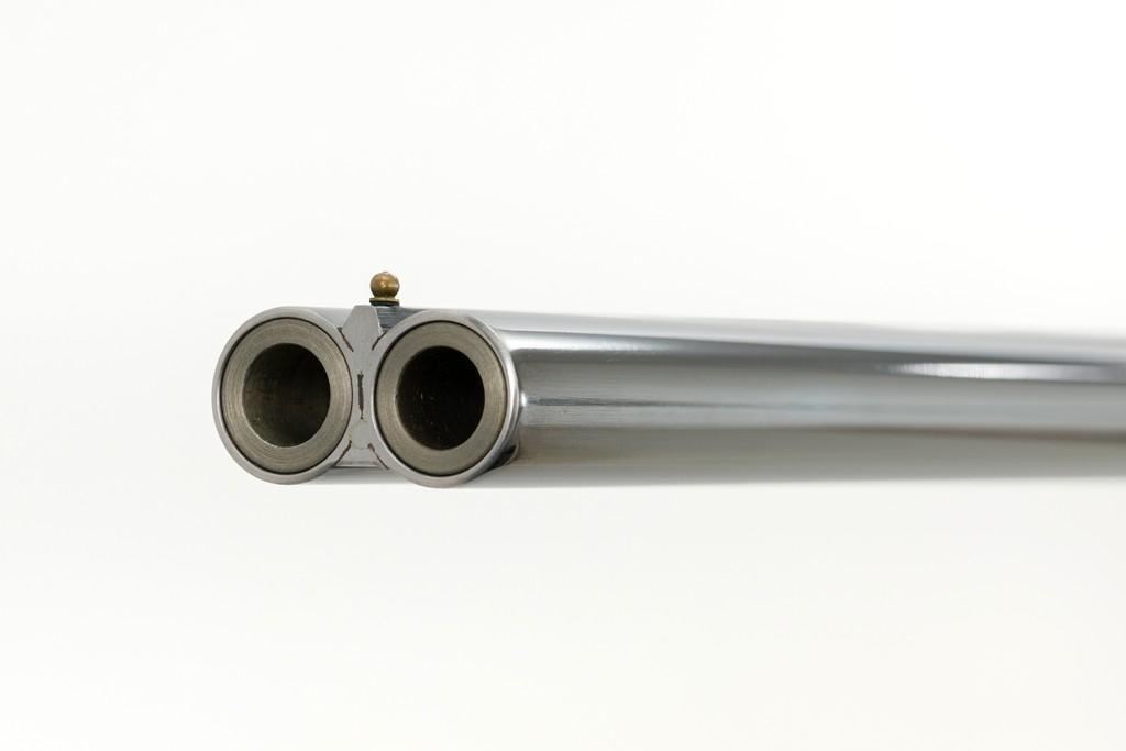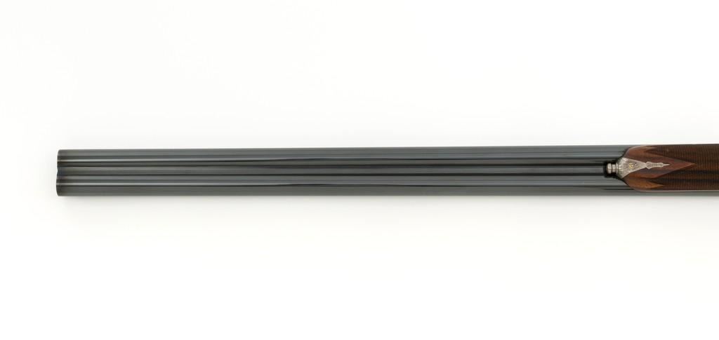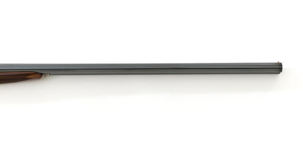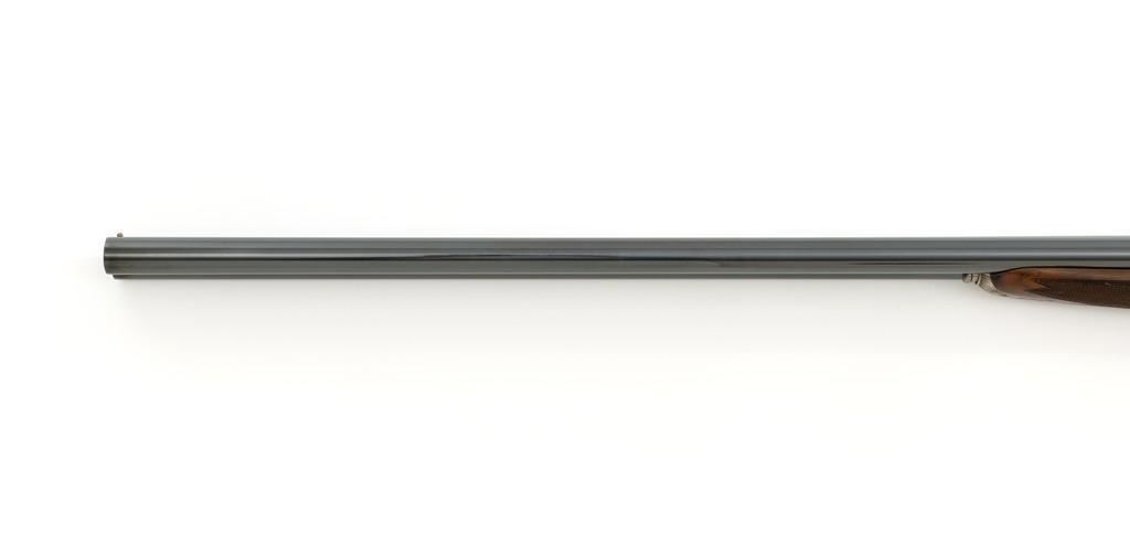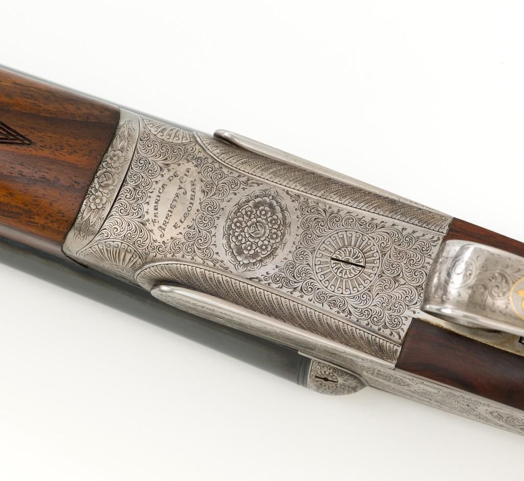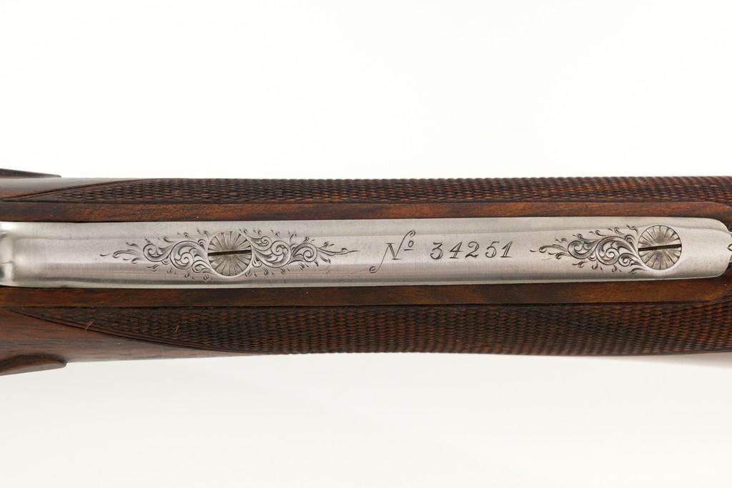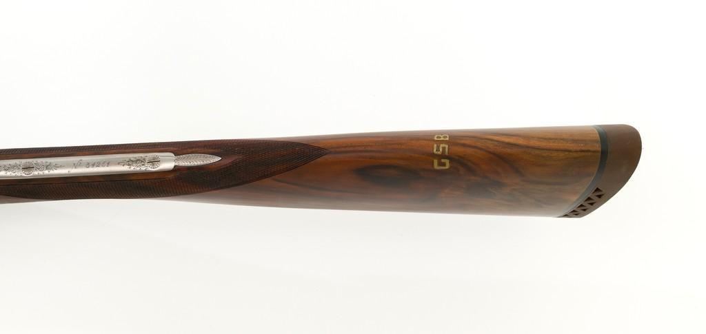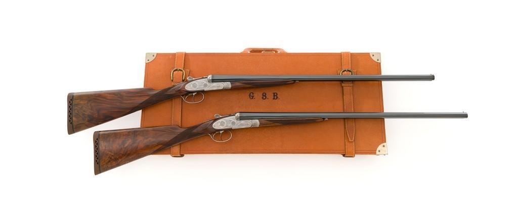 Beautiful Cased Matching Set of Consecutively Numbered Engraved Arrieta Model 803 Sidelock Side-by-Side Shotguns, #34251/34252, 20 gauge frame and barrels, both are in the same configuration and feature 27'' blued barrels with solid rib, 2-3/4'' chambers, fixed IC/Mod chokes and brass bead front sight; one with .410 barrel insert and the other 28 gauge. Self-opening action with hand detachable sidelock, double triggers, auto-ejectors, and non-automatic safety. Coin finished receiver and trigger guard with elaborate Purdey-style engraving of fine rose and scroll patterns; trigger guard with gold inlaid Arrieta y Cia. signature fleur-de-lis; each lever is numbered in gold ''1'' or ''2'' respectively. Nicely figured straight grip walnut stock and forend with multi-point hand checkering; stock with raised teardrop shaped drop points, small ''GSB'' inlaid into the bottom edge, and vented brown rubber recoil pad; splinter forend with engraved iron, numbered in gold either ''1'' or ''2'', with Anson push button release. Stock dimensions are 14-3/4'' x 1-1/2'' x 2''. Includes brown leather F. Exposito two-gun takedown shotgun case with the initials ''G.S.B.'' on the lid. Both shotguns are in excellent overall condition and retain approx. 98% factory blue, each with a few small scratches on the barrel, most noticeable near the end of the Anson forend release button. Shotgun #34251 has an additional '' scratch on the left barrel, approx. 5.5'' up from the receiver. Receivers show little evidence of handling; engraving is fine and crisp. Highly figured wood has minimal handling marks, except for a few light marks on each forend; checkering detail is crisp, and both recoil pads are soft and pliable. Actions function smoothly and lock up tight. Bores are mirror bright. Case is in excellent condition, appearing near new. Est.: $10,000-$15,000/pair.