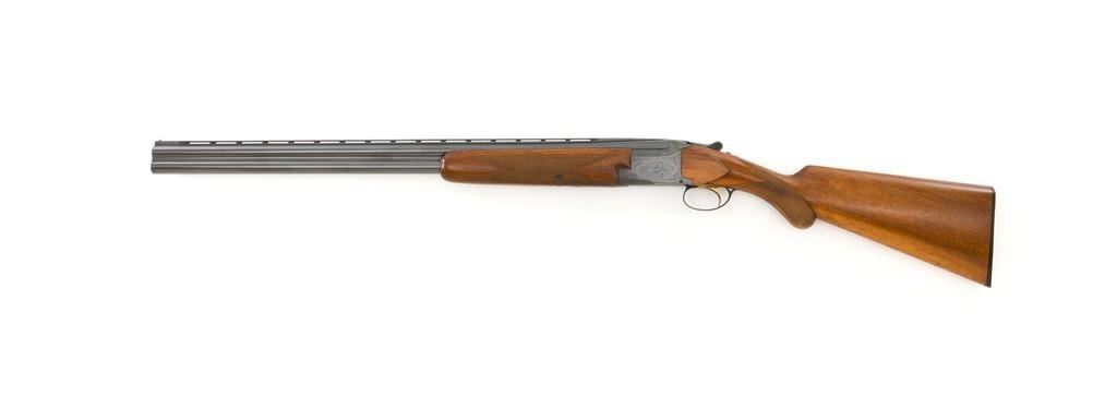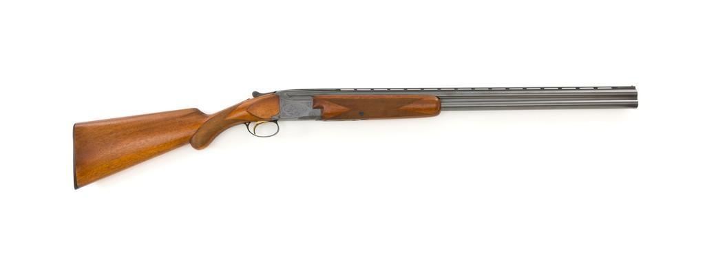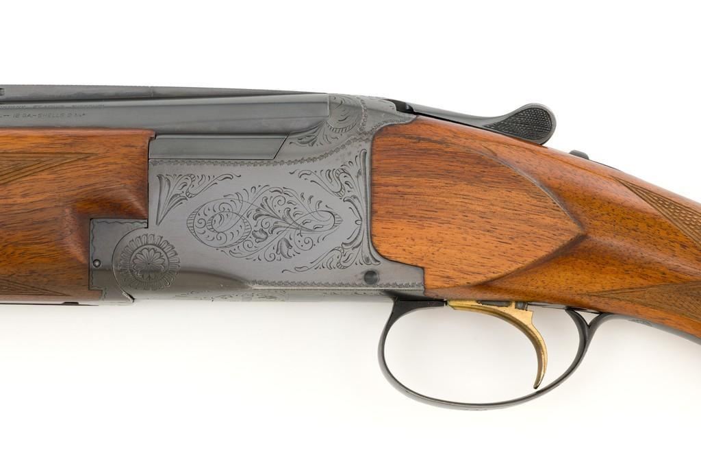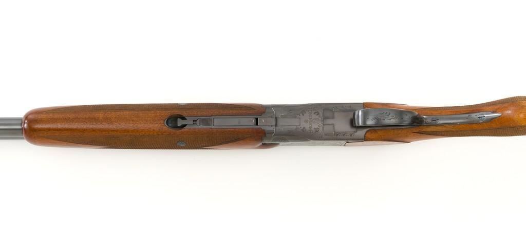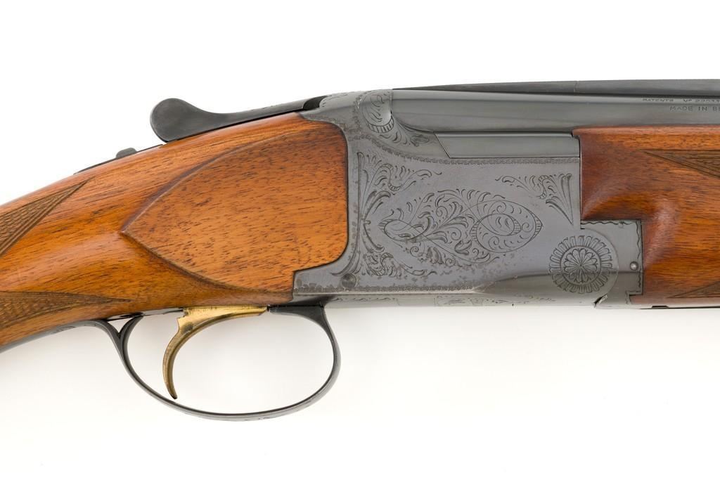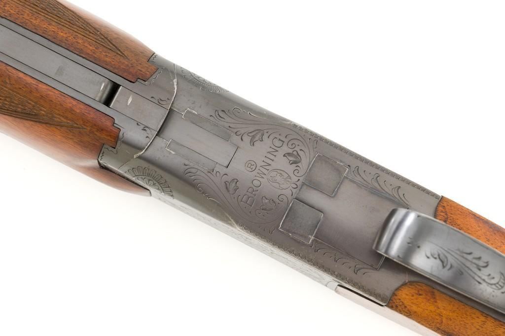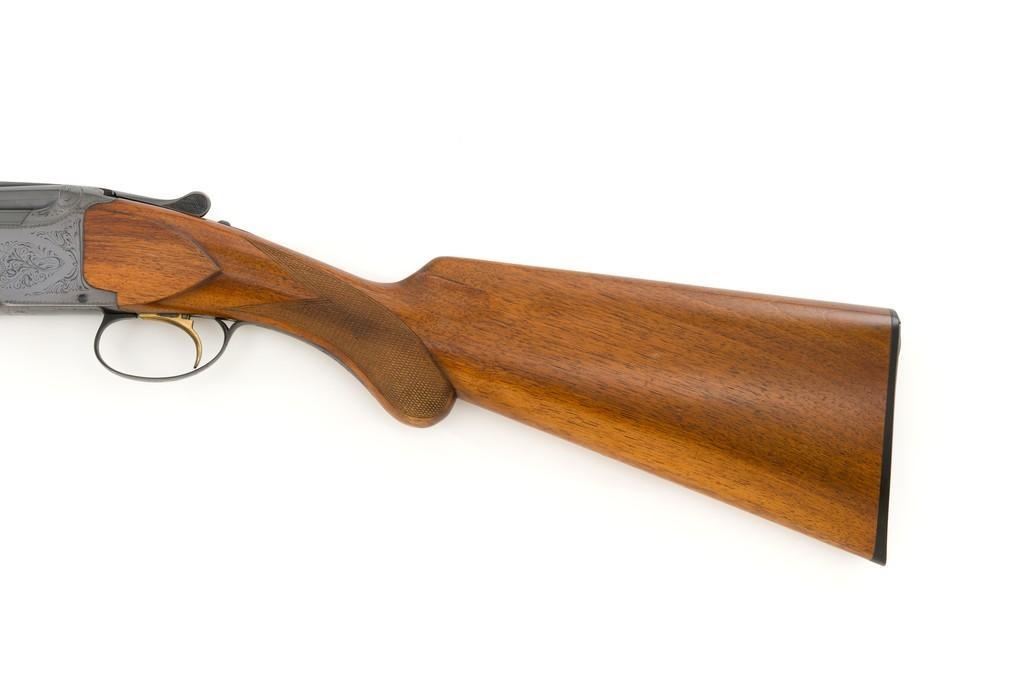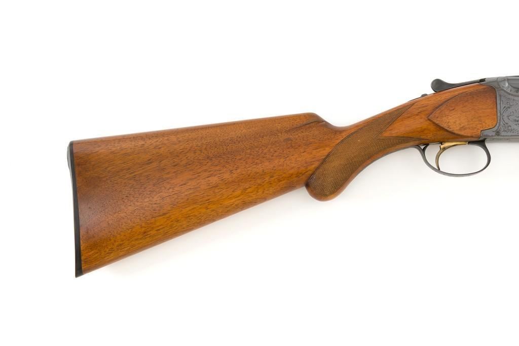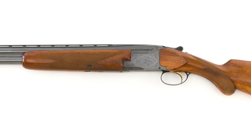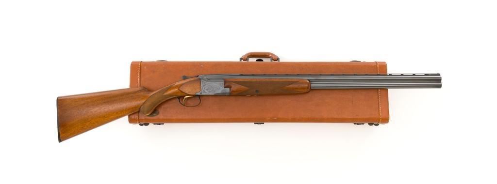 Belgian Browning Grade 1 Standard Weight Superposed Over/Under Shotgun, #63953, 12 ga., 28'' vent rib barrels have 2- 3/4'' chambers and are choked Mod/Full. The boxlock action is standard Browning and features a single selective trigger and ejectors. The receiver is lightly engraved with standard Browning patterns. The slender forend and round knob long tang (RKLT) buttstock are ''A'' grade oil-finished walnut, with hand checkering at 20 LPI, and an original Browning buttplate. Stock dimensions are 14-1/2'' x 1-1/2'' x 2-1/2''. Gun is contained in an early Browning ''Tolex'' leather case, with blue velvet lining, and original paperwork. Mfg'd by FN in Belgium in 1958 for Browning. Condition is fine for a 67-year-old gun. Metal retains approx. 95% factory blue with light carry wear to the bottom and edges of the frame. The wood shows light handling marks with no large gouges but slightly worn checkering. Action is broken in but still locks up very tight and functions correctly. Bores are bright. This shotgun still has a lot of life left for upland bird hunting, and lead shot only. Est.: $1,000-$1,400. (C&R/PPT)