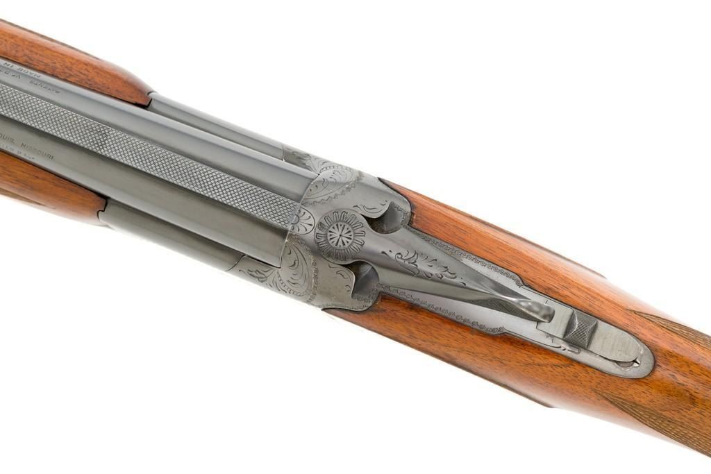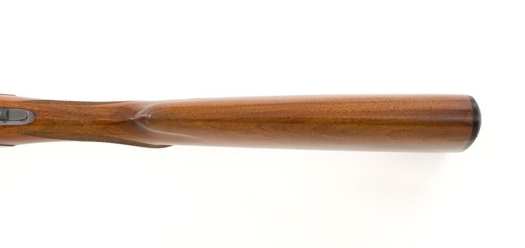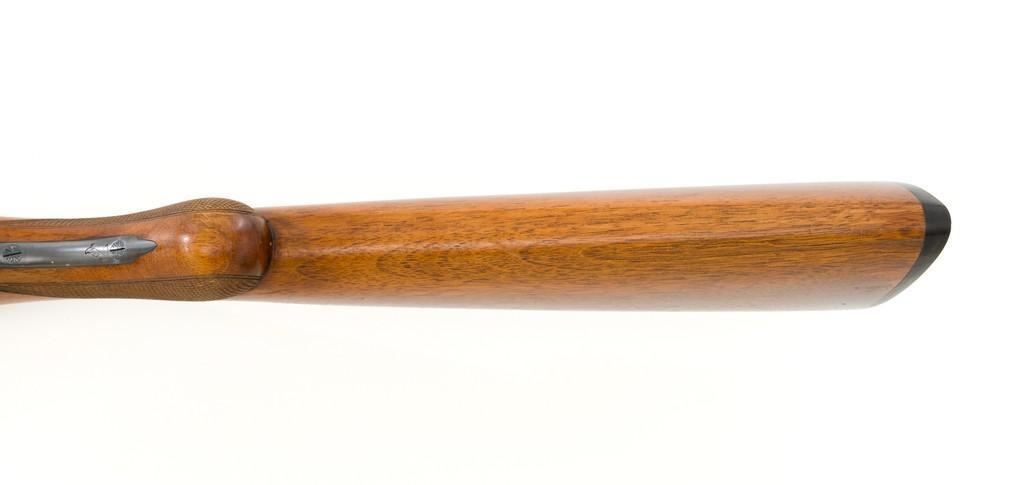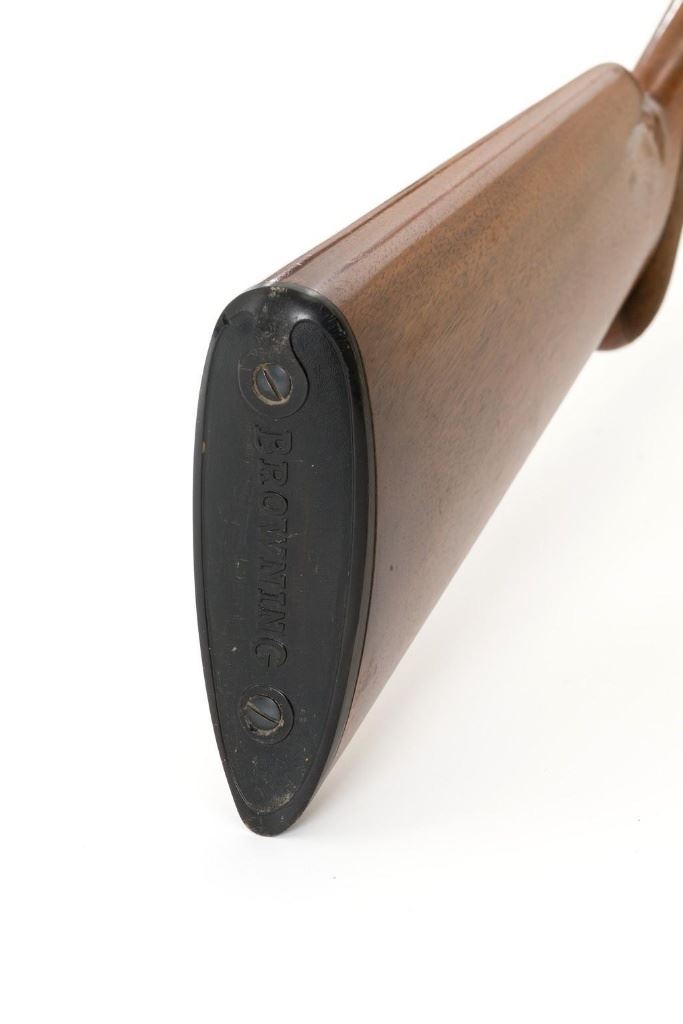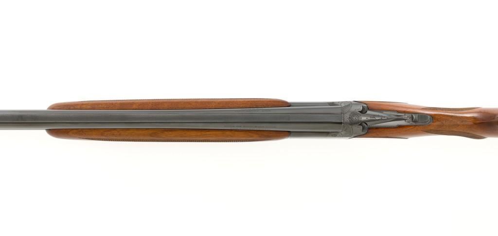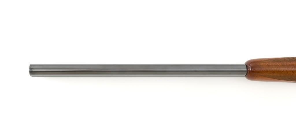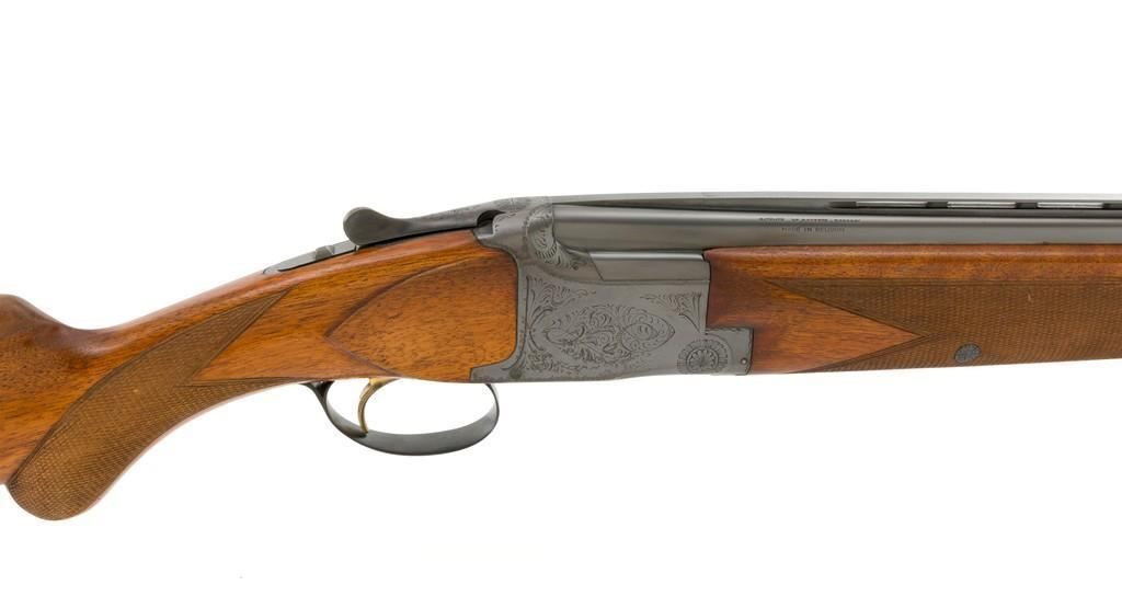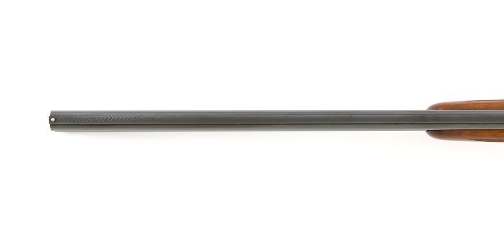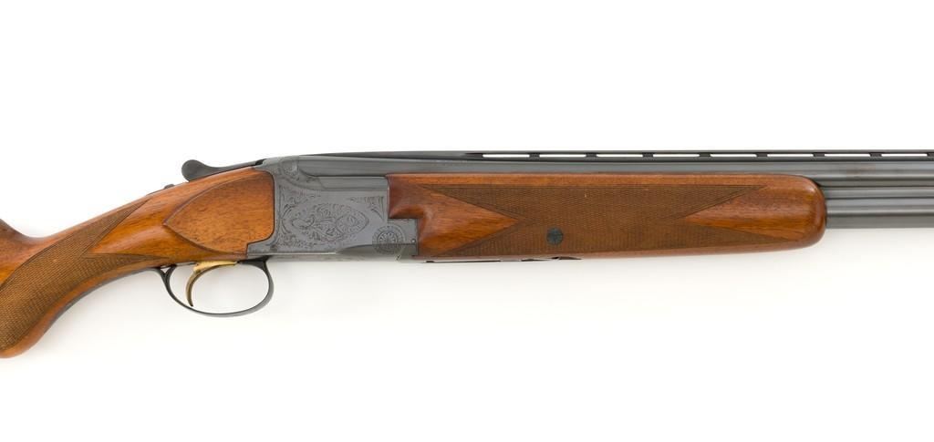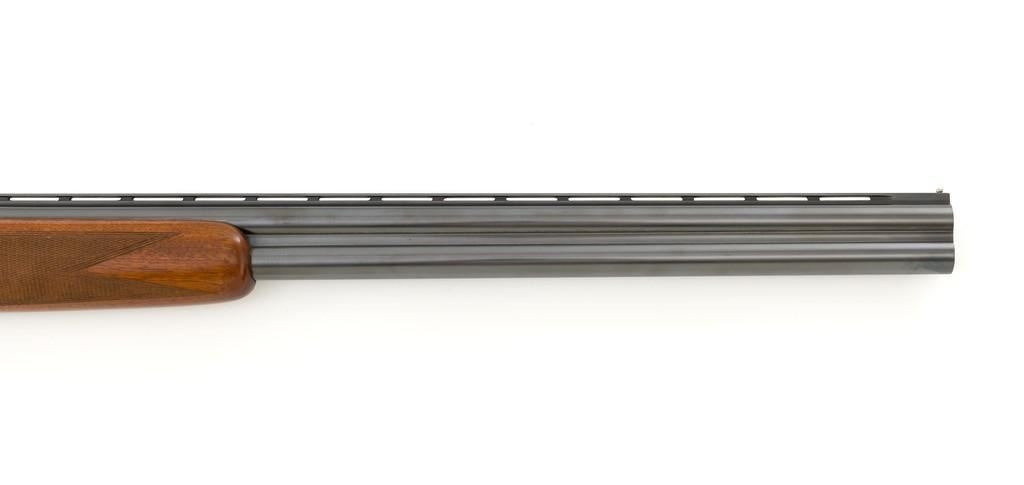 Belgian Browning Grade 1 Standard Weight Superposed Over/Under Shotgun, #63953, 12 ga., 28'' vent rib barrels have 2- 3/4'' chambers and are choked Mod/Full. The boxlock action is standard Browning and features a single selective trigger and ejectors. The receiver is lightly engraved with standard Browning patterns. The slender forend and round knob long tang (RKLT) buttstock are ''A'' grade oil-finished walnut, with hand checkering at 20 LPI, and an original Browning buttplate. Stock dimensions are 14-1/2'' x 1-1/2'' x 2-1/2''. Gun is contained in an early Browning ''Tolex'' leather case, with blue velvet lining, and original paperwork. Mfg'd by FN in Belgium in 1958 for Browning. Condition is fine for a 67-year-old gun. Metal retains approx. 95% factory blue with light carry wear to the bottom and edges of the frame. The wood shows light handling marks with no large gouges but slightly worn checkering. Action is broken in but still locks up very tight and functions correctly. Bores are bright. This shotgun still has a lot of life left for upland bird hunting, and lead shot only. Est.: $1,000-$1,400. (C&R/PPT)