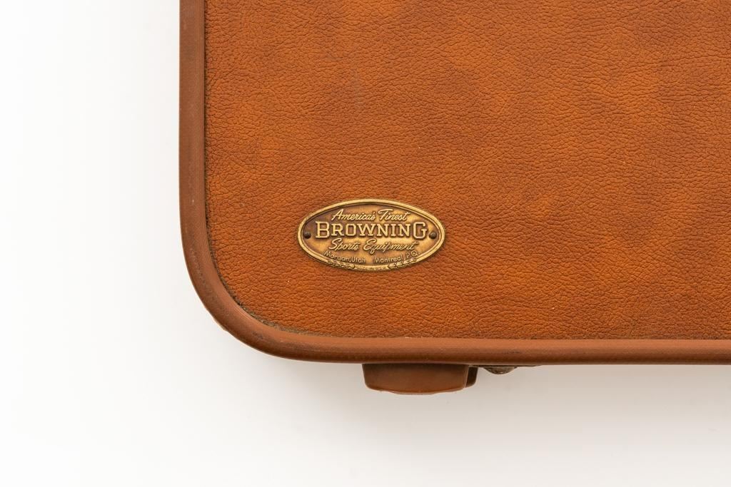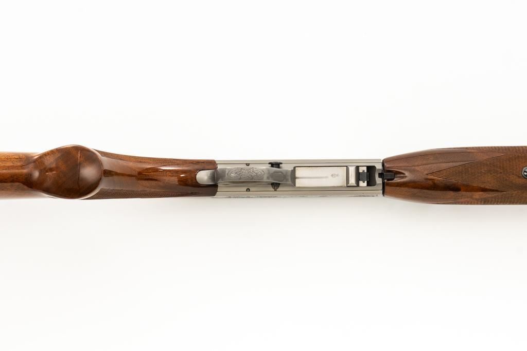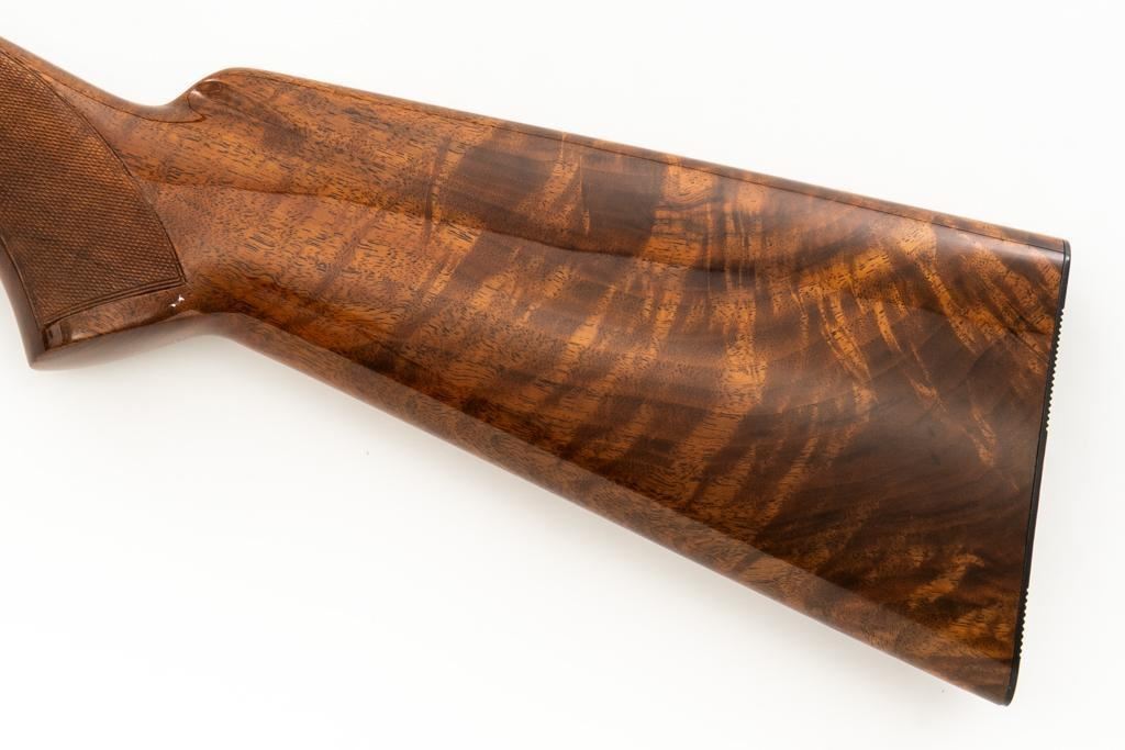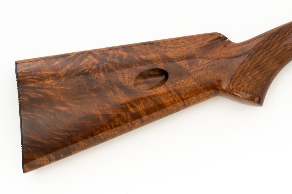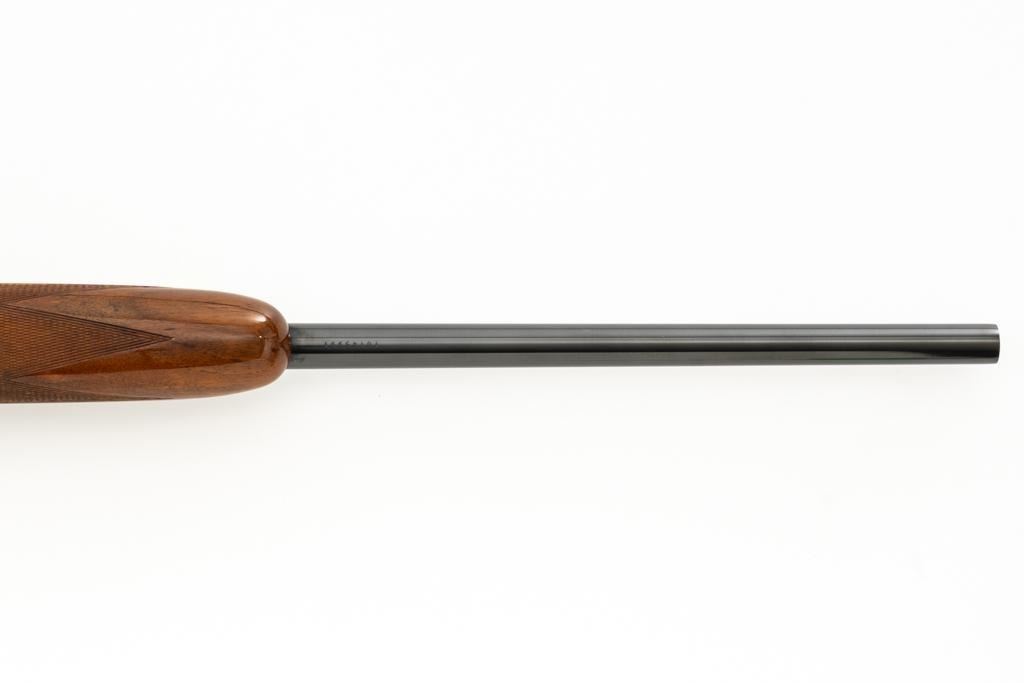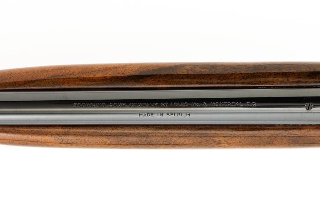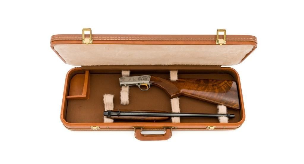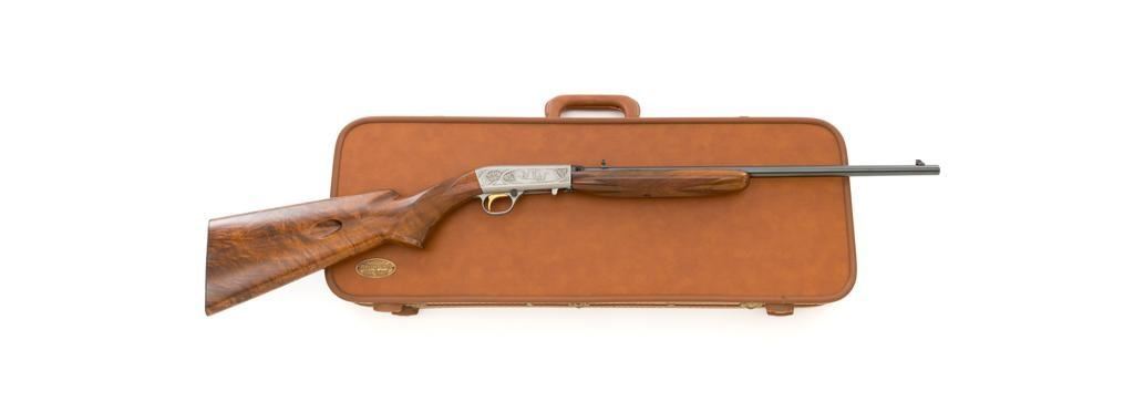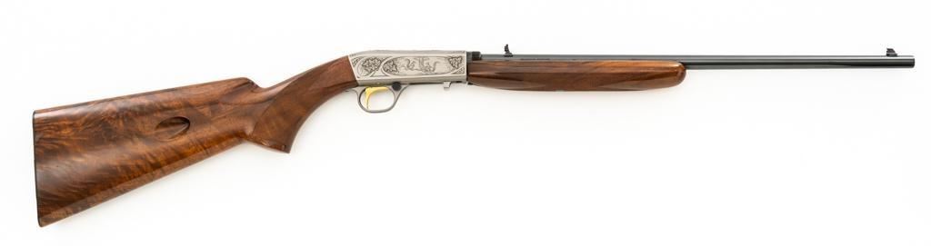 Jules Lwanczk Engraved Belgian Browning SA-22 Grade II Semi-Automatic Rifle, #70T45991, .22 LR cal., 19-3/8'' blued barrel, with engraved French gray receiver; finely checkered, highly figured, gloss finished walnut pistol grip stock and forend. Rifle also features a dovetailed brass bead blade front sight, notched folding rear sight, and gold colored trigger. Marked ''MADE IN BELGIUM'' on the left side of the barrel. Receiver was factory engraved by master engraver Jules Lwanczk, with game scenes on both sides and top of the receiver, surrounded by floral scroll engraving; signed on top with engravers initial ''JL''. Mfg'd 1970. Includes a Browning Naugahyde luggage case with two (2) keys. Rifle is in excellent overall condition, retaining approx. 99% factory blue. There are a few very minor specks of darkening on the lower left edge of the receiver, as well as mild dark spotting on the lower left edged of the breechblock finger piece. Buttstock with beautiful figure, crisp checkering, and only a few very minor handling marks. No salt wood damage. Action functions smoothly. Bore is bright with defined rifling. Browning case is in excellent overall condition. Est.: $1,500-$1,800. (C&R/PPT)
