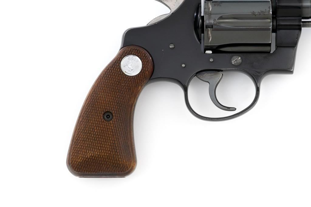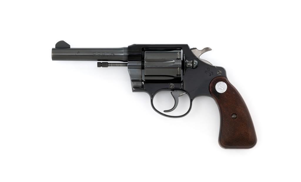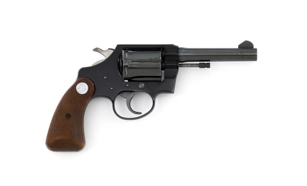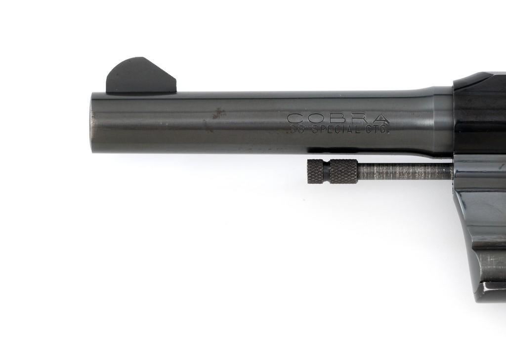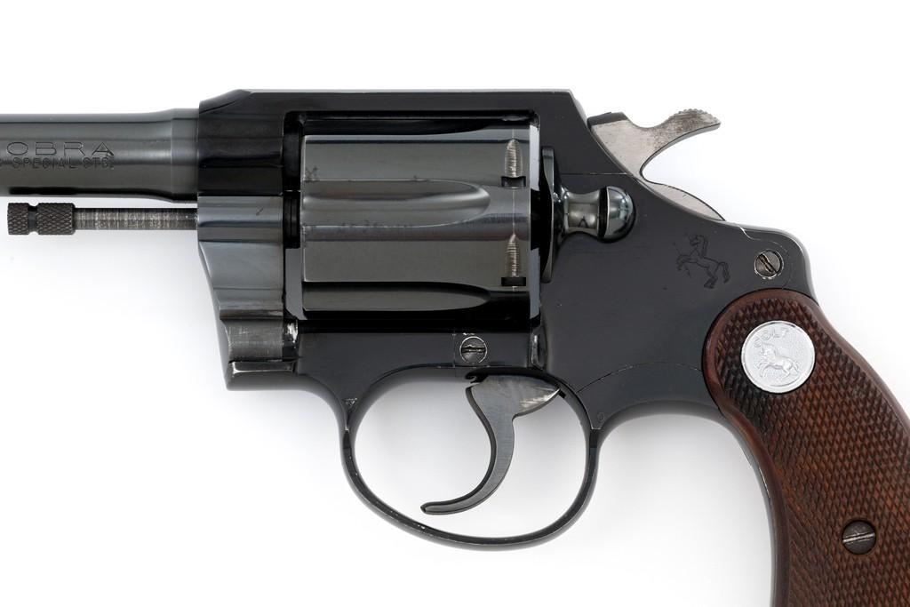 Colt Cobra 1st Issue Double Action Revolver, #163422LW, .38 Spl. cal., 4'' barrel, blue finish, checkered walnut two-piece grips with Colt medallions, alloy frame, serrated blade front, and fixed square-notch rear sight. Mfg'd 1965. Revolver is in near excellent overall condition, retaining approx. 97%-98% factory blue, with light wear at the muzzle and to leading edge of the cylinder. Front and backstrap have a few small nicks and scratches. Factory markings are clear. Grips are near excellent with minor smoothing and handling wear. Action is crisp and locks up securely. Bore is bright with well-defined rifling. Est.: $700-$900. (C&R/PPT)