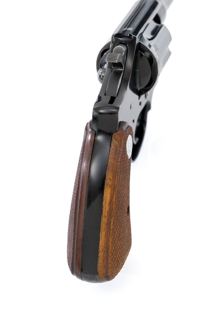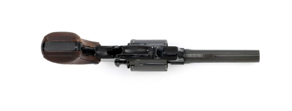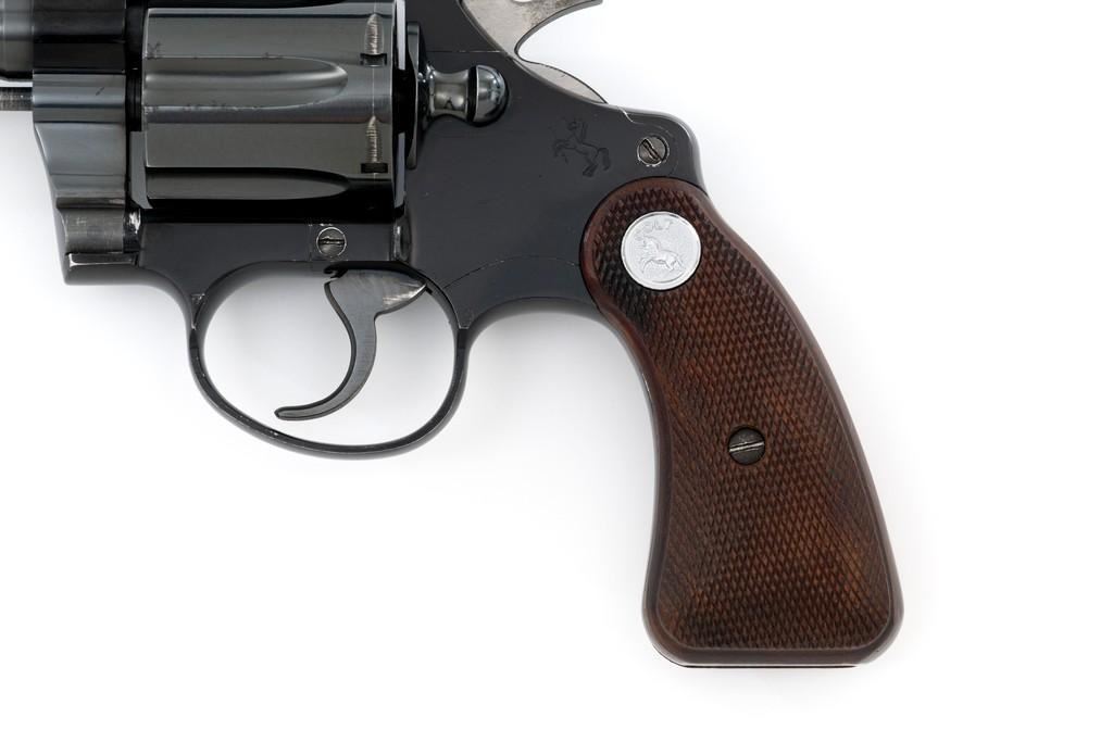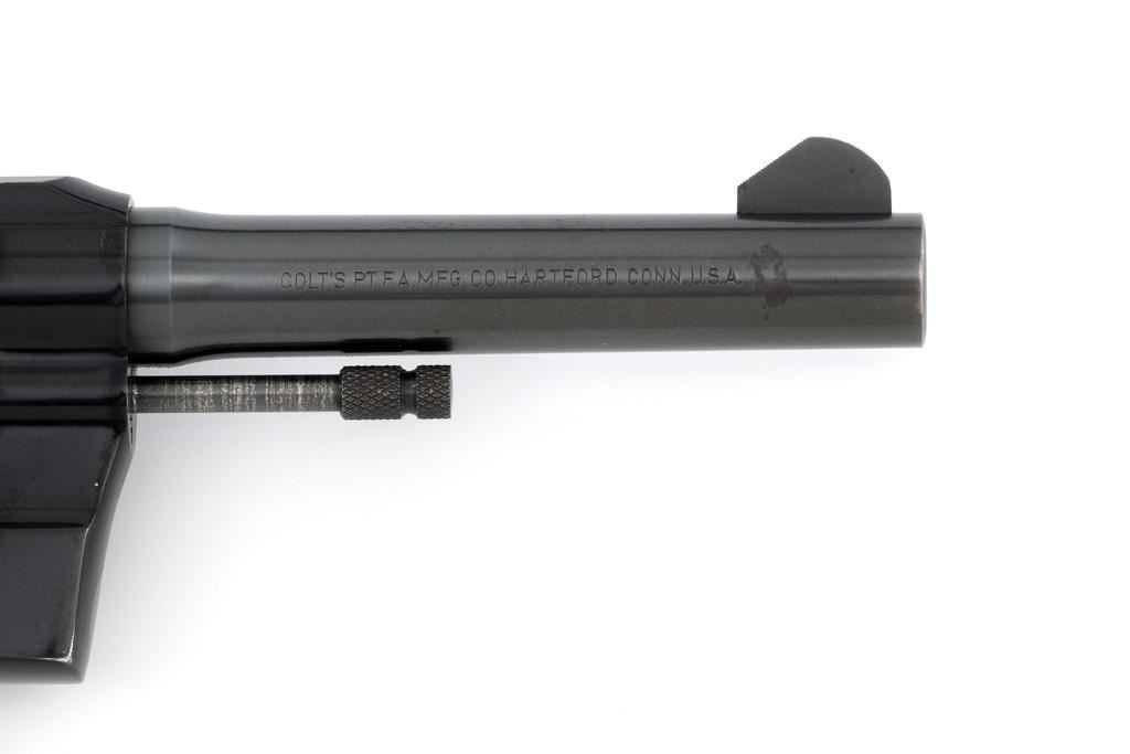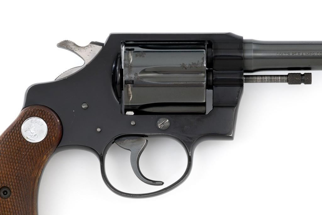 Colt Cobra 1st Issue Double Action Revolver, #163422LW, .38 Spl. cal., 4'' barrel, blue finish, checkered walnut two-piece grips with Colt medallions, alloy frame, serrated blade front, and fixed square-notch rear sight. Mfg'd 1965. Revolver is in near excellent overall condition, retaining approx. 97%-98% factory blue, with light wear at the muzzle and to leading edge of the cylinder. Front and backstrap have a few small nicks and scratches. Factory markings are clear. Grips are near excellent with minor smoothing and handling wear. Action is crisp and locks up securely. Bore is bright with well-defined rifling. Est.: $700-$900. (C&R/PPT)