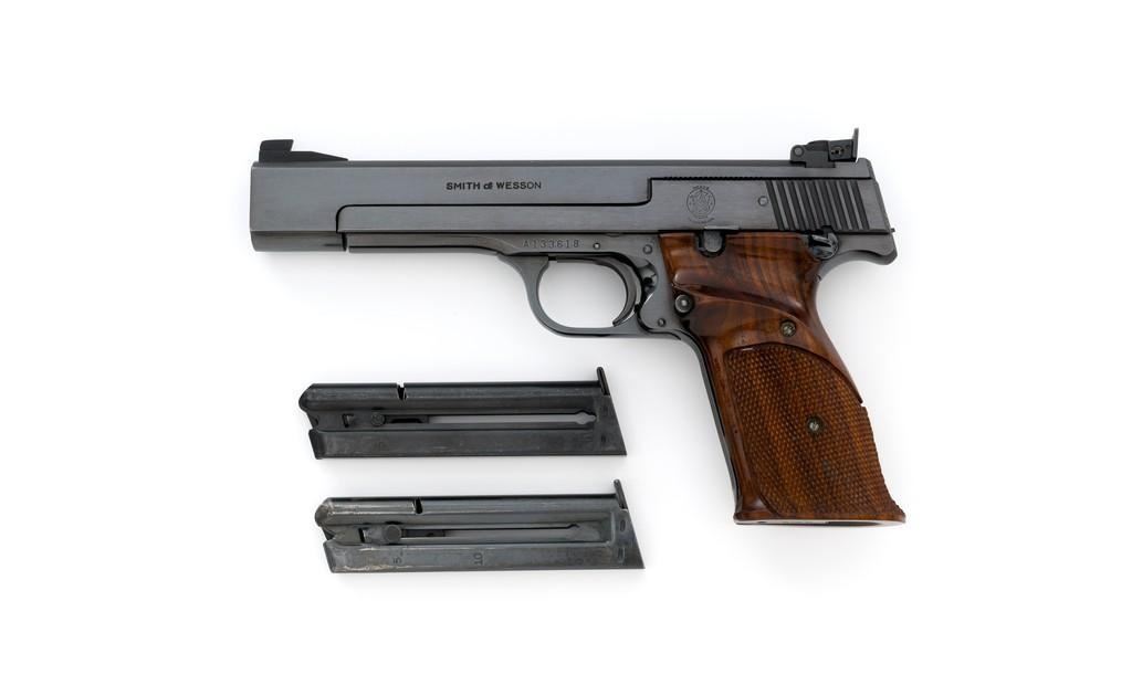 Smith & Wesson Model 41 Semi-Automatic Target Pistol, #A133618, .22 LR cal., 5.5'' barrel, blue finish, checkered walnut grips with thumb rests, Patridge front sight, adjustable square-notch rear sight, cocking indicator, and serrated front grip strap. Includes three (3) 10-round S&W magazines. Mfg'd circa 1970-1971. Condition is excellent, retaining approx. 98%-99% factory blue. Metal surfaces show light handling marks. Grips are near excellent with light handling marks and a few small dents; checkering is crisp. Action is smooth. Bore is bright with well-defined rifling. Est.: $900-$1,200. (C&R)