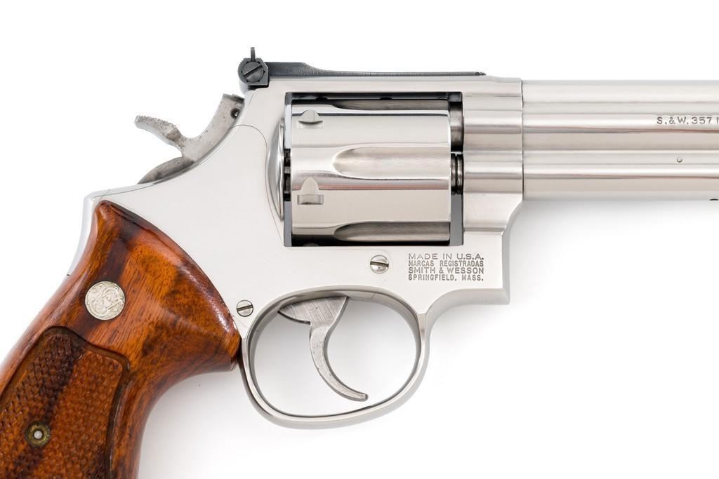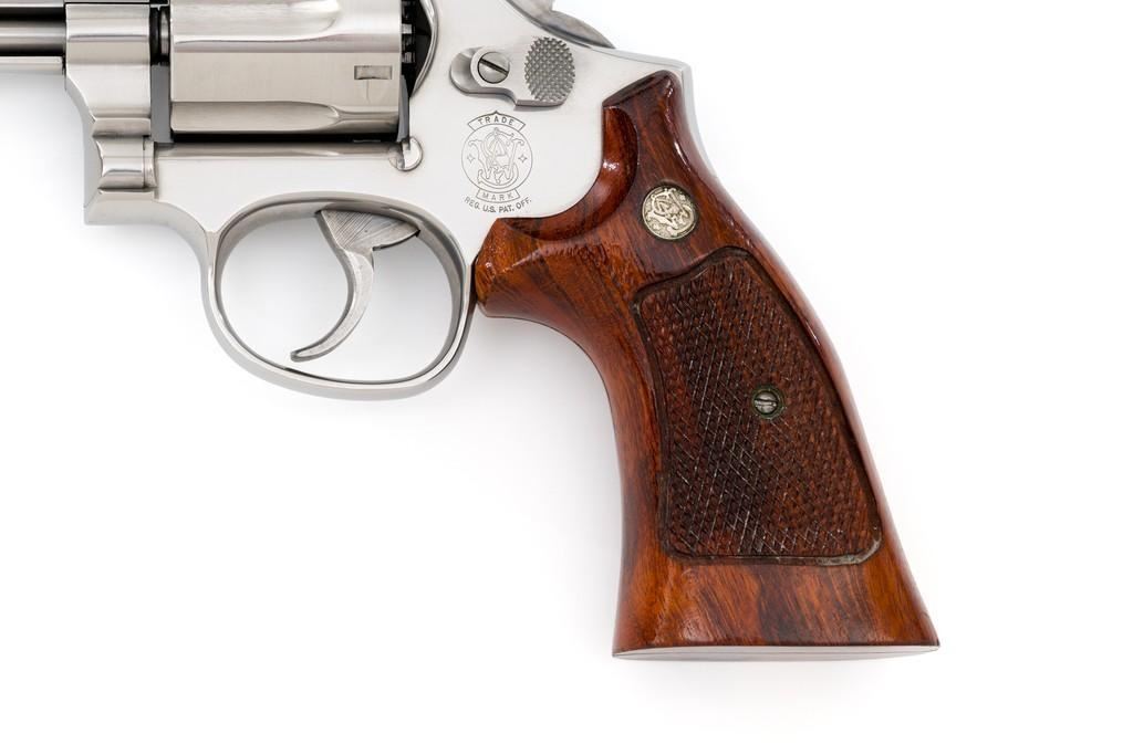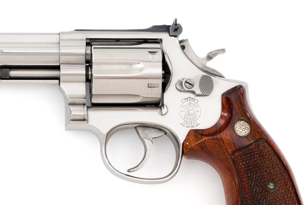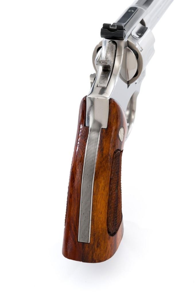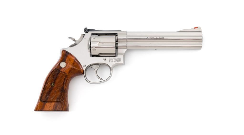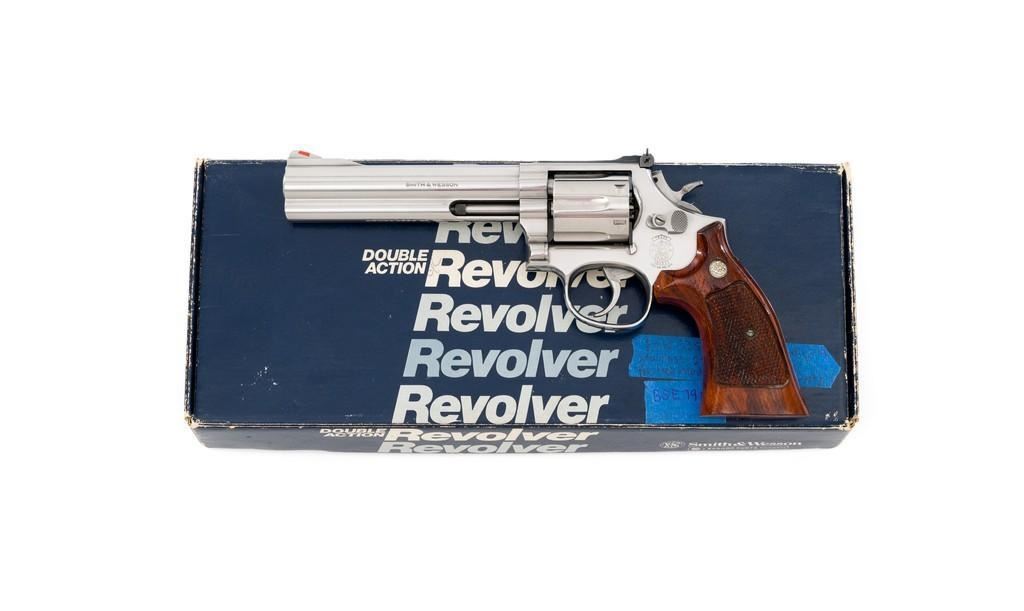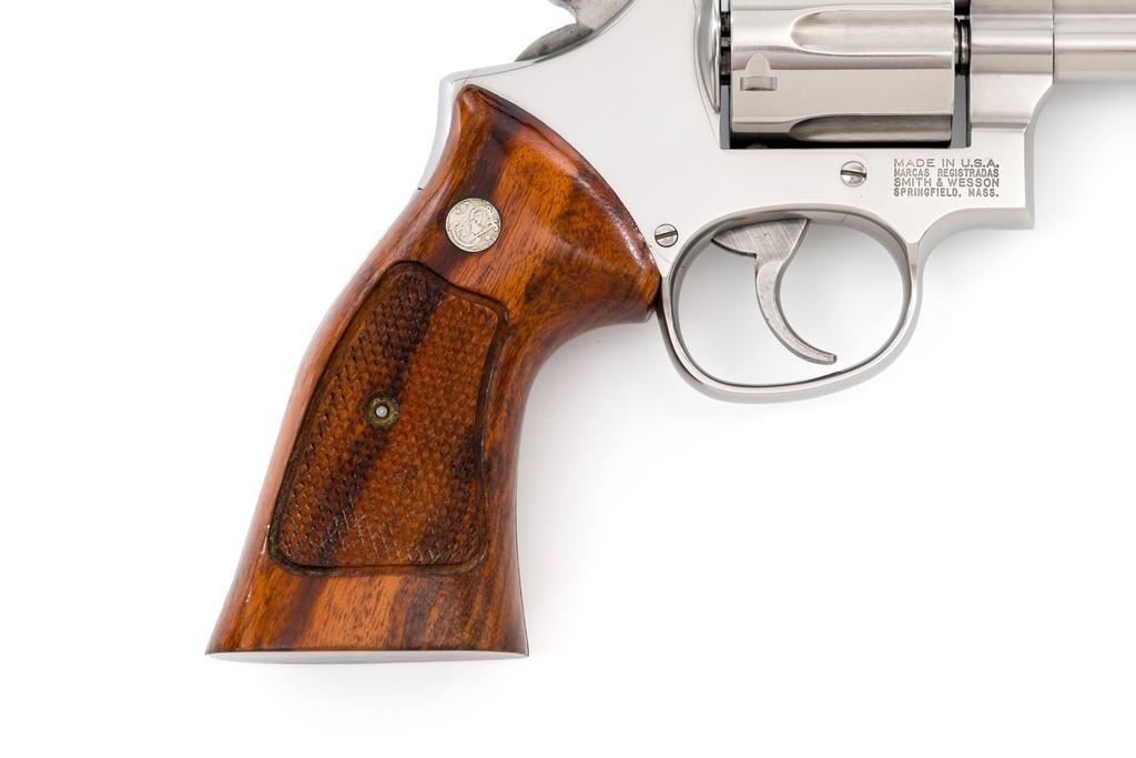Smith & Wesson Model 686-4 Distinguished Combat Magnum Double Action Revolver, #BSE7951, .357 Mag. cal., 6-shot cylinder, 6'' barrel, stainless steel, factory checkered Goncalo Alves target grips with inlaid S&W medallions, red ramp front sight, white outline fully adjustable rear sight, checkered hammer and smooth trigger. Mfg'd circa 1993-1996. Includes non-matching factory box, instruction manual, and other misc. factory paper work. Revolver rates near excellent overall. Metal with a small amount of light micro-scratching and handling marks; cylinder with a light index line. Inside the frame and cylinder face are clean. Factory lettering is clear and sharp. Grips are excellent with only a few light handling marks. Action cycles smoothly and the cylinder locks up tight. Bore is bright with well-defined rifling. Est.: $600-$900. (Modern) (Not available to Calif. residents.)