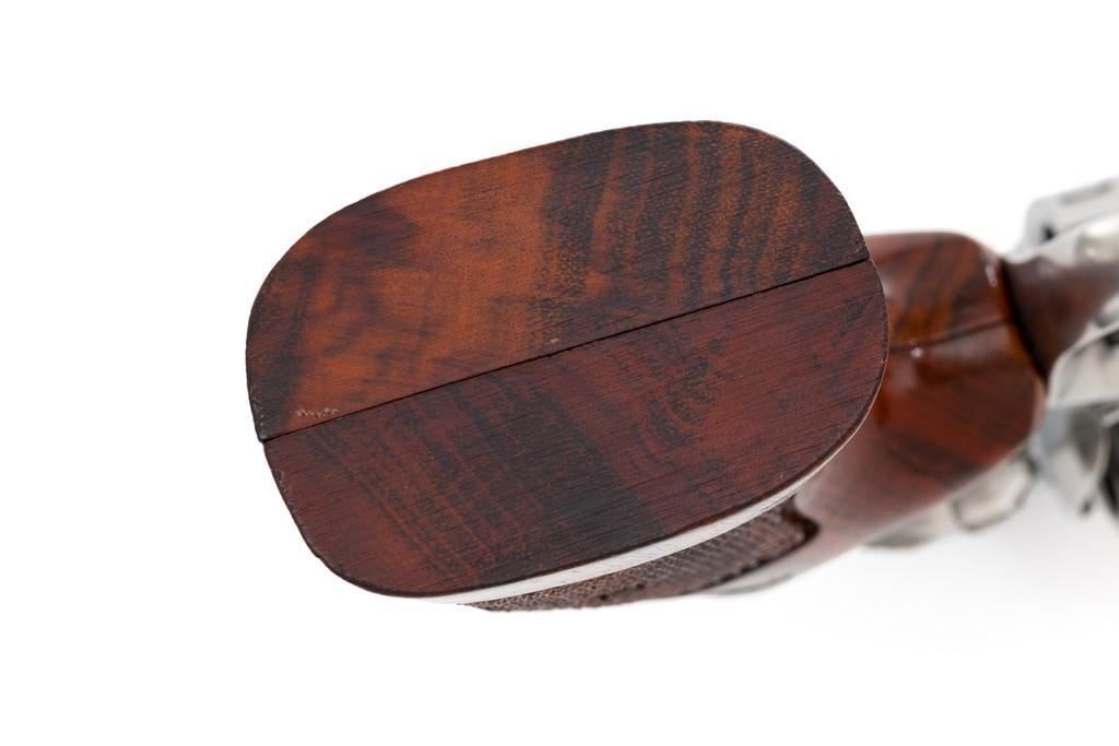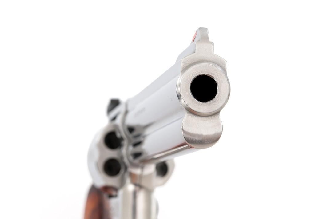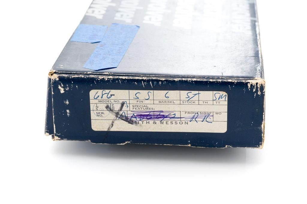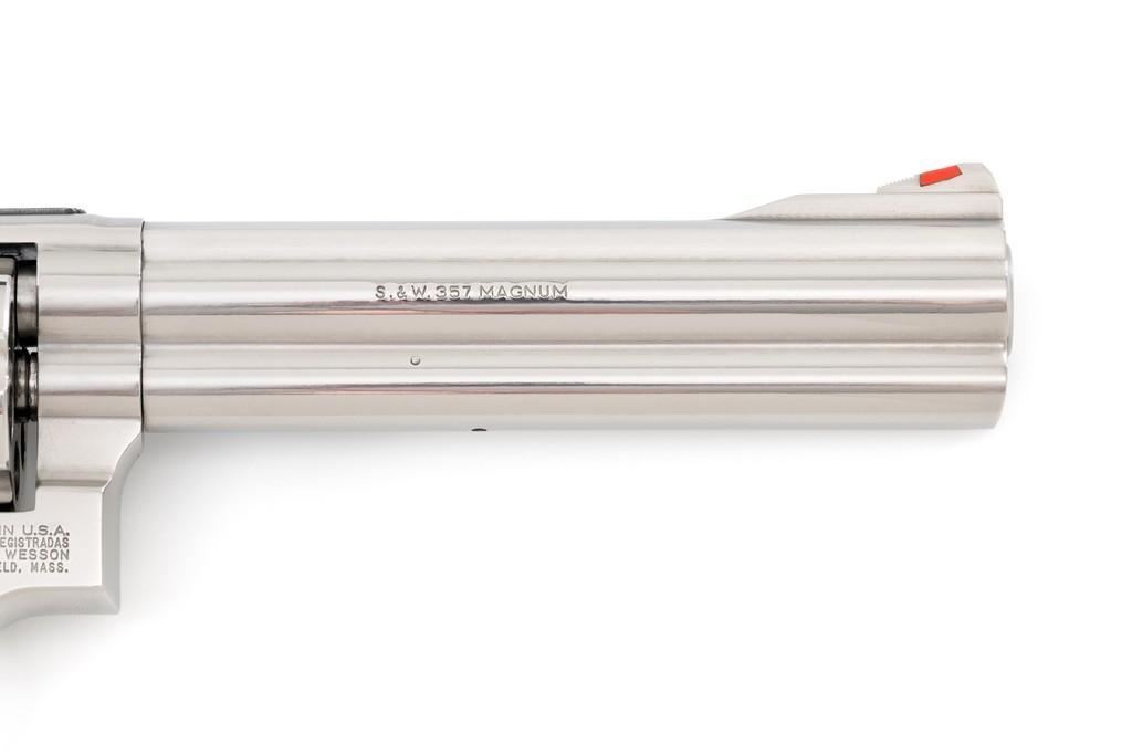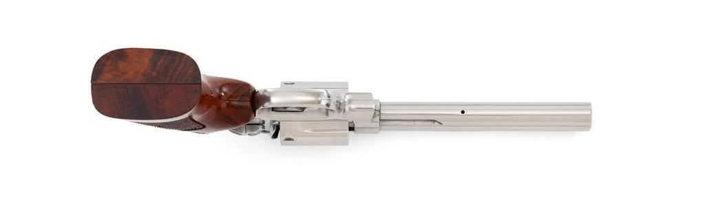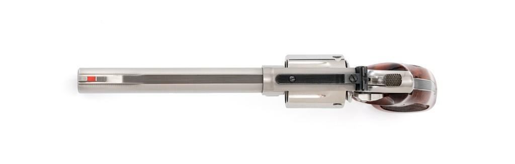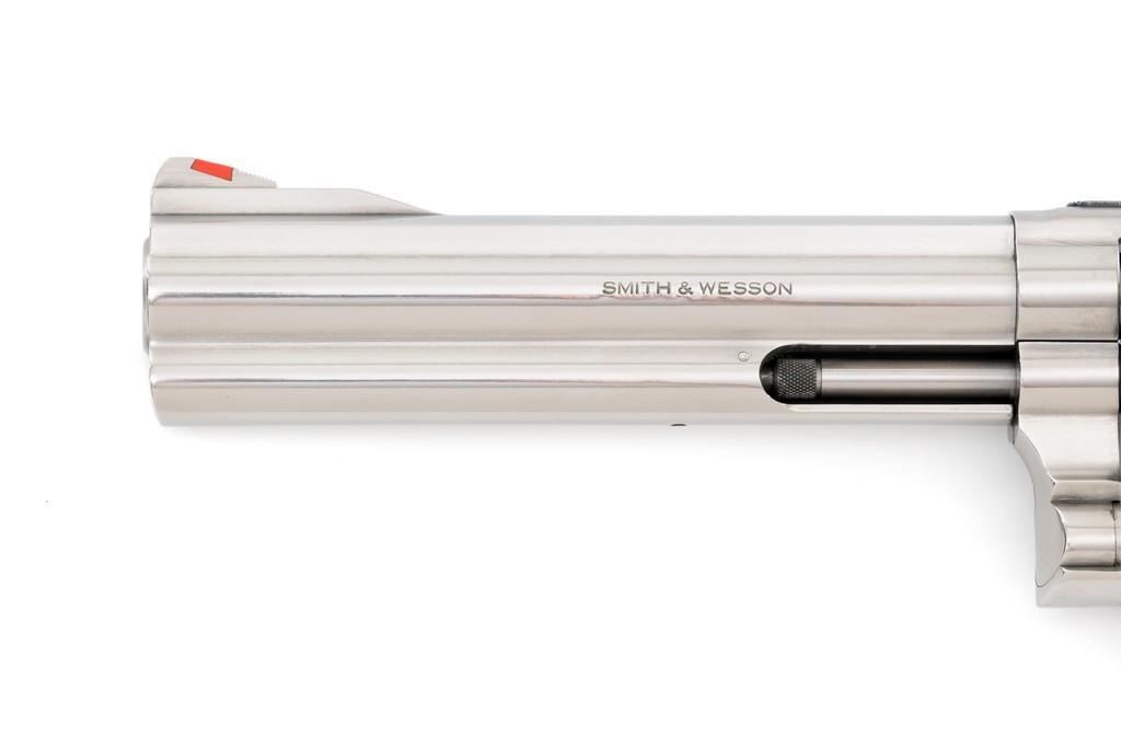 Smith & Wesson Model 686-4 Distinguished Combat Magnum Double Action Revolver, #BSE7951, .357 Mag. cal., 6-shot cylinder, 6'' barrel, stainless steel, factory checkered Goncalo Alves target grips with inlaid S&W medallions, red ramp front sight, white outline fully adjustable rear sight, checkered hammer and smooth trigger. Mfg'd circa 1993-1996. Includes non-matching factory box, instruction manual, and other misc. factory paper work. Revolver rates near excellent overall. Metal with a small amount of light micro-scratching and handling marks; cylinder with a light index line. Inside the frame and cylinder face are clean. Factory lettering is clear and sharp. Grips are excellent with only a few light handling marks. Action cycles smoothly and the cylinder locks up tight. Bore is bright with well-defined rifling. Est.: $600-$900. (Modern) (Not available to Calif. residents.)