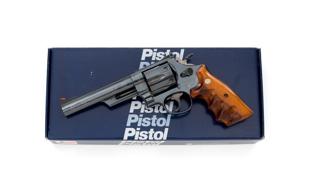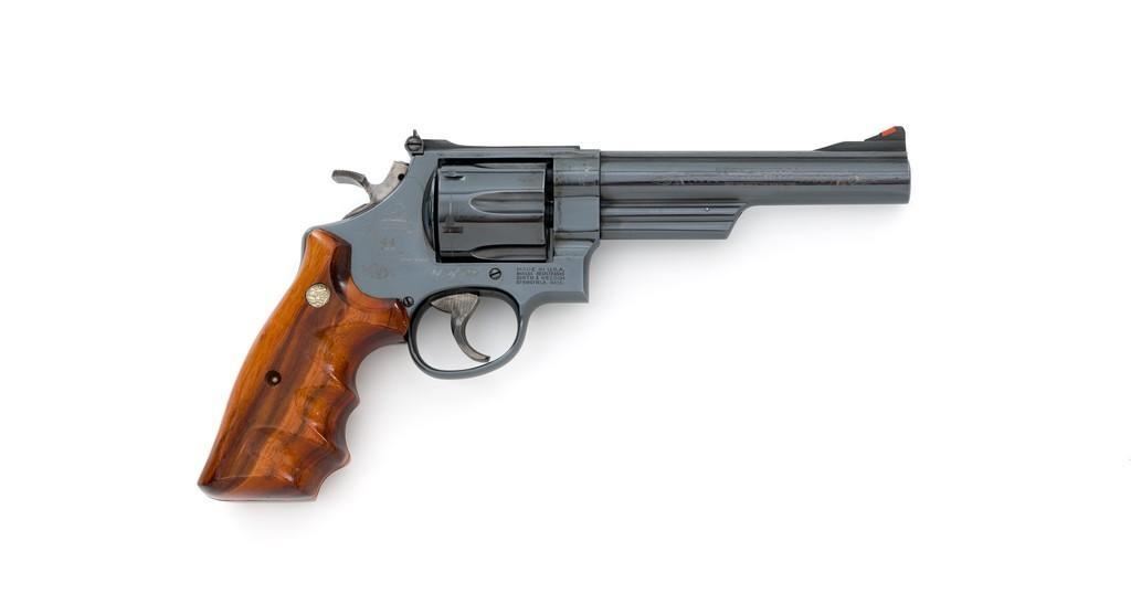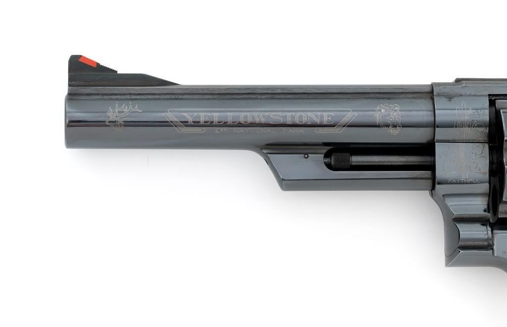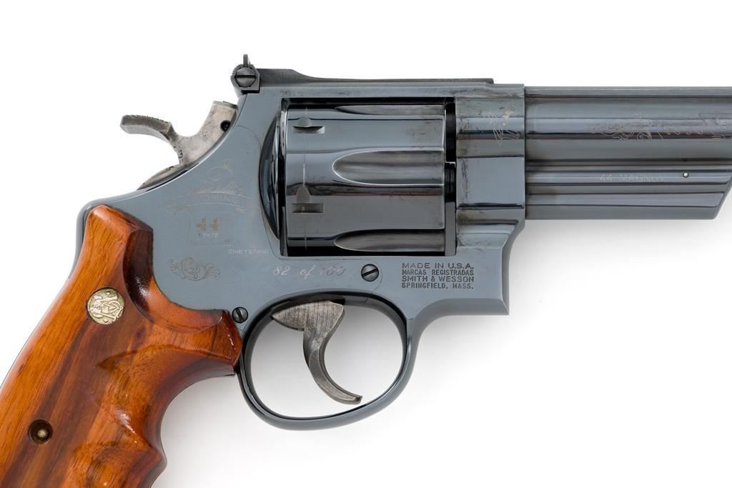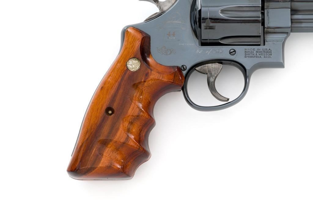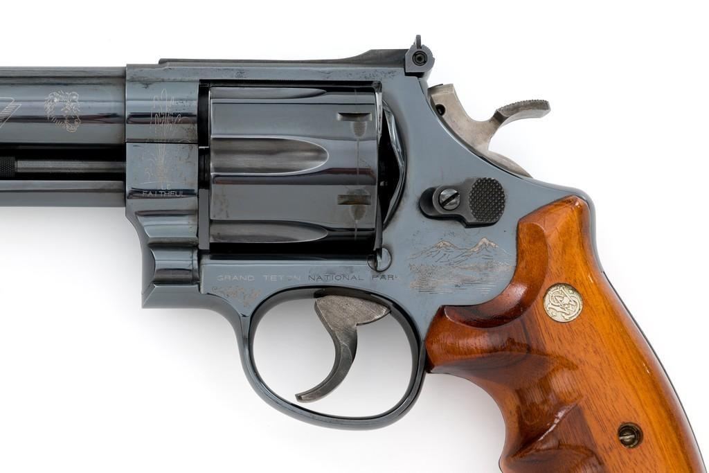 Smith & Wesson Model 29-5 Wyoming Centennial Double Action Revolver, #BFE9530, .44 Mag. cal., 6'' barrel, dark blue finish, factory smooth combat Goncalo Alves grips with inlaid S&W medallions, red ramp front sight, adjustable rear sight, case hardened hammer and smooth trigger. Right side of barrel is marked "1890 WYOMING 1990/THE EQAULITY STATE''. Right side of the frame is marked ''WYOMING/44TH STATE/CHEYENE'' and ''82 of 100'' just under the cylinder. Left side of barrel is marked ''YELLOWSTONE'' with pictures of an Elk and Wolf on either side; crane and frame are marked ''OLD FAITHFUL'' AND ''GRAND TETON NATIONAL PARK'' respectfully, with images of each. Mfg'd circa 1990. Includes S&W unmarked factory box. Condition is excellent with only a few scattered light marks from handling and light dragline on the cylinder. On the left side, the ''NATIONAL PARK'' inscription has lost its highlight. Grips are excellent with scattered light handling marks. Action cycles smoothly and the cylinder locks up tight. Bore is bright with well-defined rifling. Scarce as only 100 were produced. Est.: $1,500-$1,800. (Modern) (Not available to Calif. residents)