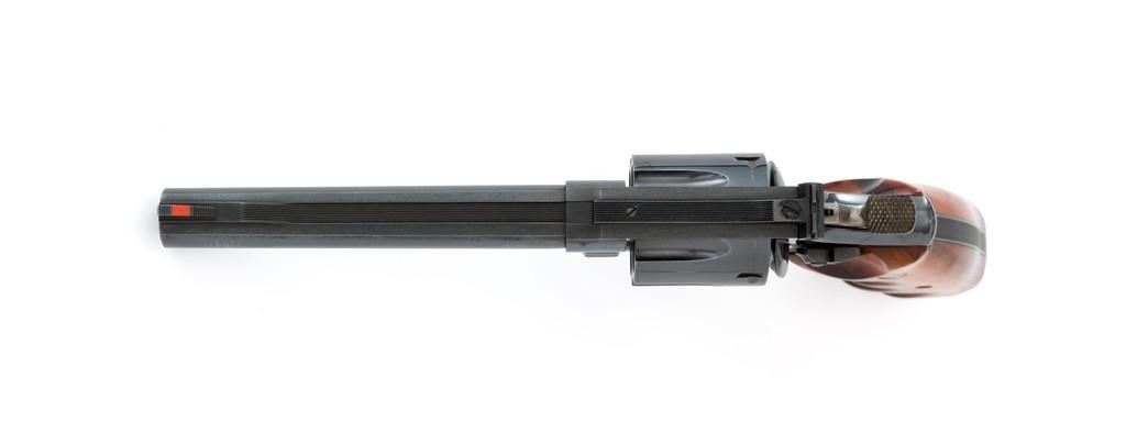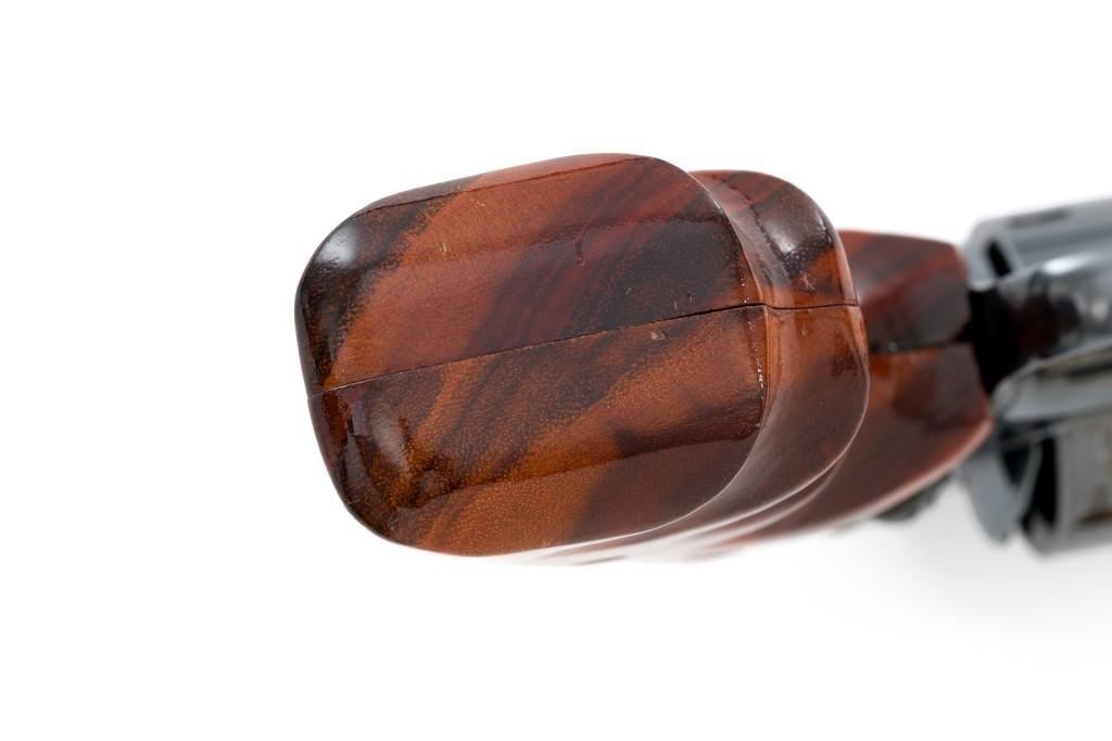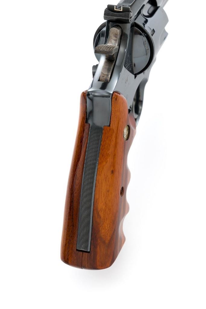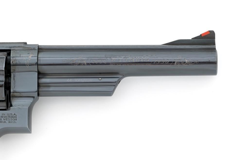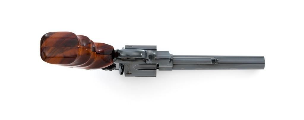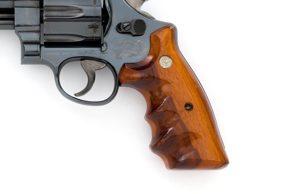 Smith & Wesson Model 29-5 Wyoming Centennial Double Action Revolver, #BFE9530, .44 Mag. cal., 6'' barrel, dark blue finish, factory smooth combat Goncalo Alves grips with inlaid S&W medallions, red ramp front sight, adjustable rear sight, case hardened hammer and smooth trigger. Right side of barrel is marked "1890 WYOMING 1990/THE EQAULITY STATE''. Right side of the frame is marked ''WYOMING/44TH STATE/CHEYENE'' and ''82 of 100'' just under the cylinder. Left side of barrel is marked ''YELLOWSTONE'' with pictures of an Elk and Wolf on either side; crane and frame are marked ''OLD FAITHFUL'' AND ''GRAND TETON NATIONAL PARK'' respectfully, with images of each. Mfg'd circa 1990. Includes S&W unmarked factory box. Condition is excellent with only a few scattered light marks from handling and light dragline on the cylinder. On the left side, the ''NATIONAL PARK'' inscription has lost its highlight. Grips are excellent with scattered light handling marks. Action cycles smoothly and the cylinder locks up tight. Bore is bright with well-defined rifling. Scarce as only 100 were produced. Est.: $1,500-$1,800. (Modern) (Not available to Calif. residents)