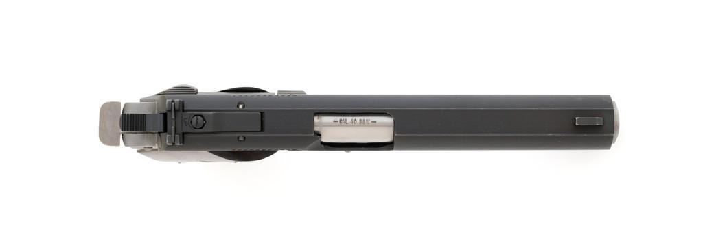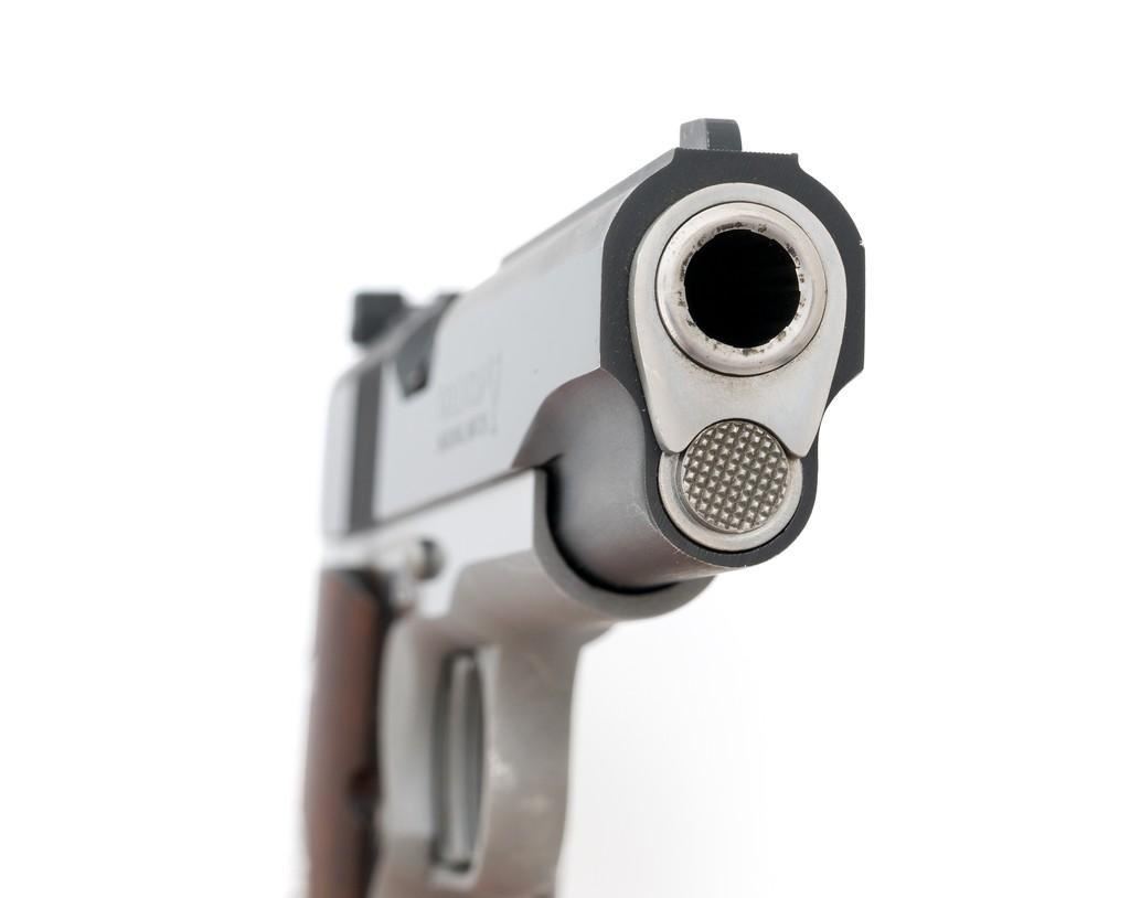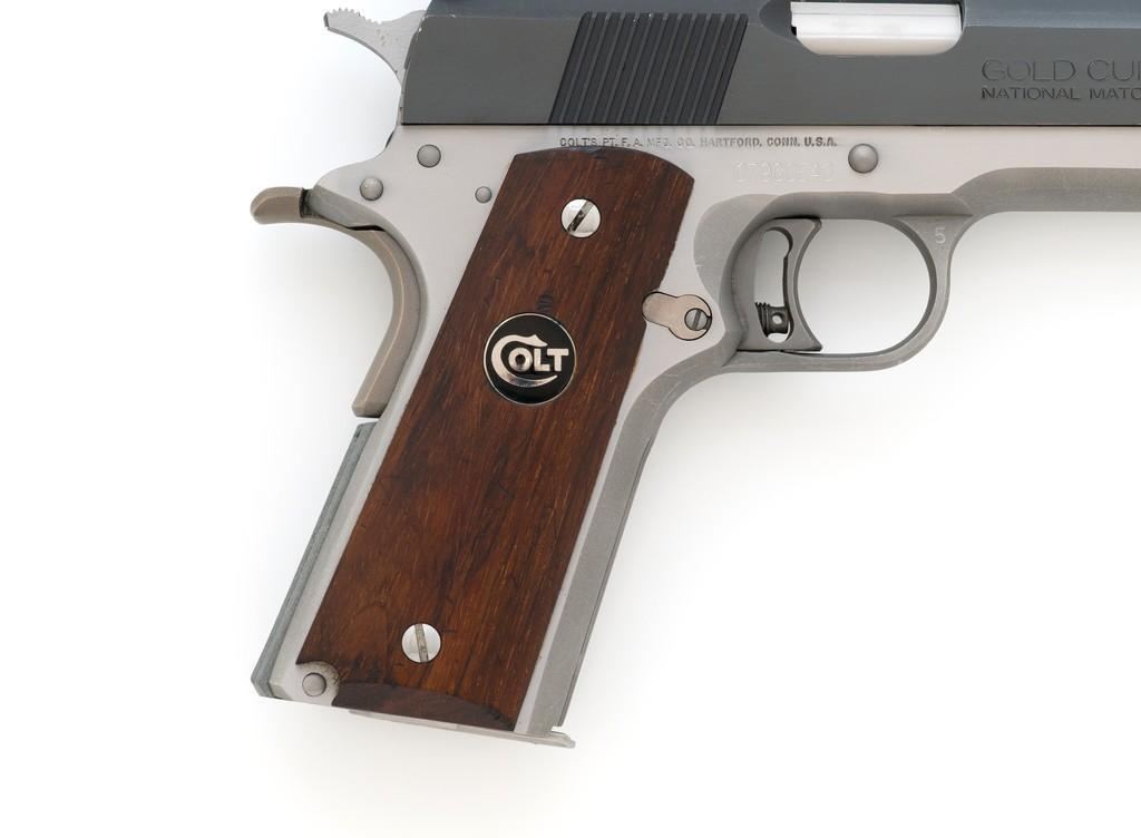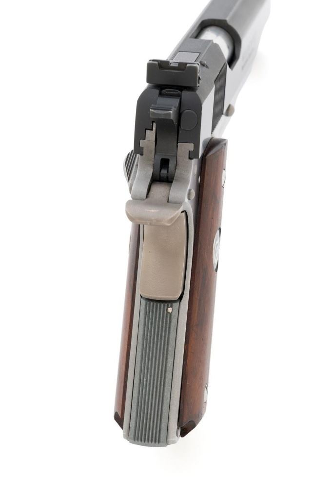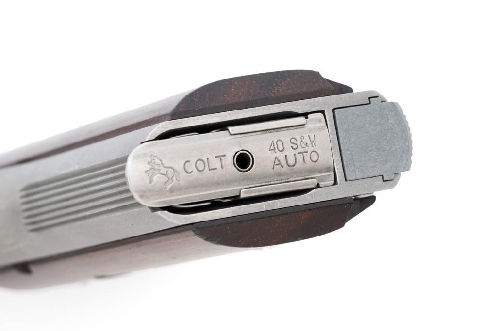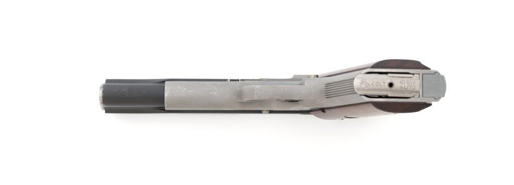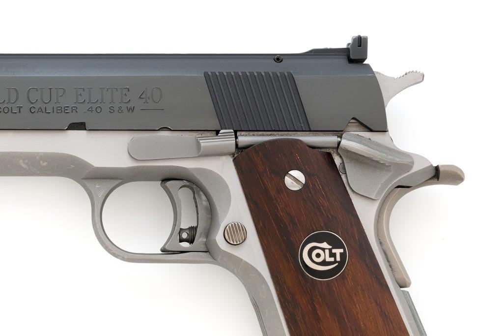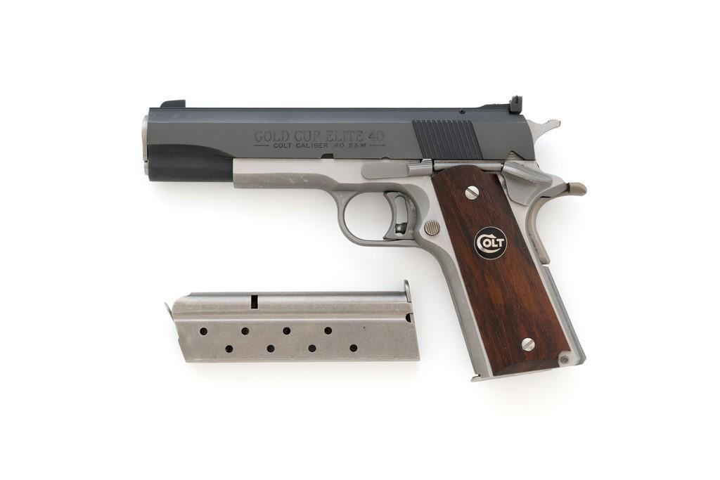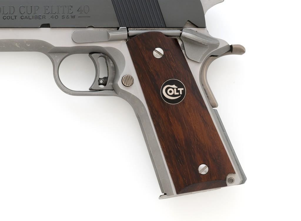 Scarce Colt Gold Cup Elite 40 National Match Semi-Automatic Pistol, #079GCE40, .40 S&W cal., 5'' barrel, blued slide, stainless steel frame, smooth hardwood grips with Colt medallions, Patridge front sight, adjustable square-notched rear sight, with one stainless Colt magazine, and one stainless Kimber 1911 magazine. Left side of the slide is marked ''GOLD CUP ELITE 40 / -COLT CALIBER .40 S&W-'' Mfg'd 1991. It is believed that these pistols were part of a special order for Accusport and that only 250 were produced. Condition is very good, retaining approx. 98% factory blue on the slide, which shows intermittent light handling marks. There are scuffs and rub wear to the front edge of the frame, along front of the trigger guard, and down the front grip strap. Factory lettering is sharp. Left grips shows typical light handling wear; right grip with scattered small indentations, particularly around the medallion and upper screw. Action functions smoothly. Bore is bright with excellent rifling. Est.: $1,500-$2,500. (Modern/PPT)