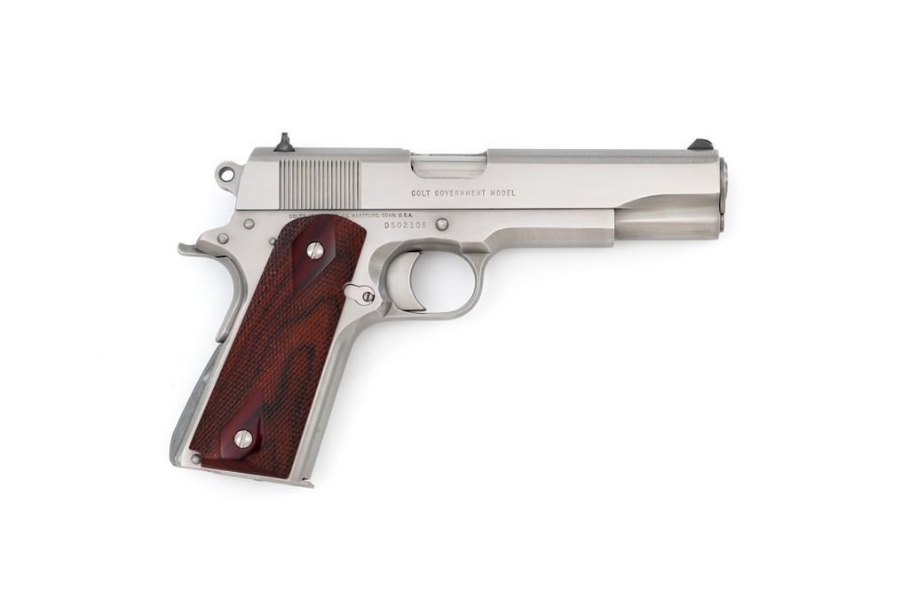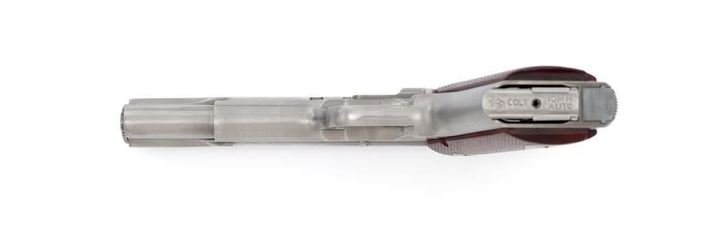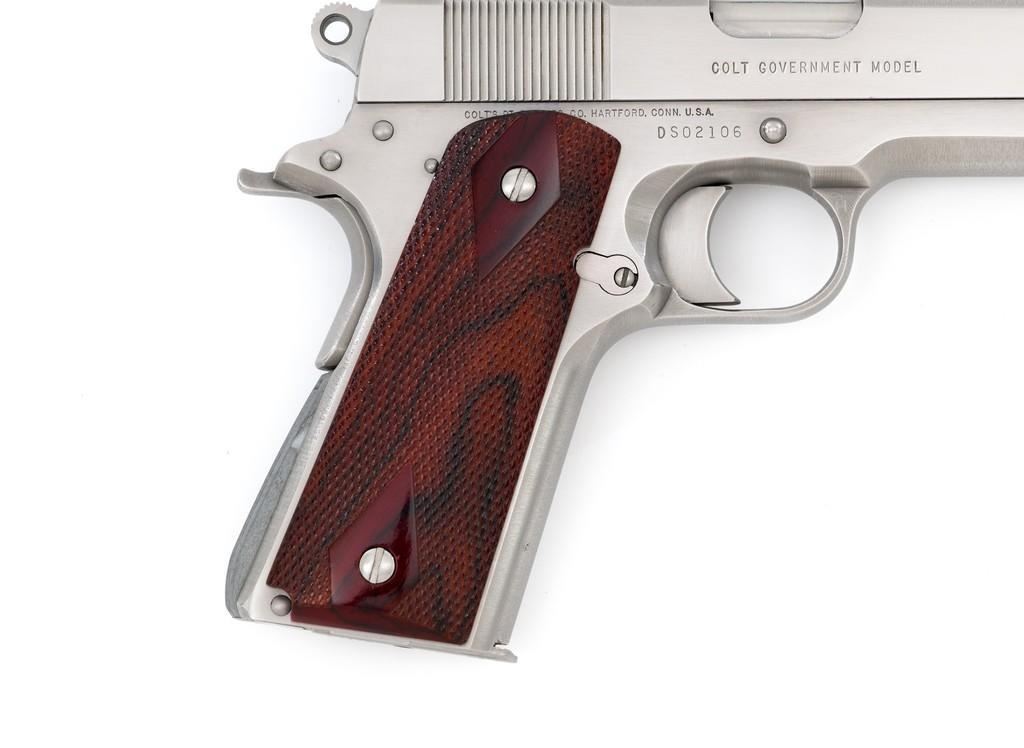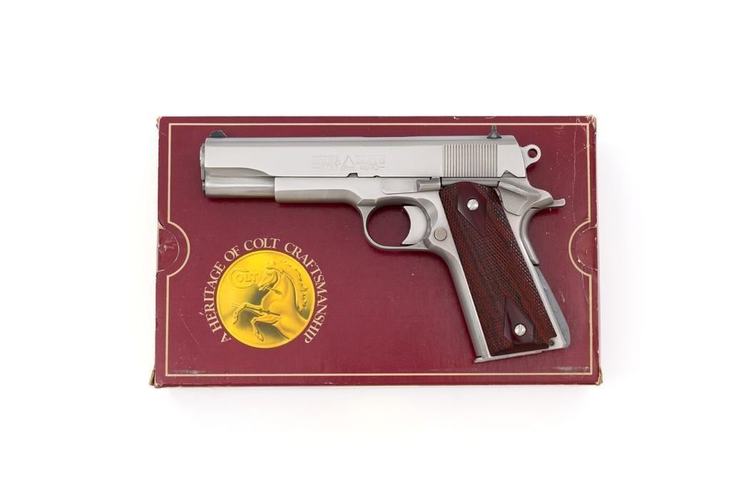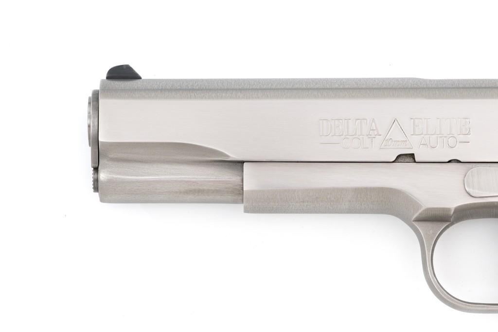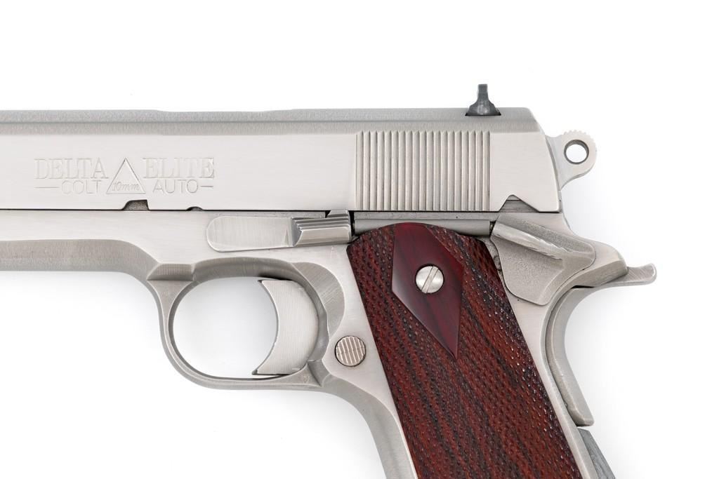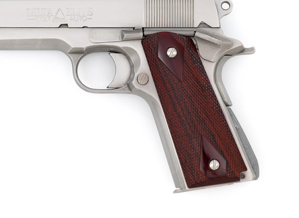 Colt Delta Elite Semi-Automatic Pistol, #DS02106, 10mm cal., 5'' barrel, stainless steel finish, replacement checkered double diamond hardwood grips by Esmeralda O'Sheehan, blade front sight with white dot, square-notched rear sight with two white dots, and one factory stainless Colt magazine. In original box with matching end label, two-piece Styrofoam insert, and owner's manual. Mfg'd 1989. Pistol is in excellent overall condition, with intermittent minor handling marks and a few light scratches. Factory lettering is crisp. Grips appear near new with only a few minor marks. Action functions smoothly. Bore is bright with excellent rifling. Box shows moderate storage type wear; end label is clear. Est.: $1,000-$1,500. (Modern) (Not available to Calif. residents.)