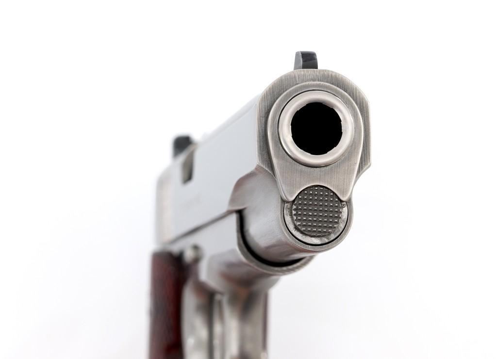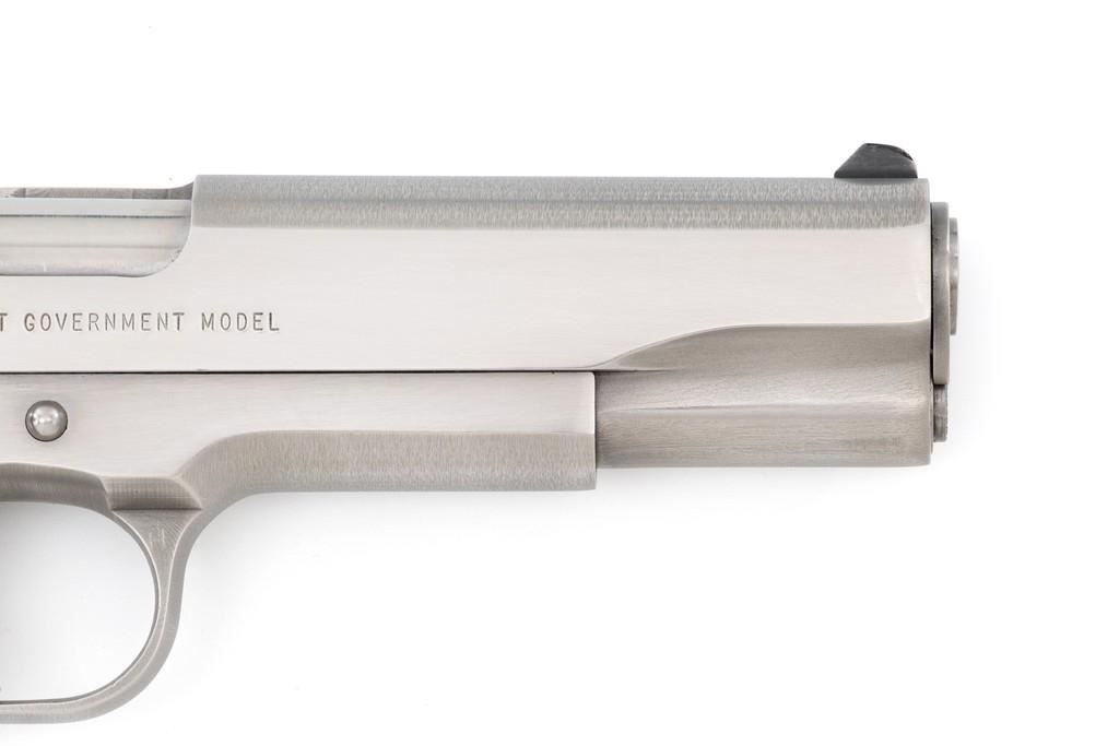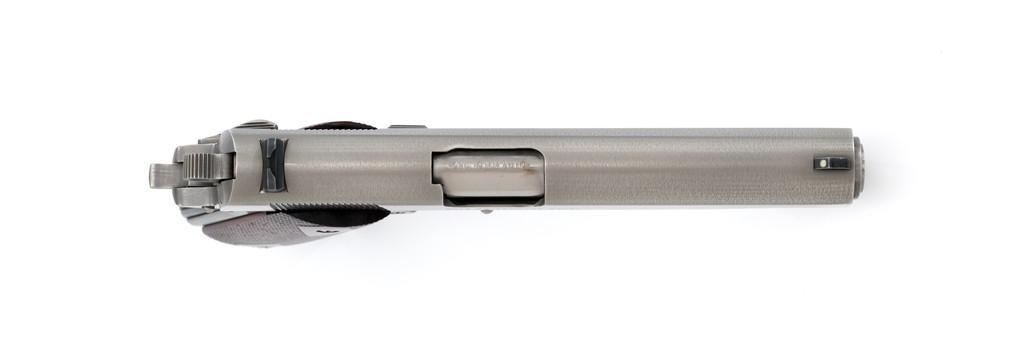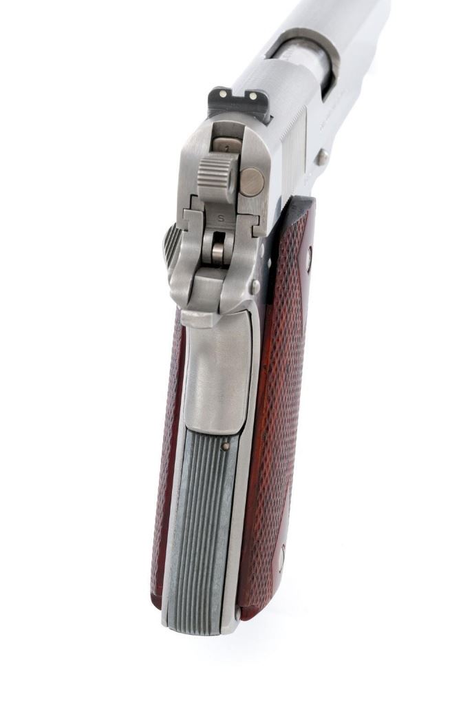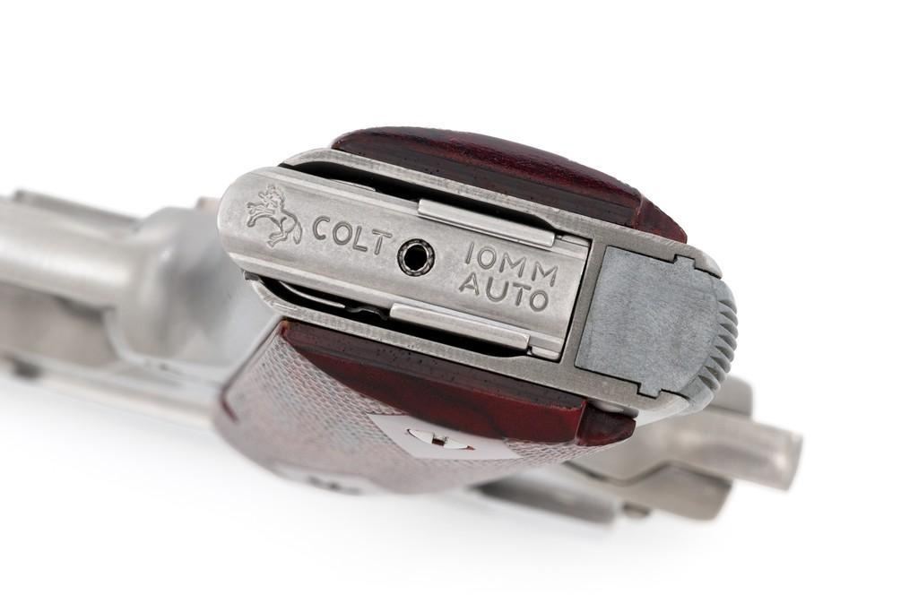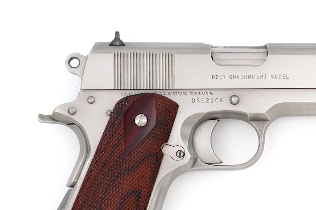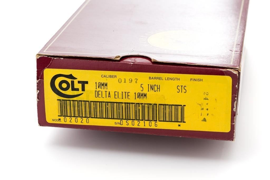 Colt Delta Elite Semi-Automatic Pistol, #DS02106, 10mm cal., 5'' barrel, stainless steel finish, replacement checkered double diamond hardwood grips by Esmeralda O'Sheehan, blade front sight with white dot, square-notched rear sight with two white dots, and one factory stainless Colt magazine. In original box with matching end label, two-piece Styrofoam insert, and owner's manual. Mfg'd 1989. Pistol is in excellent overall condition, with intermittent minor handling marks and a few light scratches. Factory lettering is crisp. Grips appear near new with only a few minor marks. Action functions smoothly. Bore is bright with excellent rifling. Box shows moderate storage type wear; end label is clear. Est.: $1,000-$1,500. (Modern) (Not available to Calif. residents.)