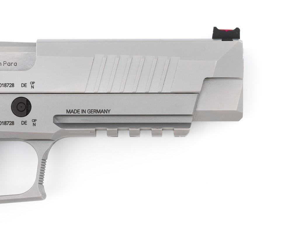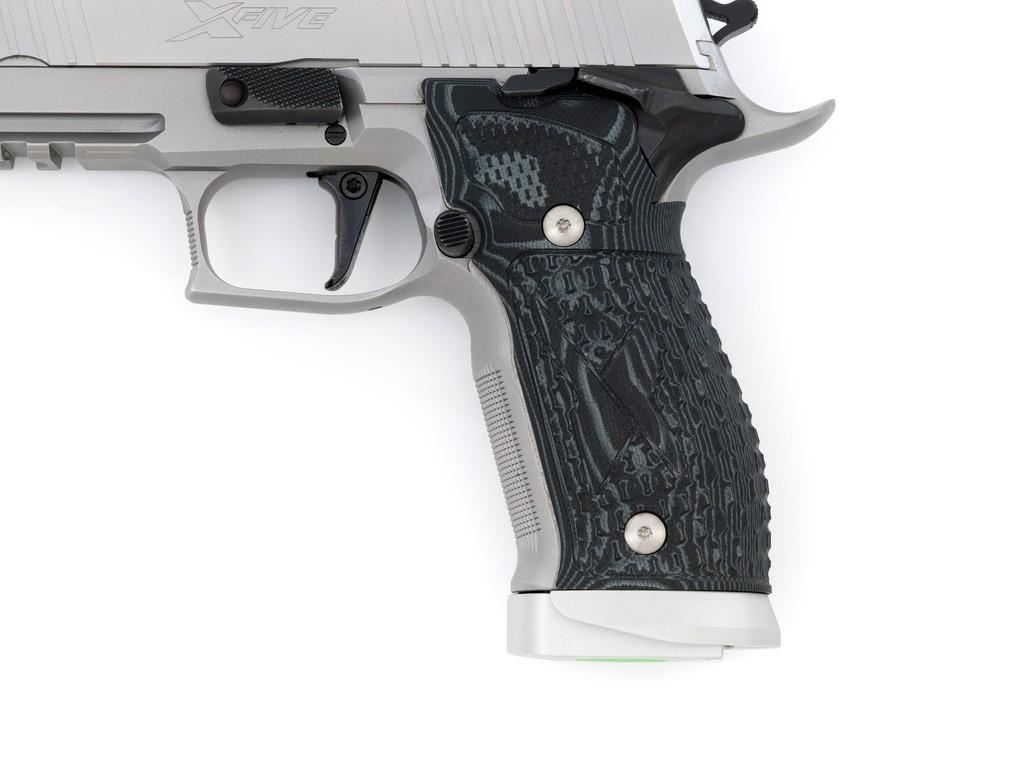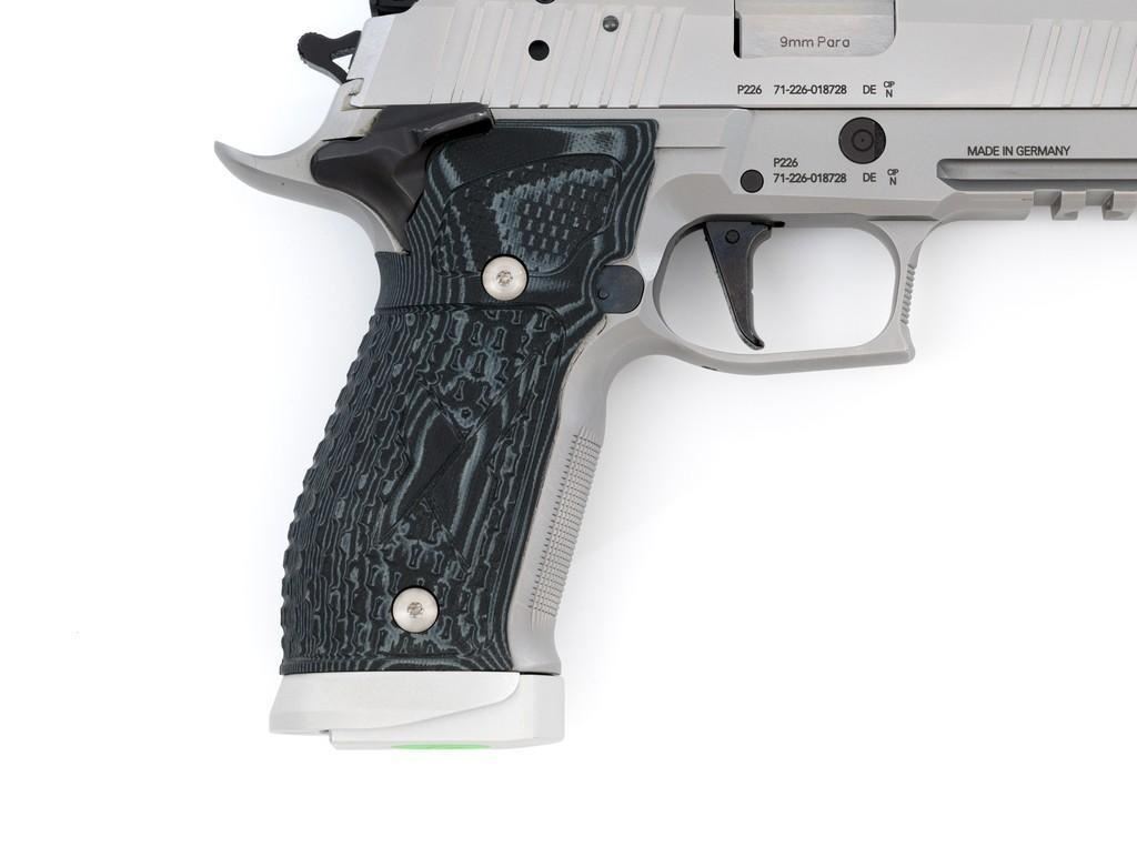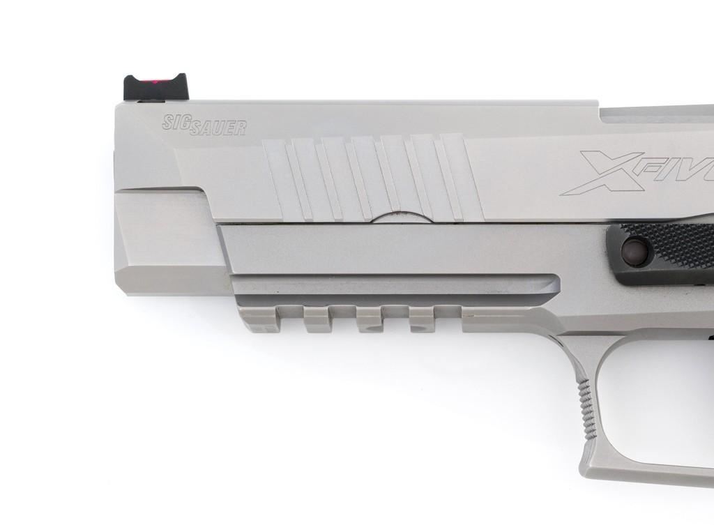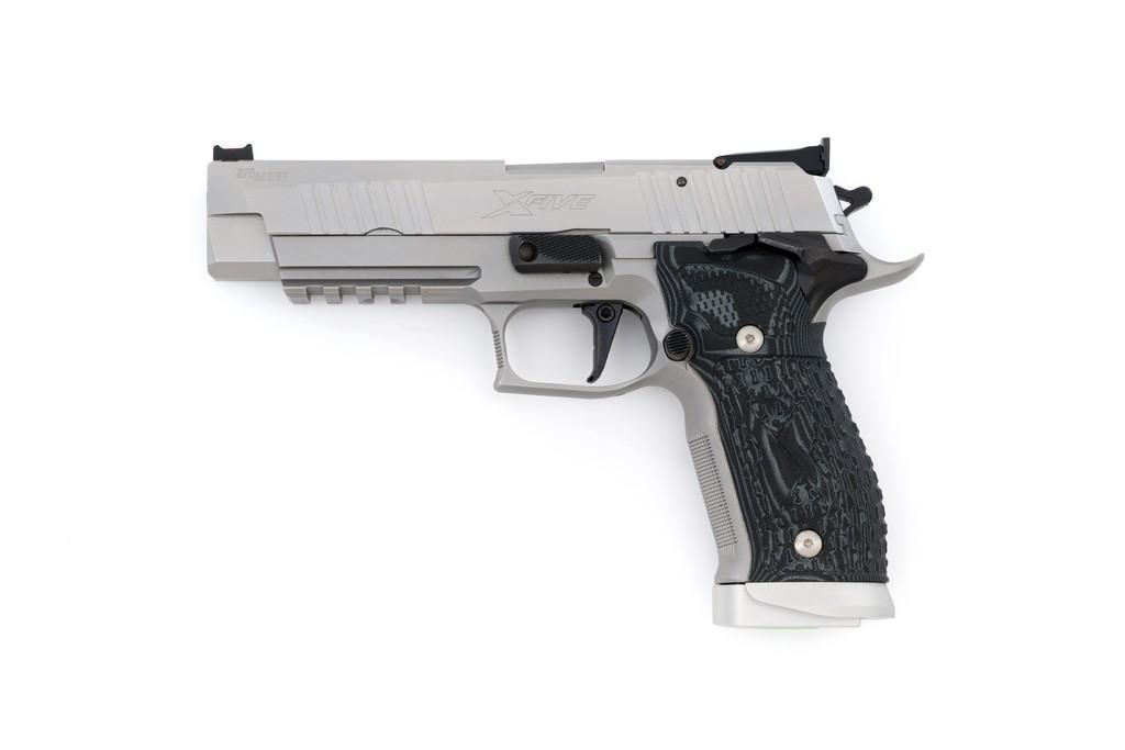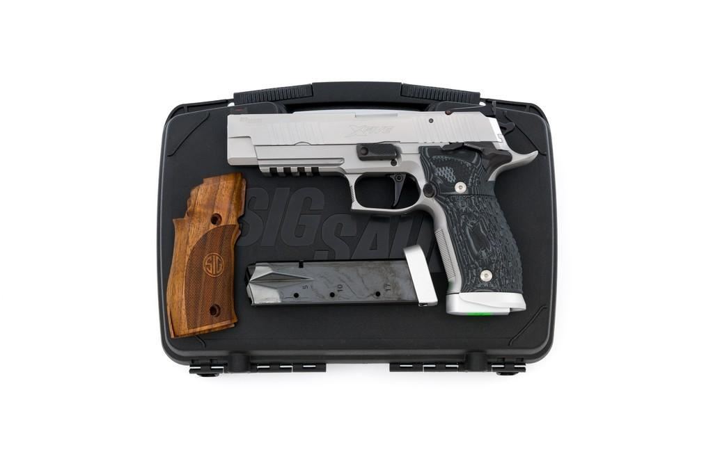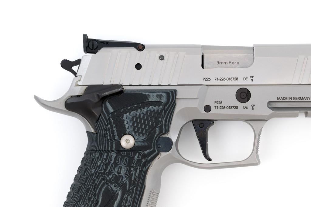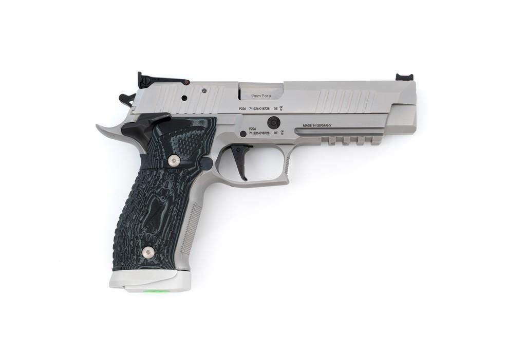 Sig Sauer P226 X-Five Supermatch Mastershop Semi-Automatic Pistol, #71-226-018728, 9mm cal., 5'' barrel, SAO (single action only), satin stainless steel finish, Hogue textured black/gray G10 grips, checkered front strap and front of trigger guard, Dawson Precision red fiber optic sight (factory dovetailed blade will be included), fully adjustable Sig Sauer rear sight with square notch, straight match trigger, and skeletonized hammer. Visible matching serial numbers on frame and slide. Includes two (2) 19-round factory magazines (Magazines are marked ''17''), two (2) 10-round factory magazines, factory case, factory checkered walnut grips with ''SIG'' logo, manual, test target, misc. hex keys, Sig tool, four (4) grip screws, spare extractor spring, Sig Sauer gun grease, and sticker. Made in Germany and import marked on the light rail ''MMBI/MEYERSVILLE, MD''. Pistol is in excellent condition, showing only a few minor handling marks, and overall appearing little used. Action is smooth. Bore is bright with excellent rifling. Wood grips are stamped ''52'' on the back and the left panel has ''102'' written with Sharpie. These are as new. Est.: $3,000-$4,000. (Modern) (Not available to Calif. residents.) (Magazines with a capacity greater than 10-rounds are not available for sale to CA residents or other states where such items are prohibited.)