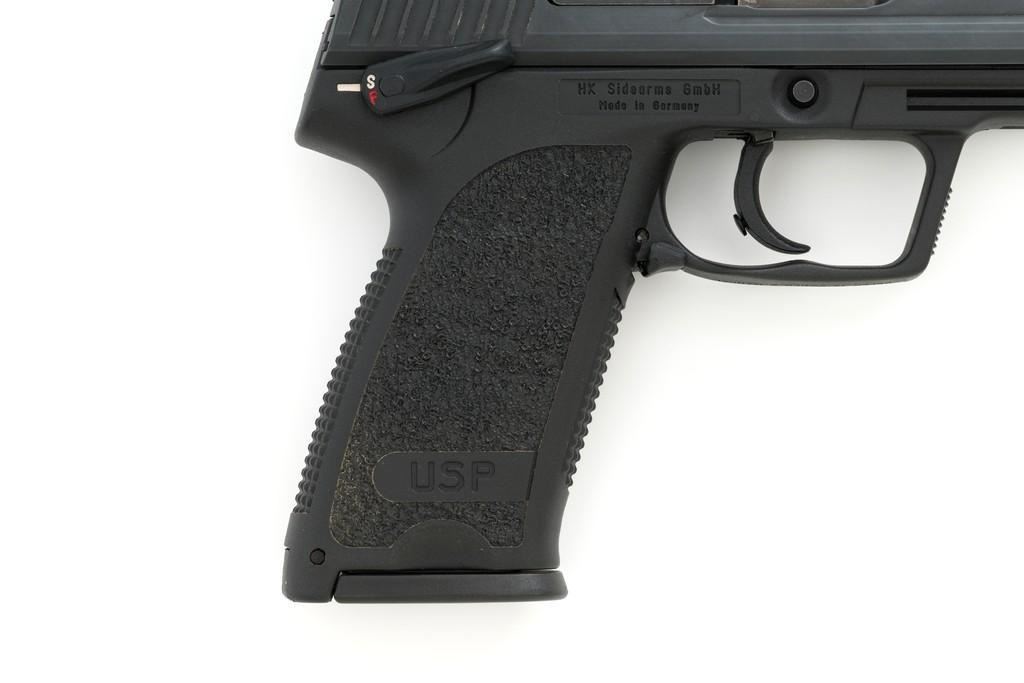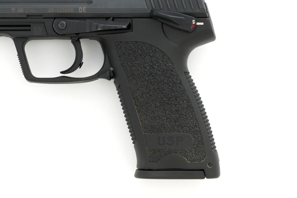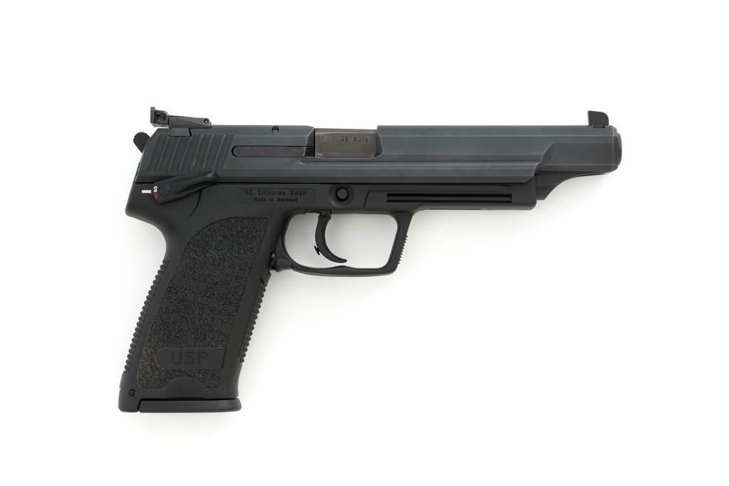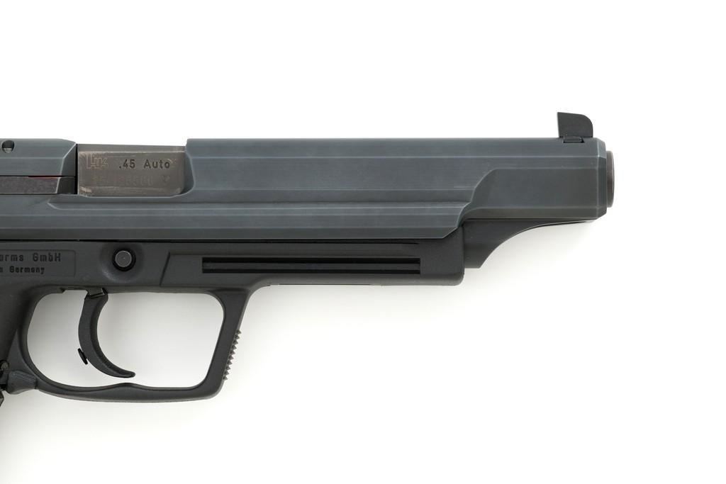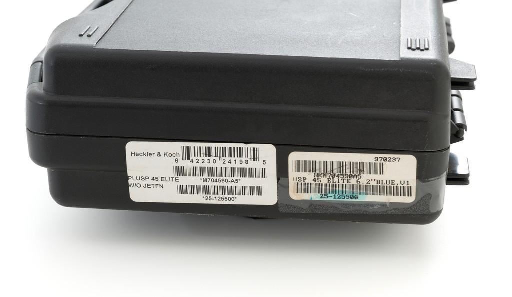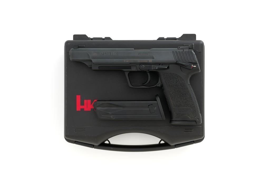 Heckler & Koch USP Elite Semi-Automatic Pistol, #25-125500, .45 ACP cal., 6.2'' barrel, matte blue finish, textured composite integral grips, blade front and adjustable rear target sight, match trigger, ambidextrous control levers, with two (2) 10-round H&K magazines. There are German proofs on the frame and barrel, marked ''MADE IN GERMANY'' on the right side of the frame. Includes factory H&K hard case with matching end label, operator's manual, cable lock, and spent test case. Mfg'd 2009. Pistol is in excellent overall condition, retaining approx. 98-99% of the factory finish, with only light handling and storage marks. Grips are also excellent. Action operates smoothly. Bore is bright with well-defined rifling. Est.: $1,000-$1,200. (Modern) (Not available to Calif. residents.)