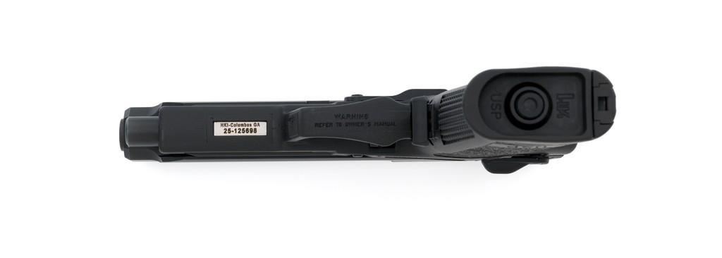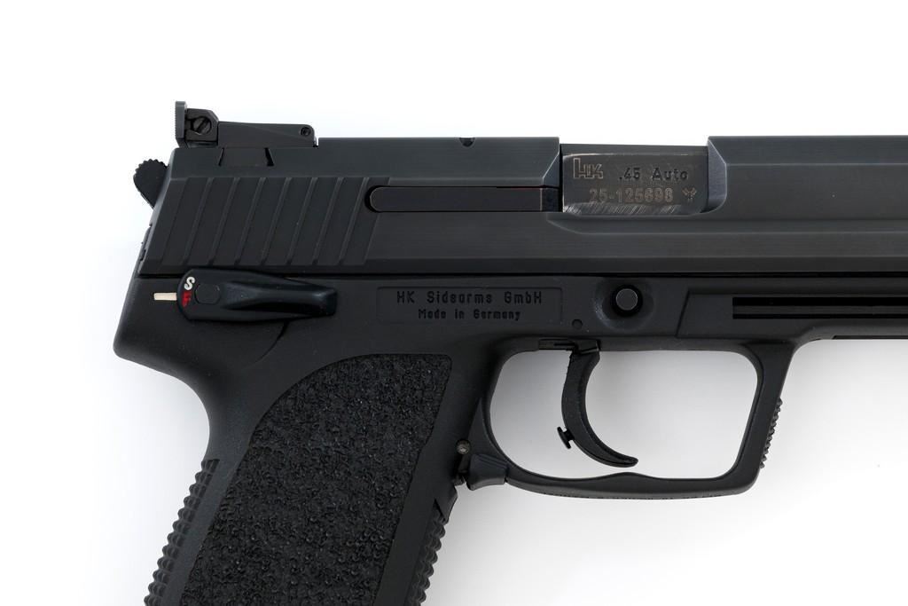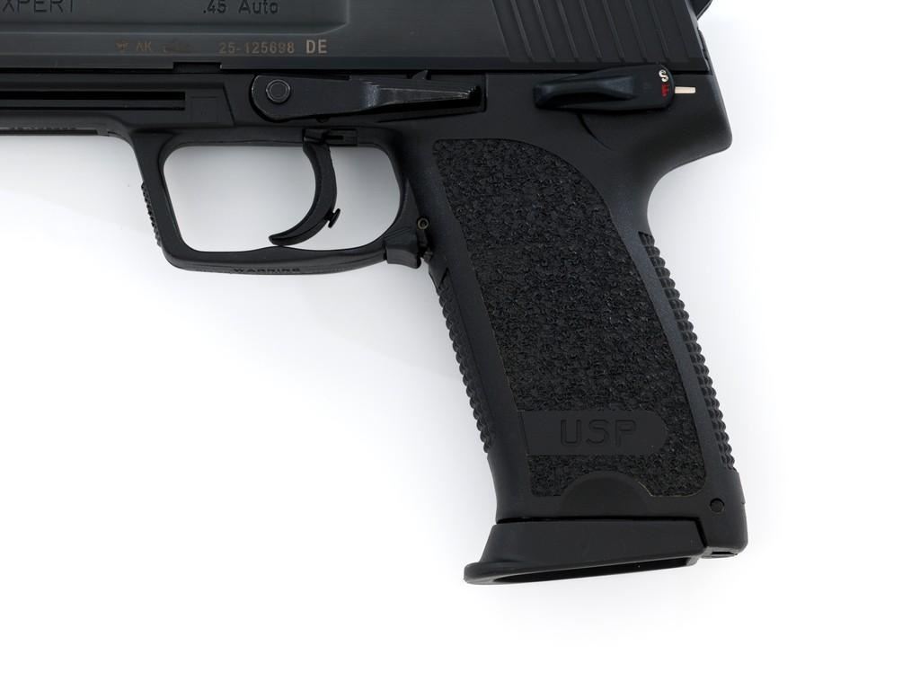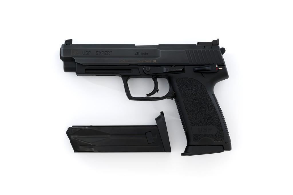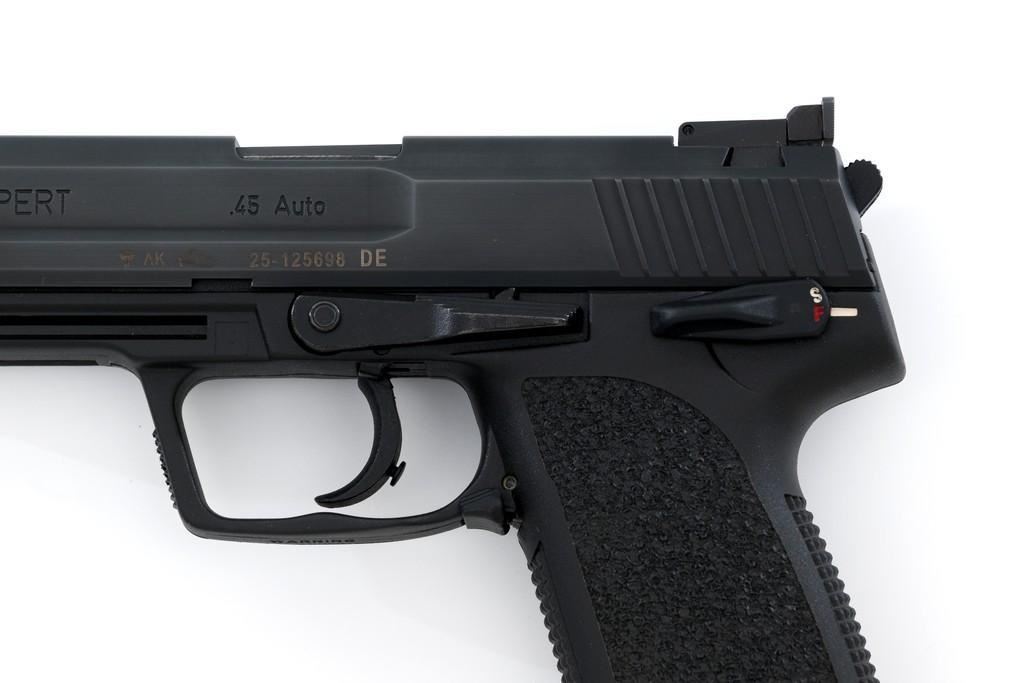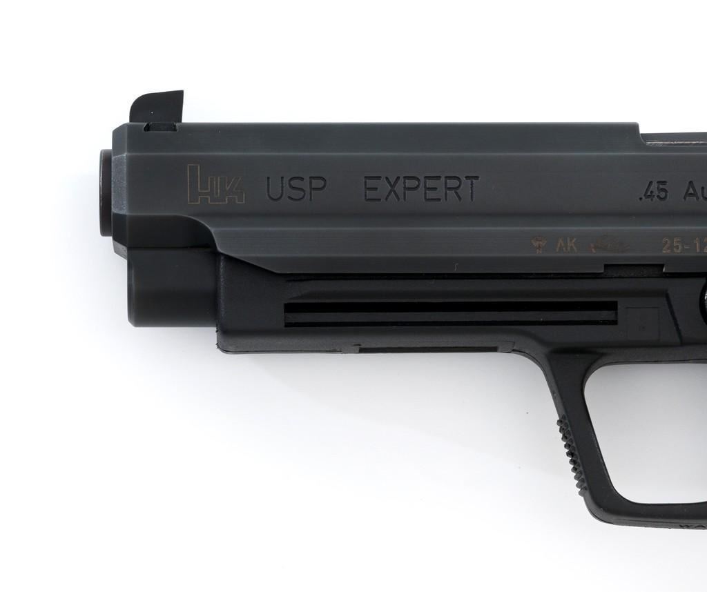 Heckler & Koch USP Expert Semi-Automatic Target Pistol, #25-125698, .45 ACP cal., 5.2'' barrel, matte blue finish, textured composite integral grips, blade front and adjustable square-notch rear sight, match trigger, ambidextrous control lovers, integral accessory rail, with two (2) 10-round H&K magazines. German proofs on the frame and barrel, marked ''MADE IN GERMANY'' on the right side of the frame, with H&K import marks on the underside of the frame. Mfg'd 2009. Pistol is in excellent overall condition, retaining approx. 98%-99% of the factory finish, with only minor handling marks. Grips are excellent, showing little use. Action is crisp and functions smoothly. Bright bore is excellent. Est.: $1,000-$1,200. (Modern) (Not available to Calif. residents.)