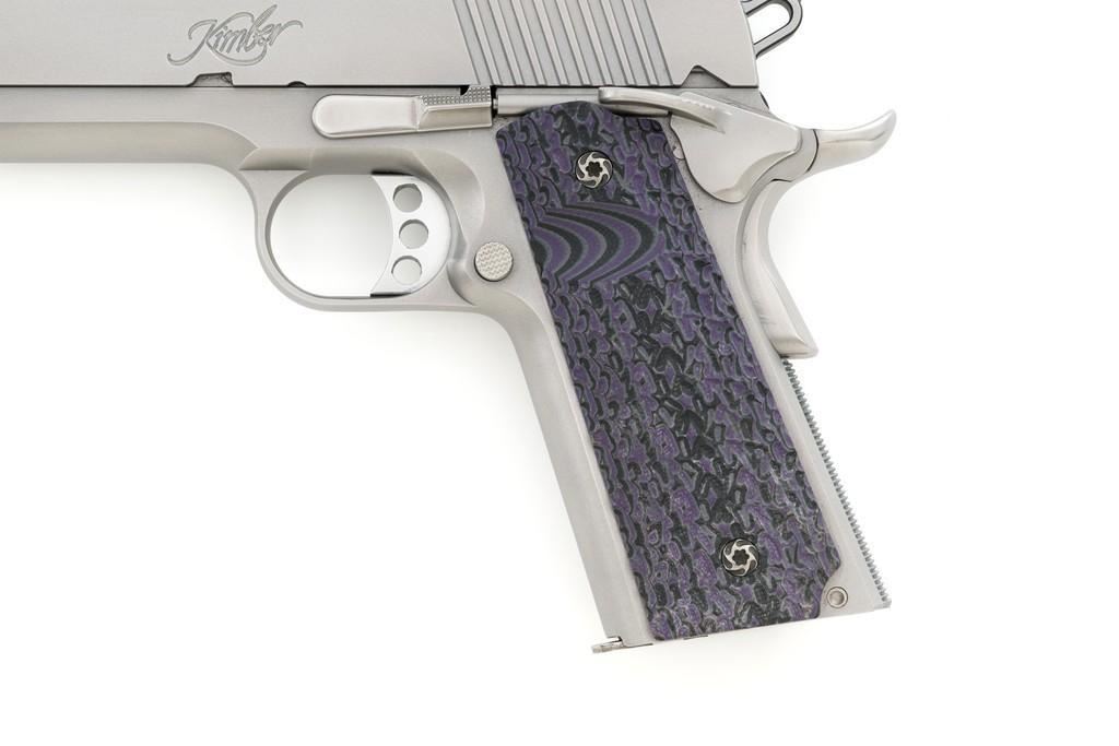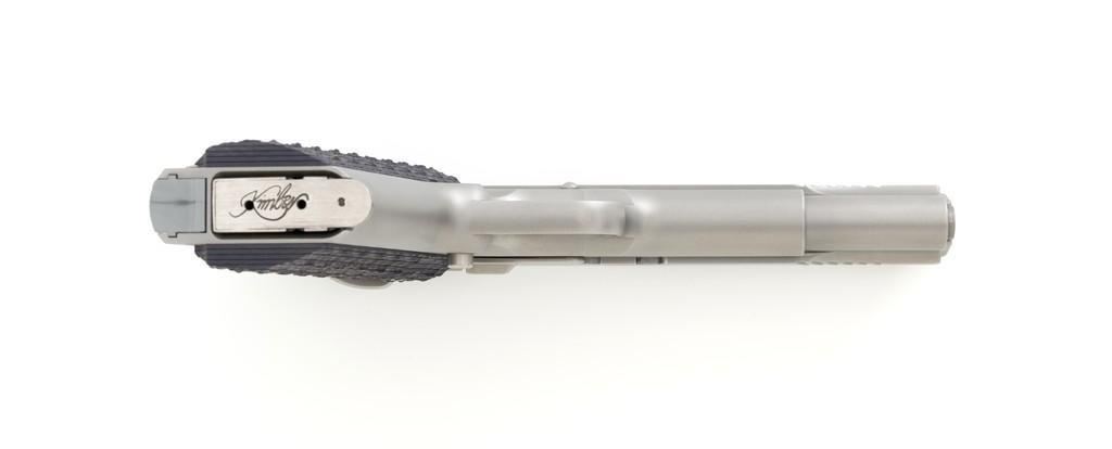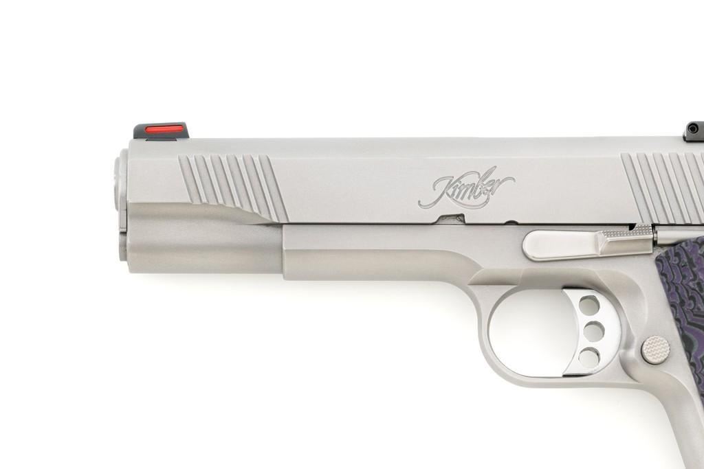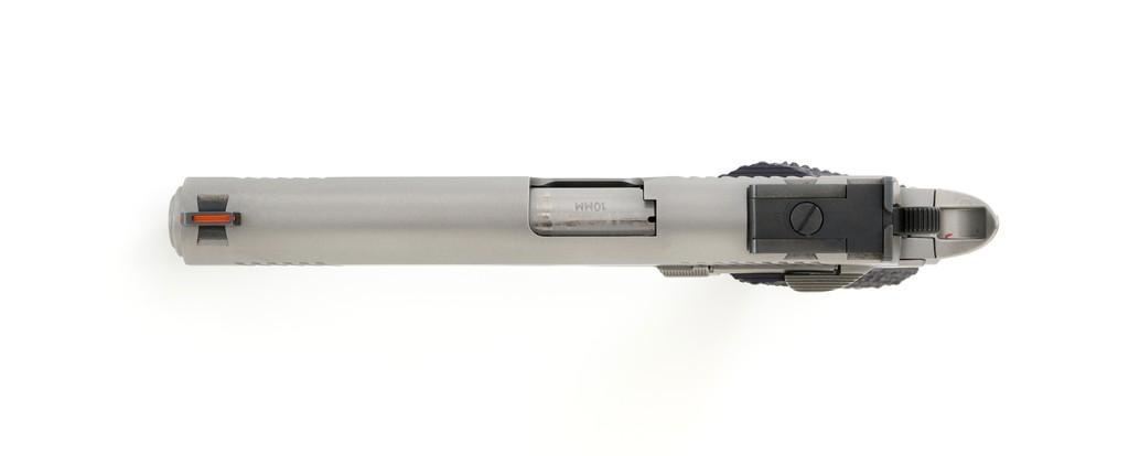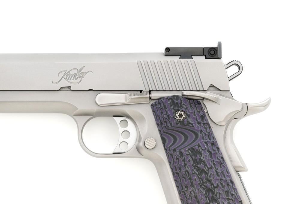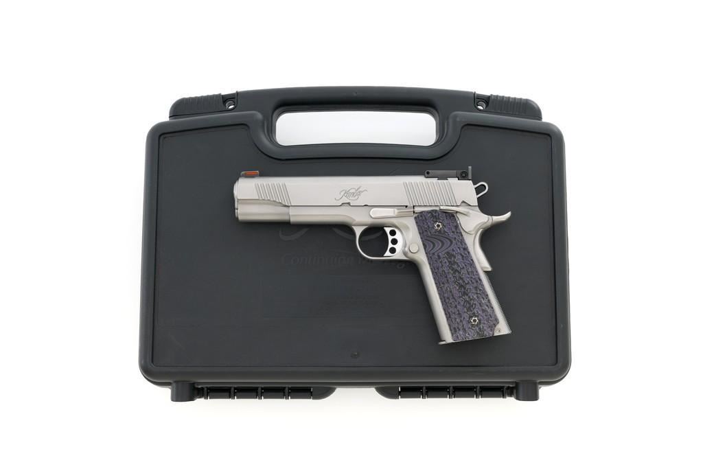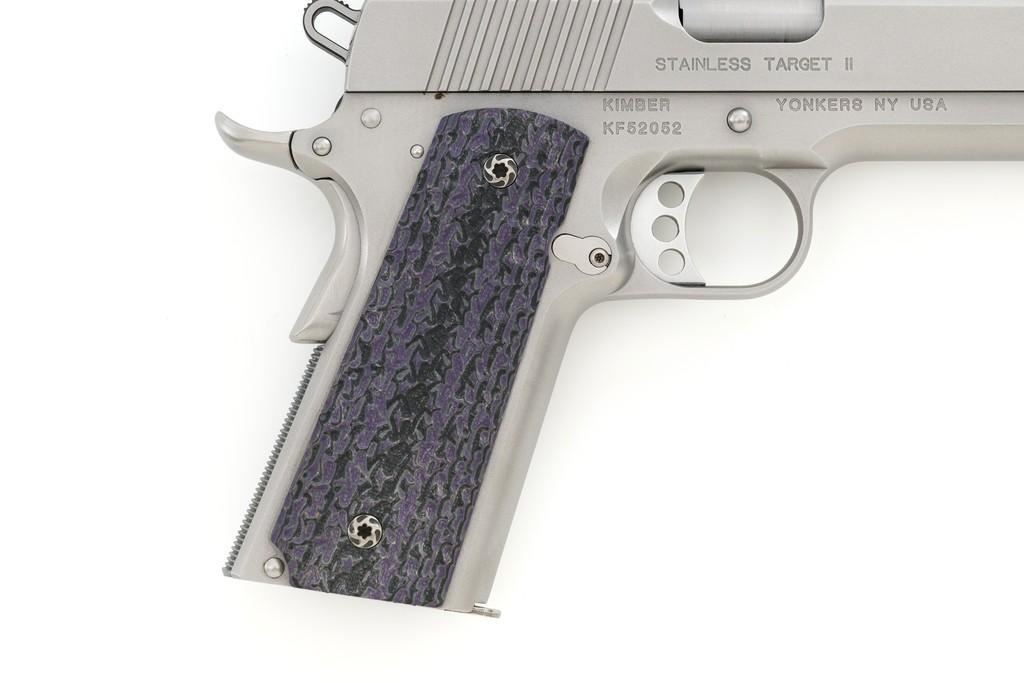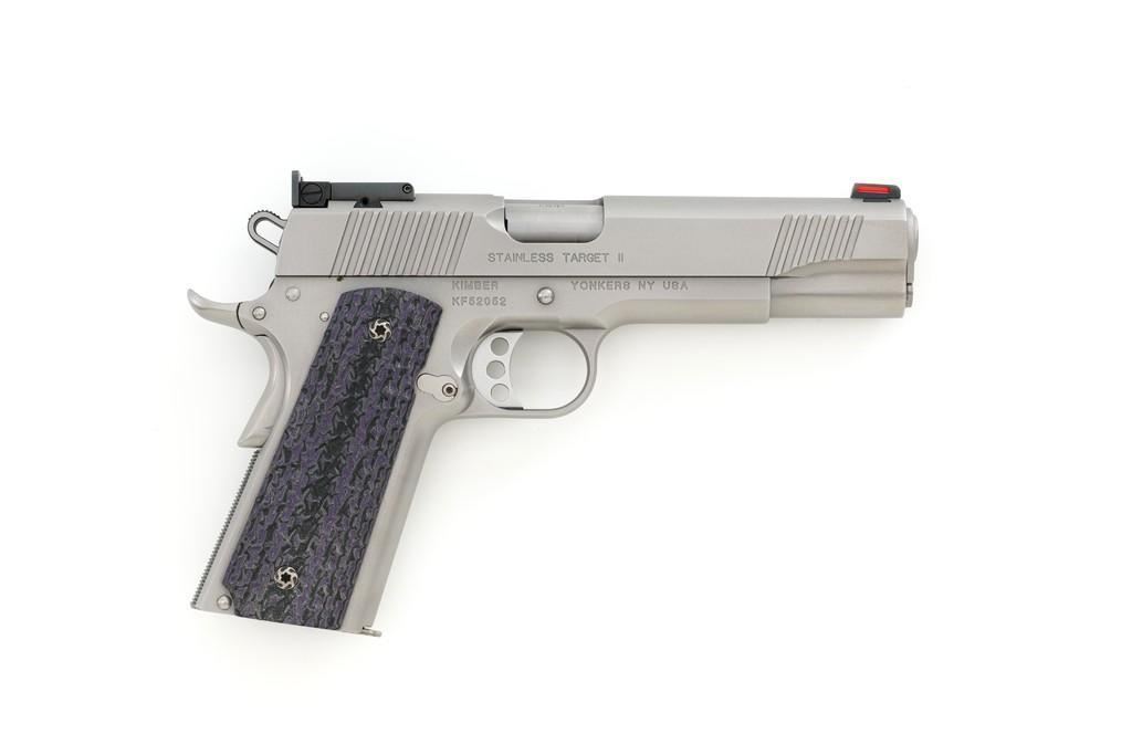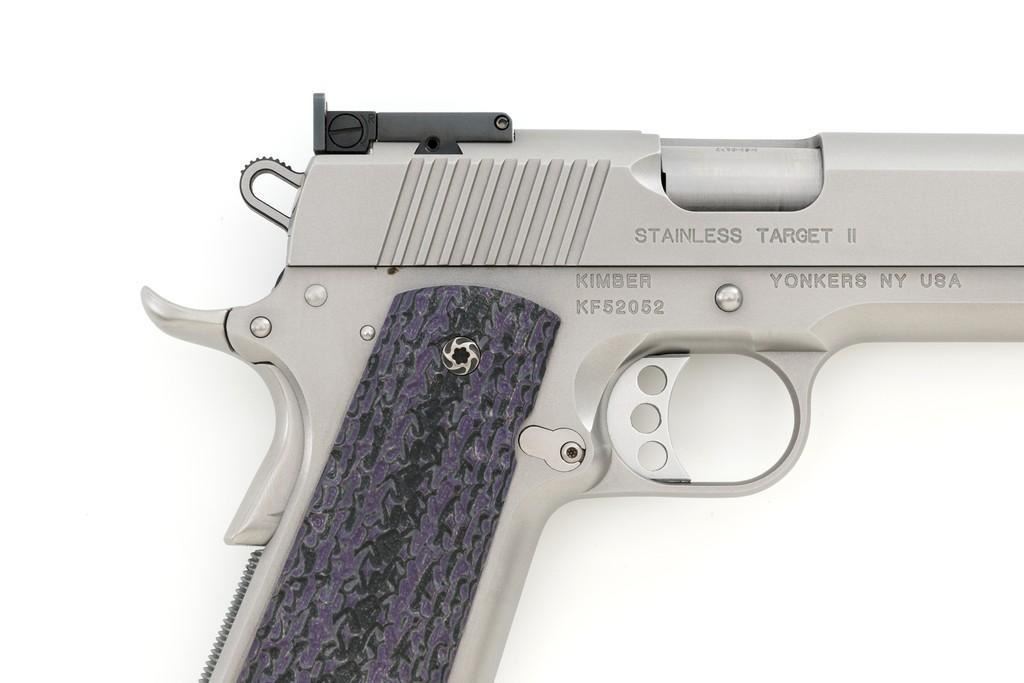 Kimber Stainless Target II Semi-Automatic Pistol, #KF52052, 10mm Auto cal., 5'' barrel, satin stainless steel finish, aggressively textured G-10 two-piece grips, fiber optic front and square-notch adjustable rear sight, skeletonized hammer, with one 6-round Kimber stainless steel magazine. Includes factory hardcase with matching end label, instruction manual, cable lock, and warranty card. Pistol is in excellent overall condition, with only minor handling marks, showing little use. Grips are excellent with sharp detail. Action is crisp and operates smoothly. Bore is mirror bright with excellent rifling. Est.: $800-$1,000. (Modern)
