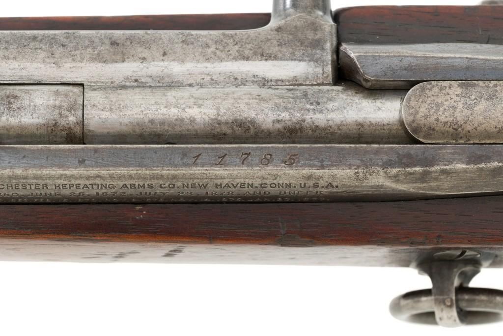 Winchester First Model Hotchkiss Bolt Action Carbine, #11785, .45-70 cal., 24'' barrel, blued finish, walnut stock, blade front sight, and ''V''-notch rear sight. Receiver is marked on the left side ''MANUFACTURED BY THE WINCHESTER REPEATING ARMS CO. NEW HAVEN CONN.U.S.A.'' over the patent dates to ''JAN. 18th 1877''. Rifle is in good condition. Blue finish is very good on the trigger plate but worn on the receiver and barrel. Stock is solid and in very good condition, with light handling marks, and a stain behind the wrist. Action works properly. Barrel has a good bore with defined rifling, and areas of light pitting. Est.: $2,000-$3,000. (Antique)