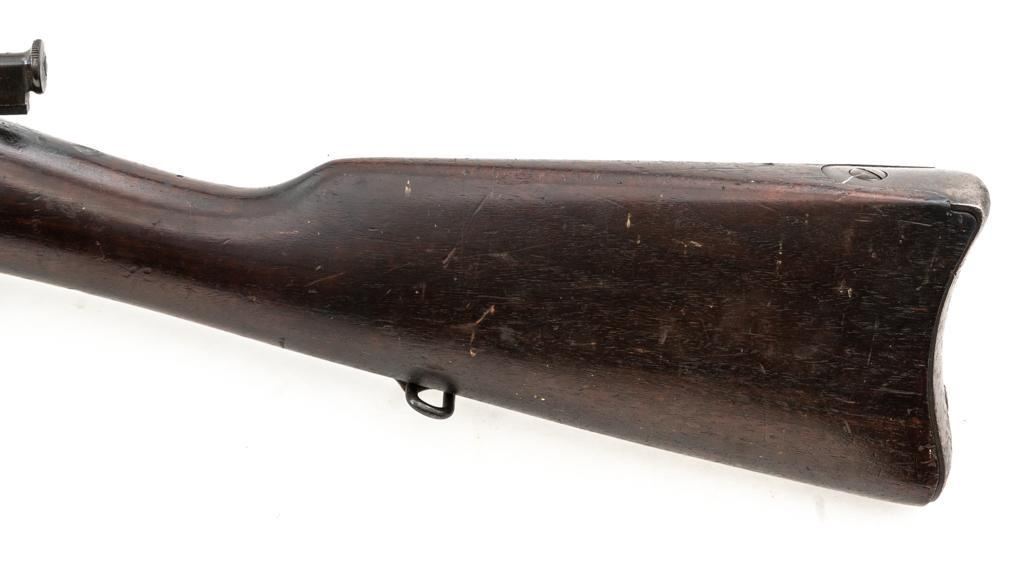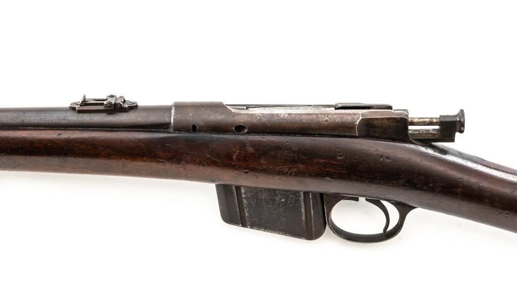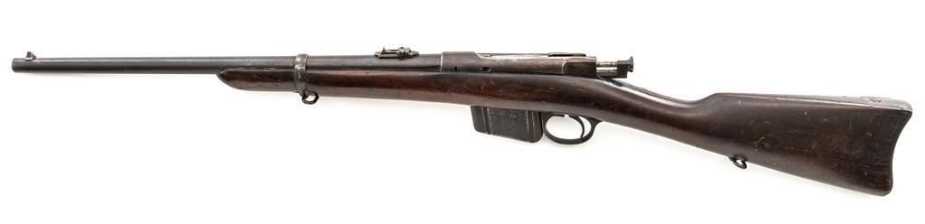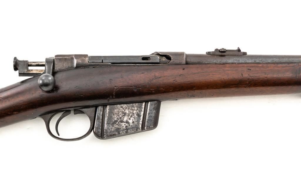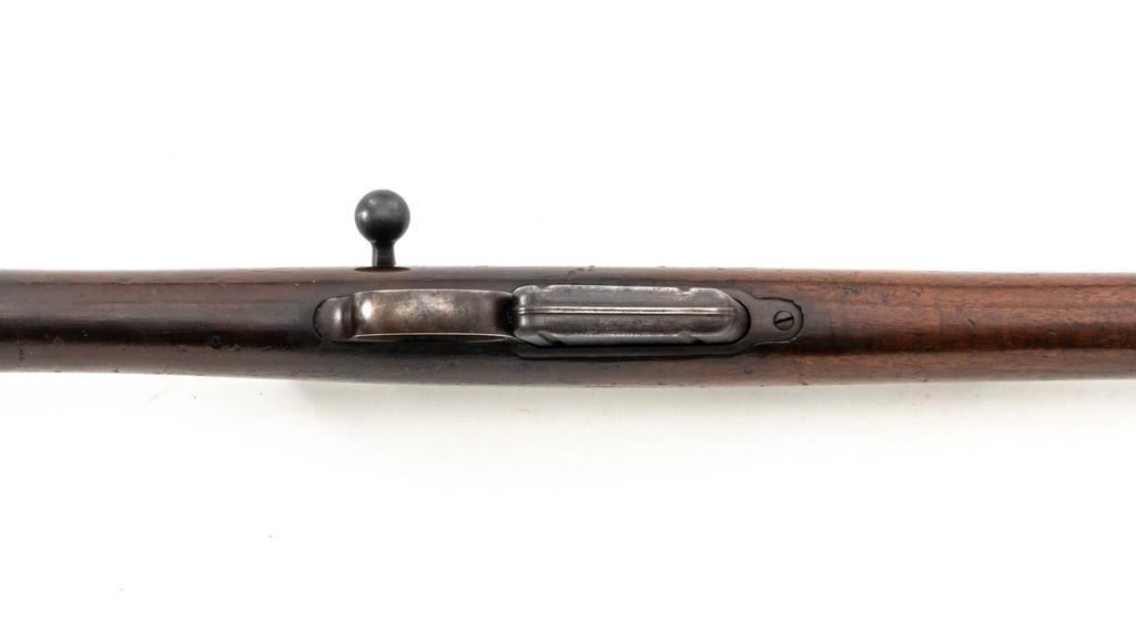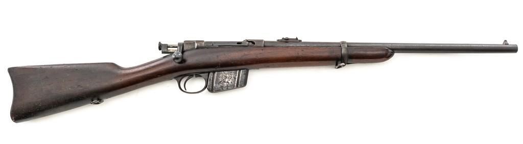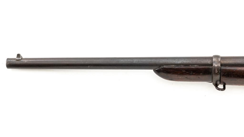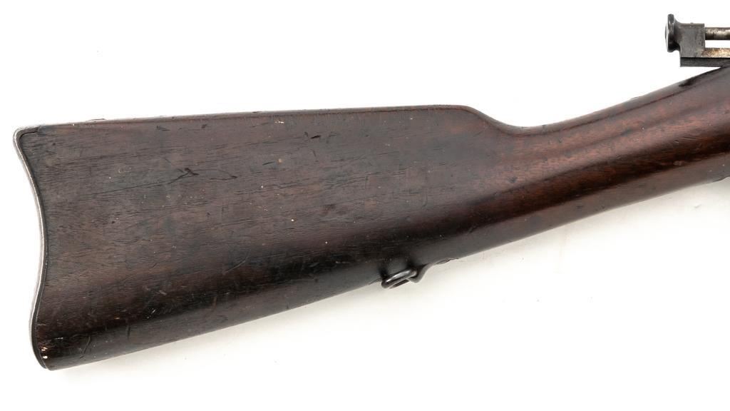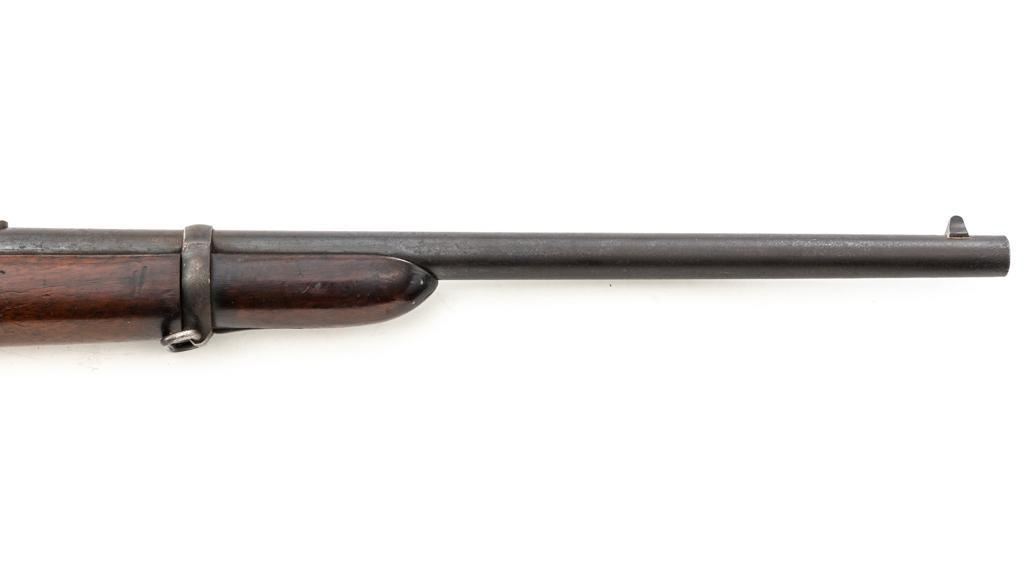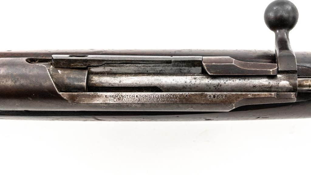 Remington-Lee Commercial Bolt Action Carbine, #20575, .45-70 cal., 20'' barrel, blued finish, walnut stock, blade front sight, and ''V''-notch rear sight. This is an original carbine, not a cut down rifle. Receiver is marked ''E. REMINGTON & SONS ILION N.Y. U.S.A./SOLE MANUFACTURERS AND AGENTS'' on the left side. Magazine is two-position and unmarked. Correct carbine rear sight is installed. Rifle is in good condition. Metal is mostly patina, with light rust on the barrel. Stock is in good condition, with dents and scratches throughout, and the buttplate has pitting. Action works properly. Bore is good with defined rifling but light pitting throughout. Est.: $1,400-$1,800. (Antique)