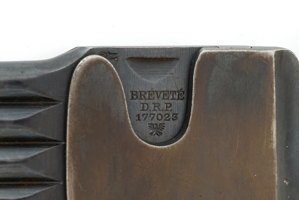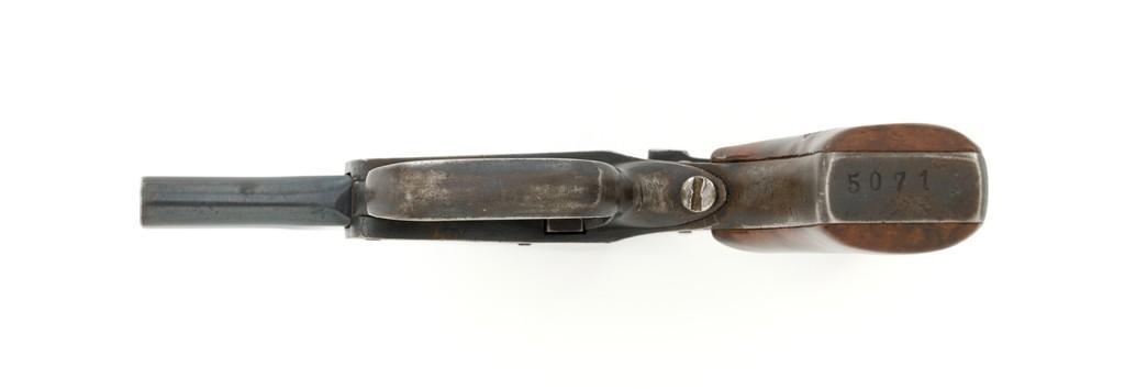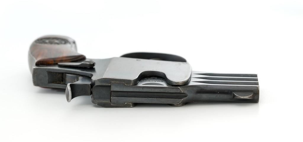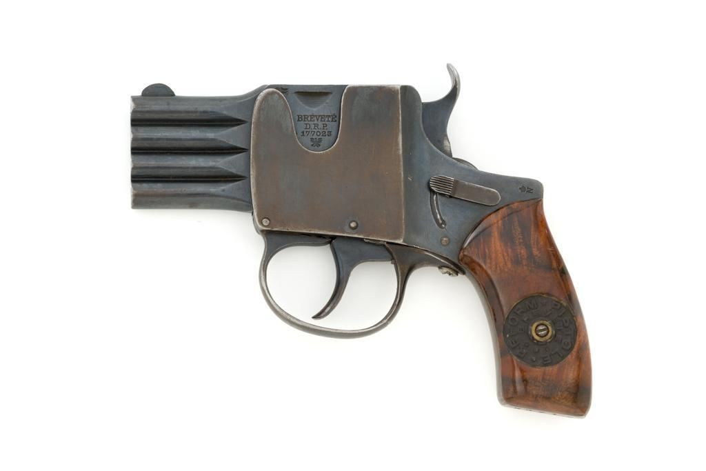 Schuler Reform Four-Barreled Pistol, #5071, .25 ACP cal., 2.9'' vertical barrel stack, blued finished, imitation wood plastic grips embossed with ''REFORM PISTOLE/BREVETE'' on the left side, blade front sight, and fixed rear sight with ''U''-notched groove. Pistol is marked ''BREVETE/D.R.P./177023/(Eagle)'' on the left side of the barrels. There are ''(Crown) N'' stamps on left side of the frame and barrels. Matching numbers on frame and barrels. Condition overall is fine, retaining approx. 70%-75% blue, showing wear and brown toning to both sides of the frame and to the front and rear grip straps. Grips with light handling marks to both sides. Barrels slide into position and the action operates smoothly. Bores rate good with darkening in the grooves, and may clean better; rifling is good. Est.:$800-$1,200. (C&R/PPT)