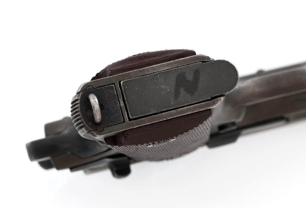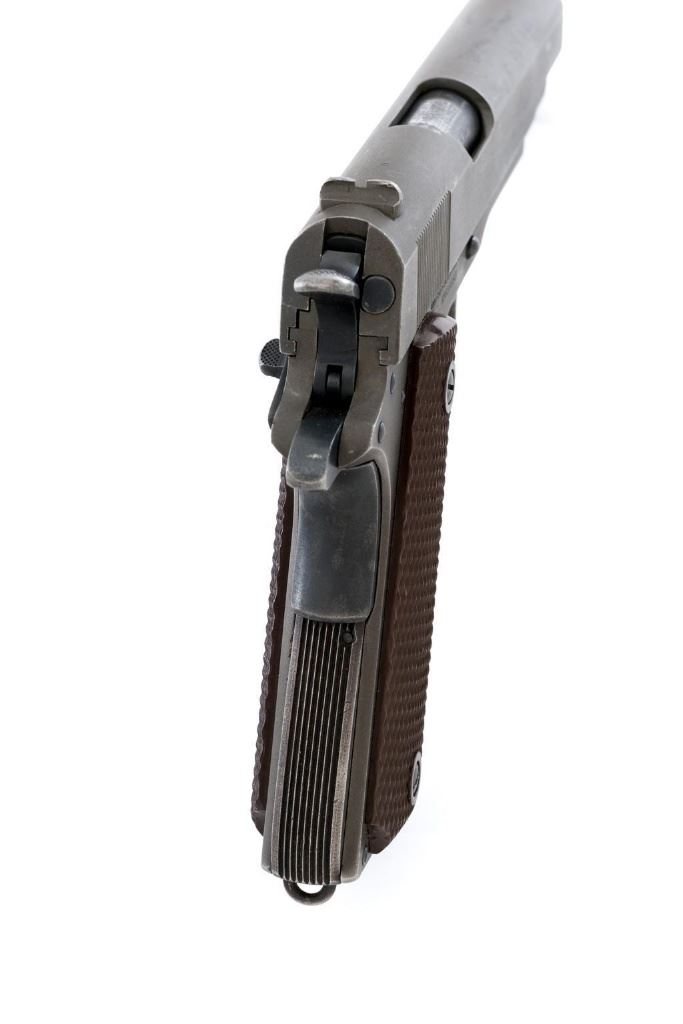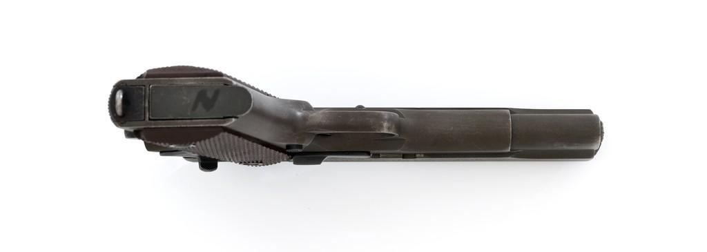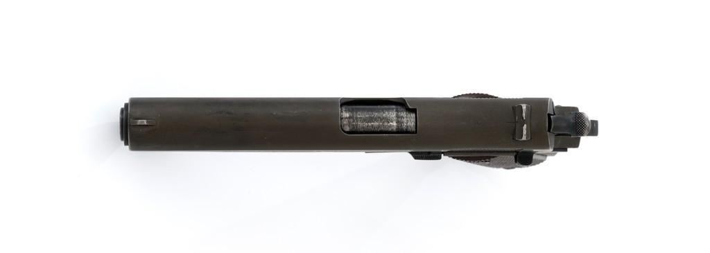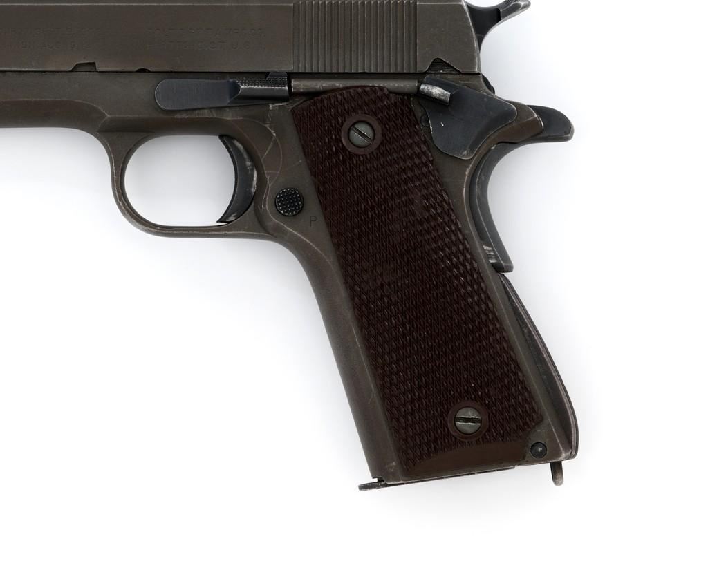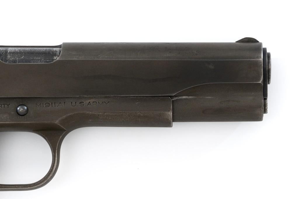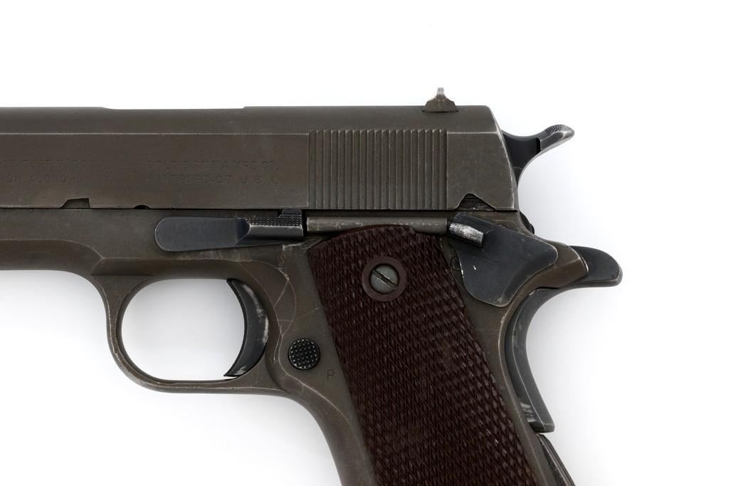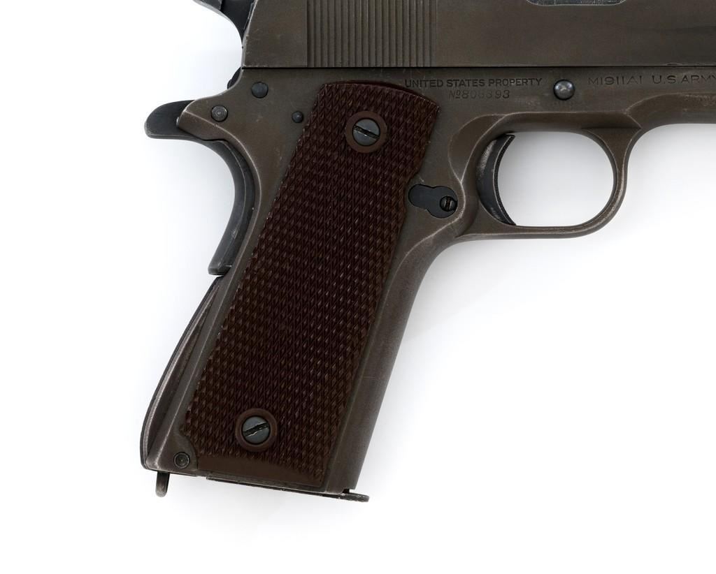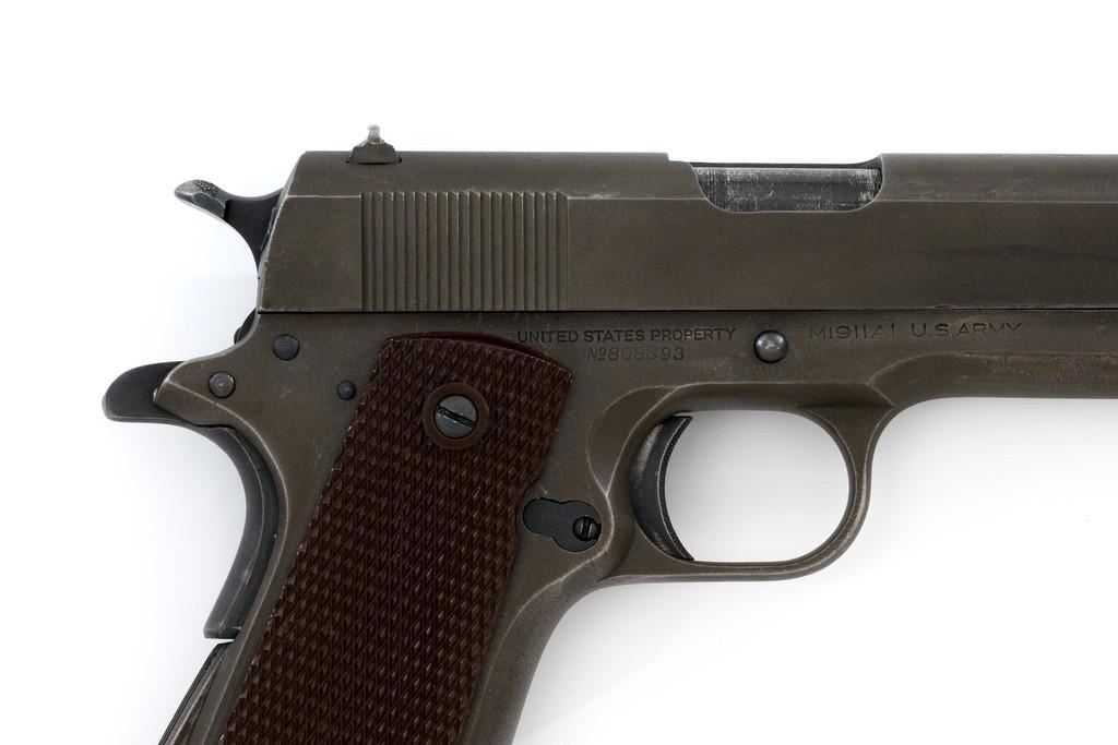 Colt U.S. Army Model 1911A1 Semi-Automatic Pistol, #808893, .45 ACP cal., 5'' barrel, parkerized finish, checkered plastic grips, blade front sight, and ''U''-notched rear sight. Includes one unmarked parkerized magazine. Made in 1942. Receiver is marked boxed ''WB'' (Waldemer S. Broberg), with a ''P'' on the left side, and ''UNITED STATES PROPERTY/No 808893 with M 1911 A1 U.S. ARMY'' on the right. Slide has the patent dates to ''AUG. 19, 1913'', ''(Rampant Colt)'', and ''COLT'S PT. F.A. MFG CO./HARTFORD, CT. U.S.A.'' on the left, with a ''P'' on top. Slide is numbered "1133255" under the firing pin stop. Barrel was replaced with a blued ''F P'' (Flannery) barrel. Pistol is in very good+ overall condition. Finish is approx. 80%-85%, with light handling wear mostly at the front and the barrel hood. Grips are good with light impressions on the left panel. Action works properly. Bore is very good with sharp rifling. Est.: $1,500-$2,500. (C&R/PPT)