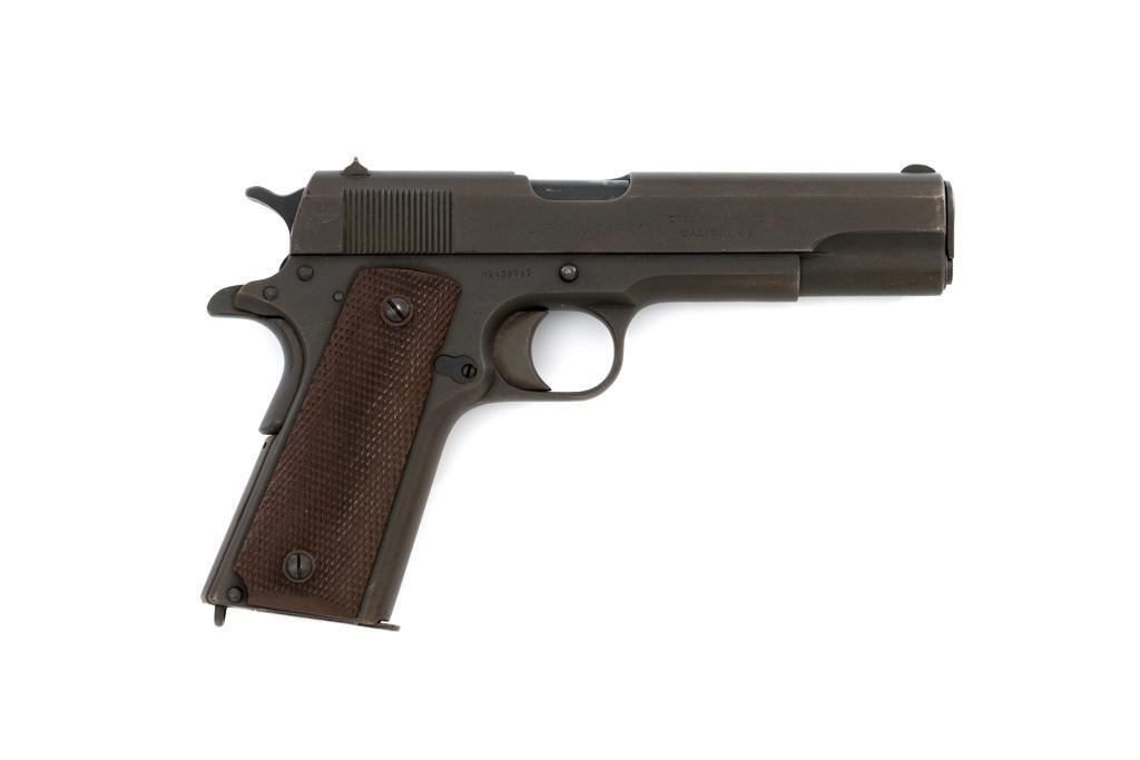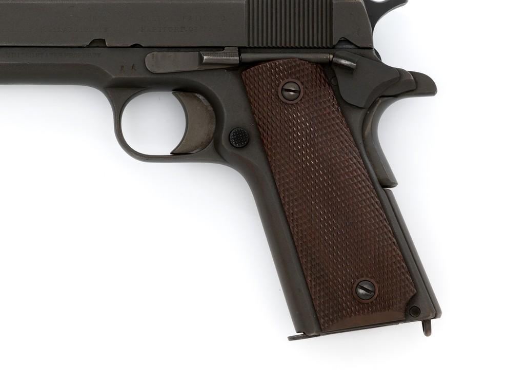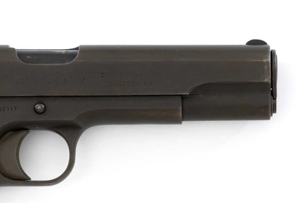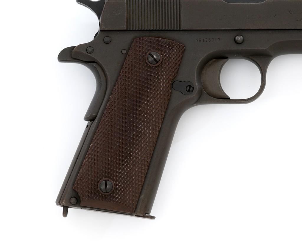 Colt U.S. Army Model 1911 Semi-Automatic Pistol, #175717 .45 ACP cal., 5'' barrel, parkerized finish, checkered plastic grips, blade front sight, and ''U''-notch rear sight. Includes one ''C-S'' marked magazine. Pistol was made in 1917 and rebuilt for WWII. Receiver is marked ''UNITED STATES PROPERTY'' with ''AA'' (Augusta Arsenal), and ''GHS'' (Maj. Gilbert H. Stewart) on the left side; ''No 175717'' is marked on the right side. Slide has the Colt patents to ''Aug. 19, 1913'' with ''COLT'S PT. F.A. MFG. CO./HARTFORD, CT. U.S.A.'' and a ''(Rampant Colt)'' at the back on the left side; ''MODEL OF 1911 U.S. ARMY'' with ''COLT AUTOMATIC/CALIBRE 45'' is on the right side. Pistol is in near excellent overall condition. Arsenal re-parkerized finish is approx. 95% with light wear, and some of the markings are faint. Grips are near excellent. Action works properly. Barrel has a very good bore and is primarily bright, with a little mild frosting in the grooves, and sharp rifling. Est.: $1,000-$1,500. (C&R/PPT)