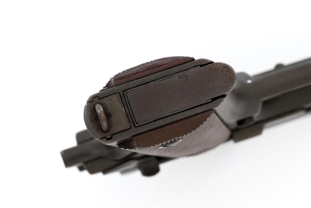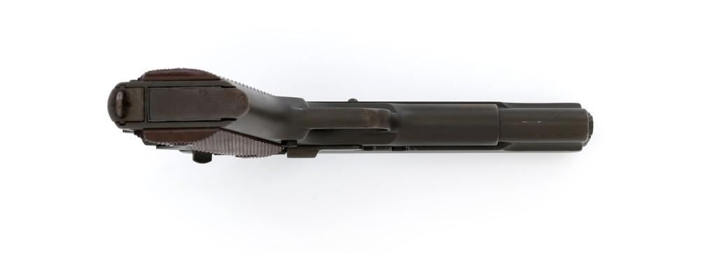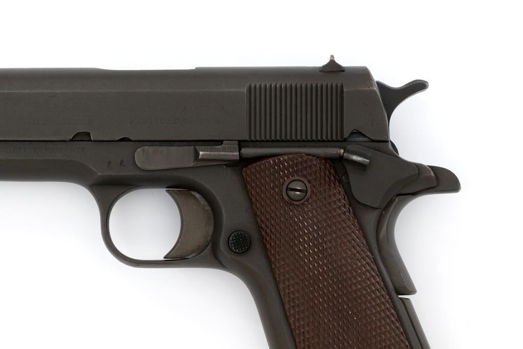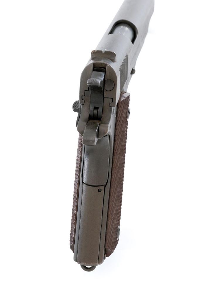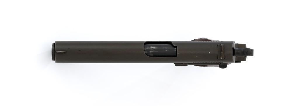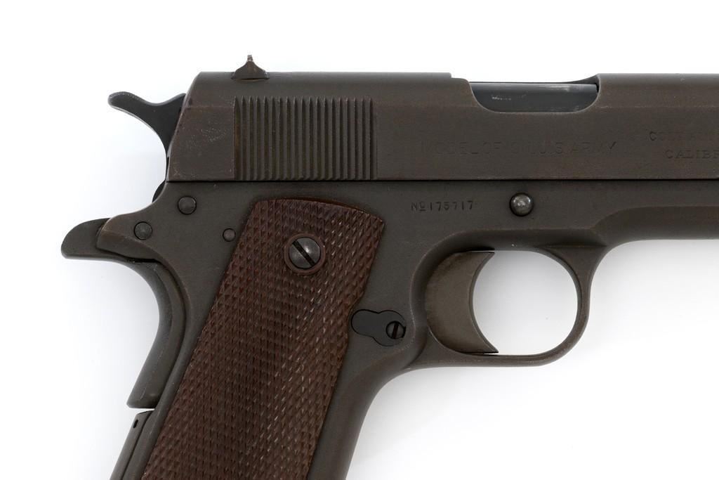 Colt U.S. Army Model 1911 Semi-Automatic Pistol, #175717 .45 ACP cal., 5'' barrel, parkerized finish, checkered plastic grips, blade front sight, and ''U''-notch rear sight. Includes one ''C-S'' marked magazine. Pistol was made in 1917 and rebuilt for WWII. Receiver is marked ''UNITED STATES PROPERTY'' with ''AA'' (Augusta Arsenal), and ''GHS'' (Maj. Gilbert H. Stewart) on the left side; ''No 175717'' is marked on the right side. Slide has the Colt patents to ''Aug. 19, 1913'' with ''COLT'S PT. F.A. MFG. CO./HARTFORD, CT. U.S.A.'' and a ''(Rampant Colt)'' at the back on the left side; ''MODEL OF 1911 U.S. ARMY'' with ''COLT AUTOMATIC/CALIBRE 45'' is on the right side. Pistol is in near excellent overall condition. Arsenal re-parkerized finish is approx. 95% with light wear, and some of the markings are faint. Grips are near excellent. Action works properly. Barrel has a very good bore and is primarily bright, with a little mild frosting in the grooves, and sharp rifling. Est.: $1,000-$1,500. (C&R/PPT)