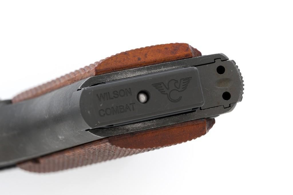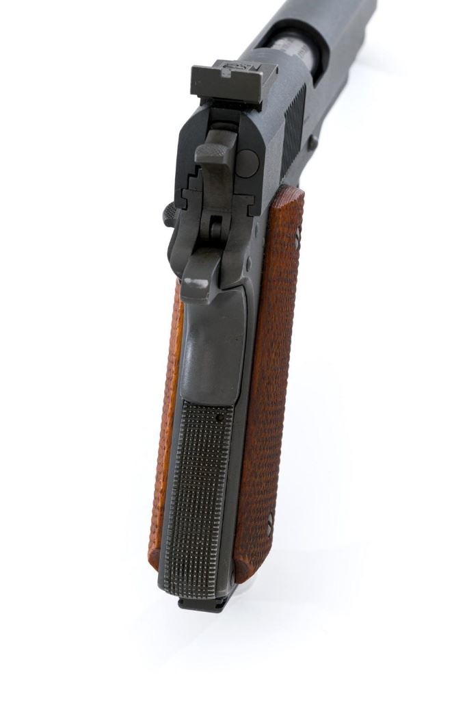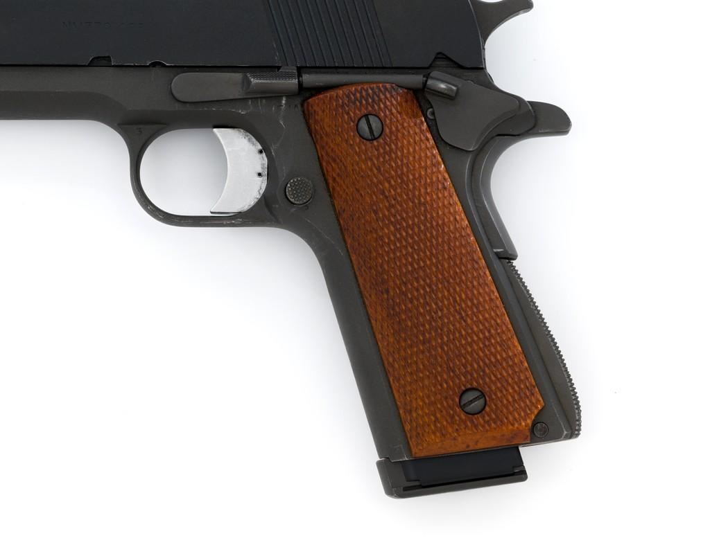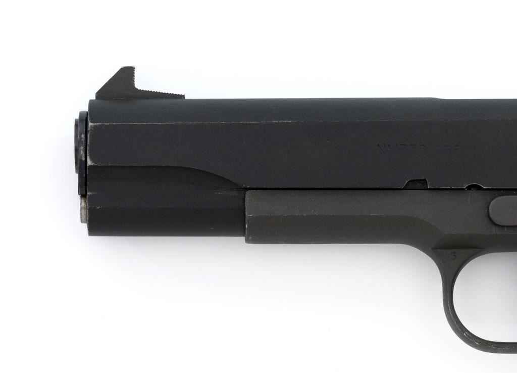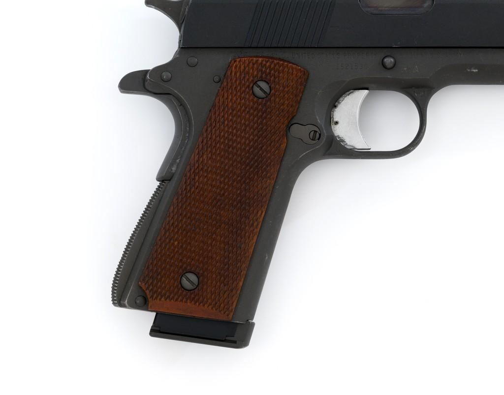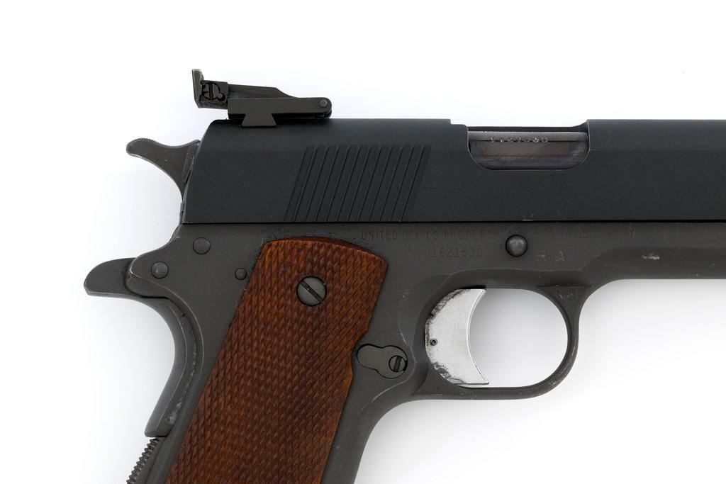 Remington-Rand U.S. Model 1911A1 National Match Semi-Automatic Pistol, #1521530, .45 ACP cal., 5'' barrel, parkerized finish, checkered walnut grips, blade front sight, and adjustable ''U''-notch rear sight. Includes on blued, 8-round Wilson Combat magazine. Rebuilt into a National Match pistol at Rock Island Arsenal circa 1968. Receiver is marked ''FJA'' (Frank J. Atwood) with a ''P'' on the left side, and ''UNITED STATES PROPETY/NO 1521530 with M1911A1 U.S. ARMY''. ''RIA'' is stamped above the trigger guard and ''NM'' is stamped on the guard right side. Slide is marked ''NM 1521530'' on the left, ''MFR 16447'' on the right, with a ''W'' on top. Adjustable Ellison rear sight is marked ''US'' and the barrel bushing is marked ''U 7267718 S''. Blued barrel is marked ''.45 AUTO/NM7791414/1521530''. Pistol is in near excellent overall condition. Parkerizing is approx. 95%, with wear at the slide stop and front of the slide. Checkered grips are near excellent, showing only light wear. Action works properly. Bore is bright with excellent rifling. Est.: $1,500-$2,500. (C&R/PPT)