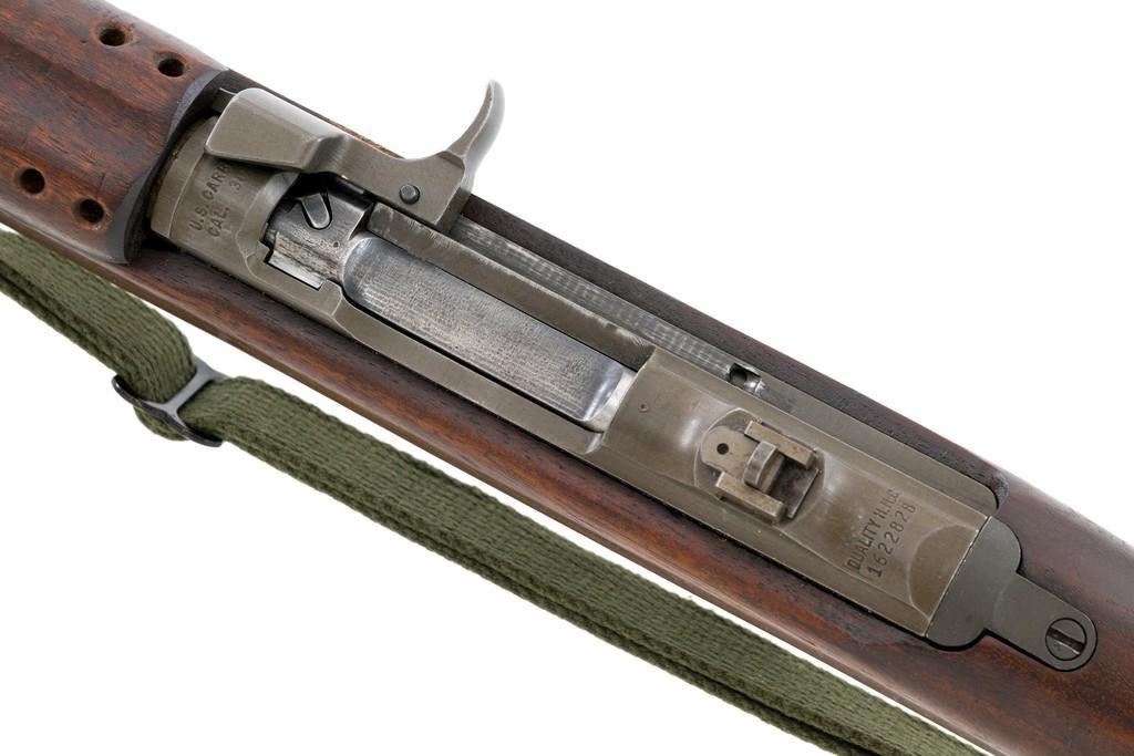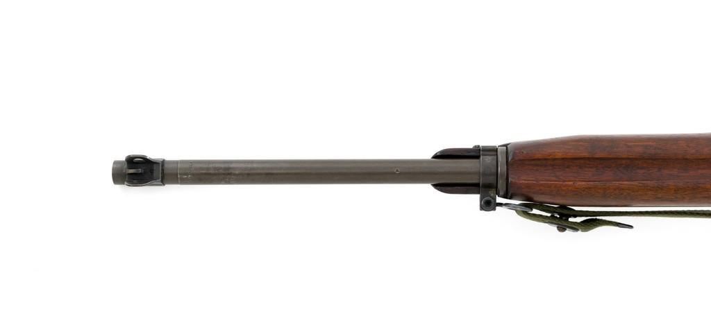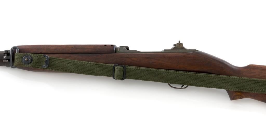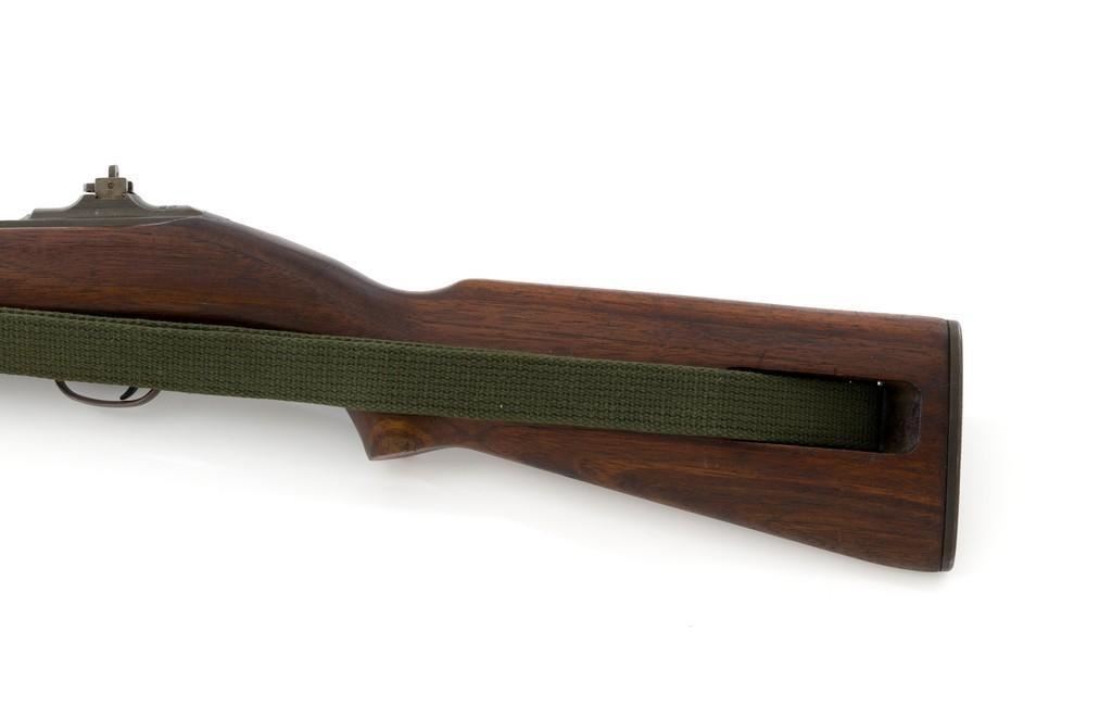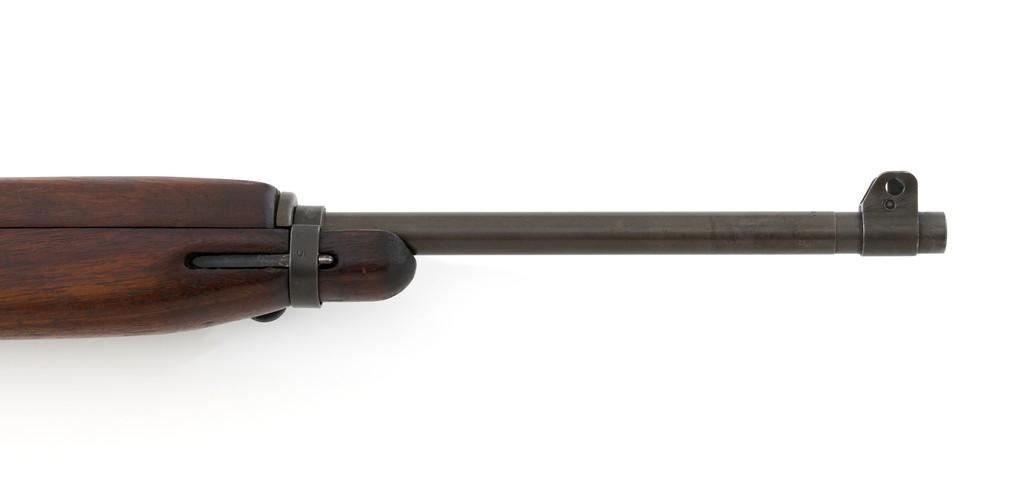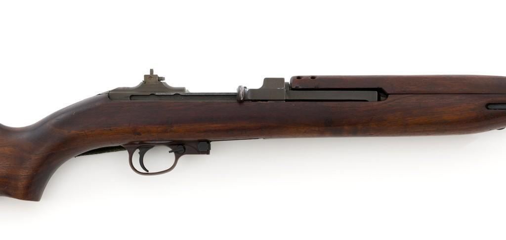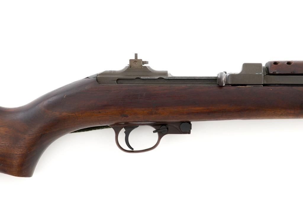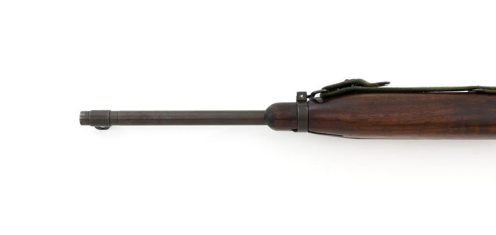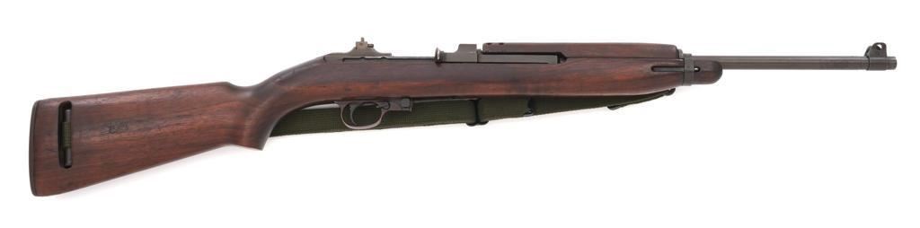 U.S. Quality Hardware M1 Semi-Automatic Carbine, #1622828, .30 carbine cal., 18'' barrel, parkerized finish, walnut stock, blade front sight with ear, and flip rear peep sight. Included is a WWII green sling and oiler. Receiver is marked ''QUALITY HMC/1622828'. Barrel band swivel is from a M1903A3 rifle held with an Allen screw. Rifle is in very good overall condition. Parkerizing is very good, showing general thinning and toning, except the trigger housing which has a rich plum color. Low wood stock and 4-rivet handguard are very good, with light handling marks. Stock well is unmarked and large ''(crossed cannons)'' are stamped on the right side. Action works properly. The barrel is marked ''I.B.M. CORP'' and has an excellent bore with sharp rifling. No visible import marks. Lot includes "US" marked canvas rifle case and muzzle device. Est.: $1,000-$1,500. (C&R/PPT)