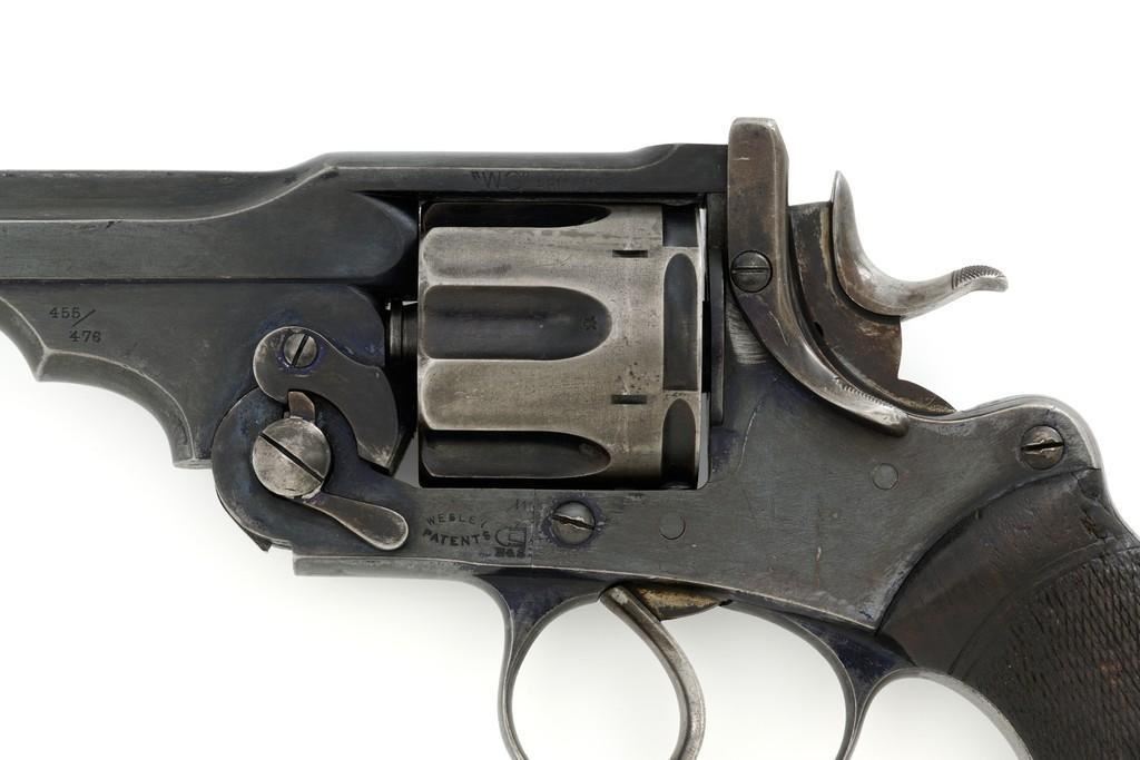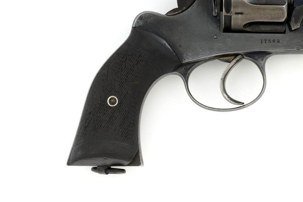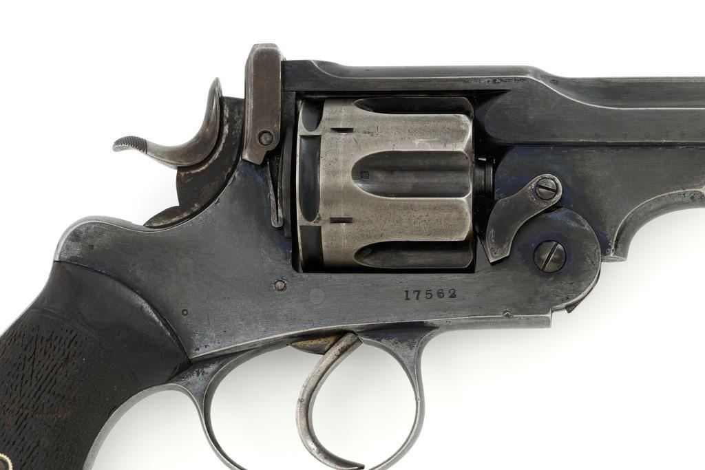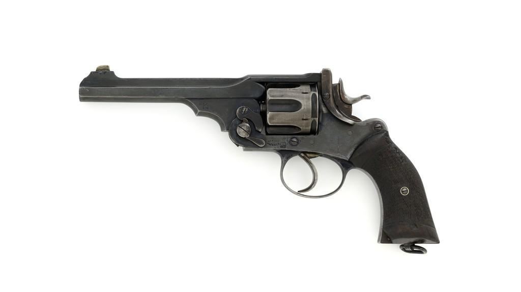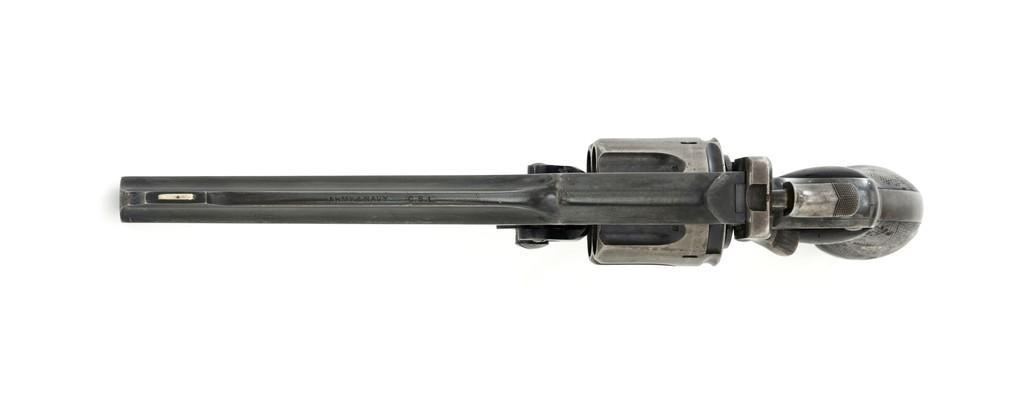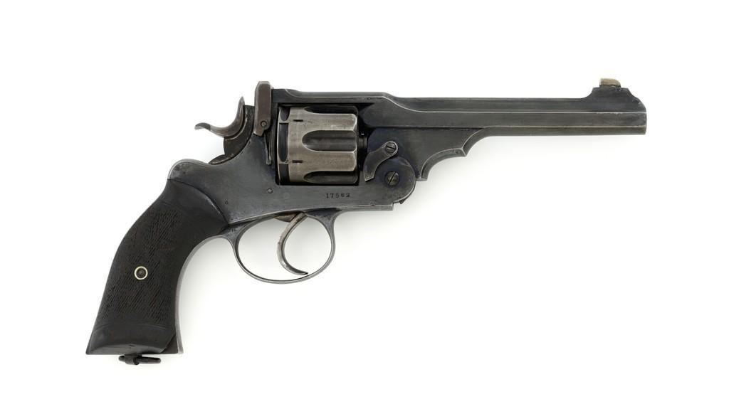 British Webley WG Army Model Double Action Revolver, #17562, .455/476 cal., 6'' flat sided barrel, blued /bright finish, checkered walnut grips, silver blade front sight, fixed rear sight with ''U''-notch, and swiveling lanyard loop. Left side of the frame is marked ''WEBLEY/PATENTS/(Winged Bullet)W&S''. Left side of the barrel strap with ''WG ARMY MODEL'' and left side of the cylinder rod housing with ''455/476''. Caliber ''.476'' marked on rear of the cylinder. Top of the barrel is marked ''ARMY & NAVL C.S.L.''. Matching numbers. No import marks. Condition overall is very good, retaining approx. 75%-80%, with scattered light marks from handling and use, finish wear primarily to the front and backstrap. Bright trigger and hammer have toned dark. Grips with chips missing from the lower forward edges on both sides, showing general handling marks and wear to the checkering detail. Action locks up, cycles, and extracts smoothly. Bright bore rates excellent with well-defined rifling. There are two small dark spots visible; otherwise, the chambers are clean and bright. Est.: $1,800-$2,400. (C&R/PPT)