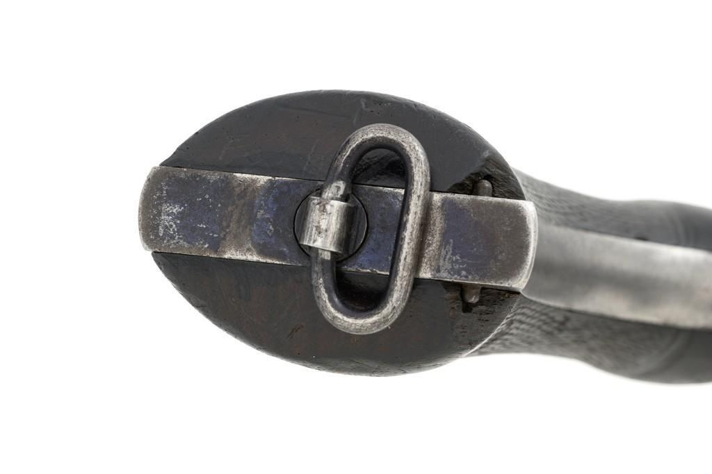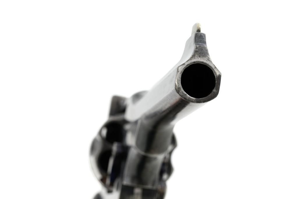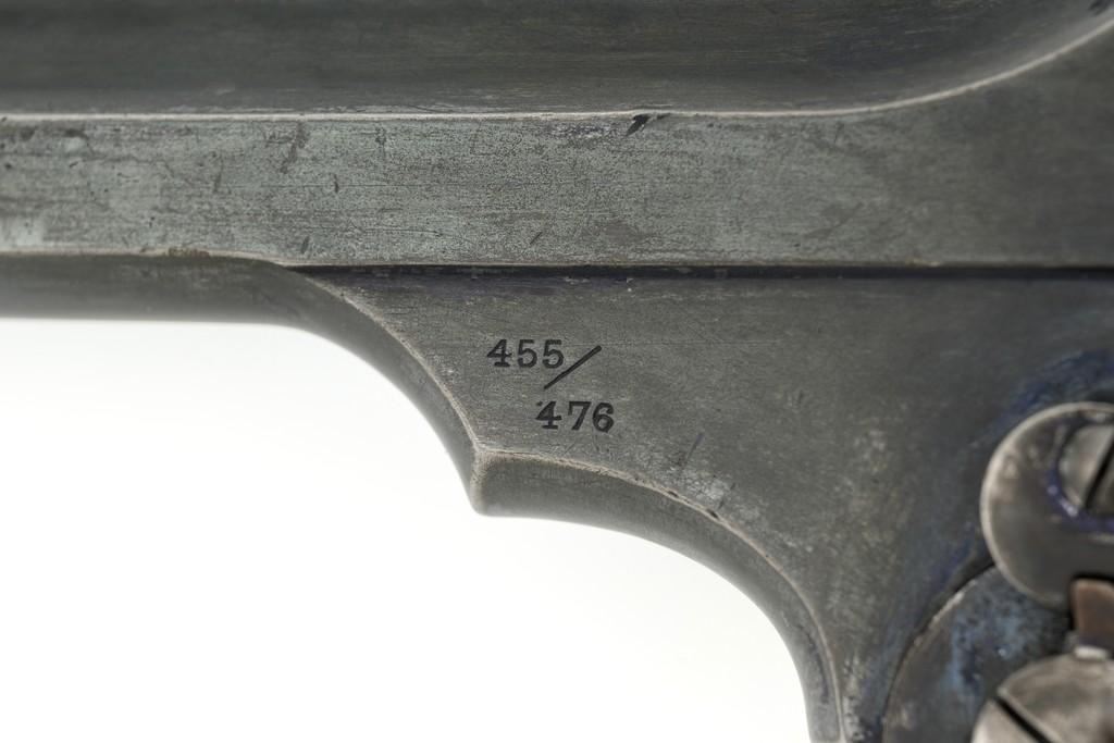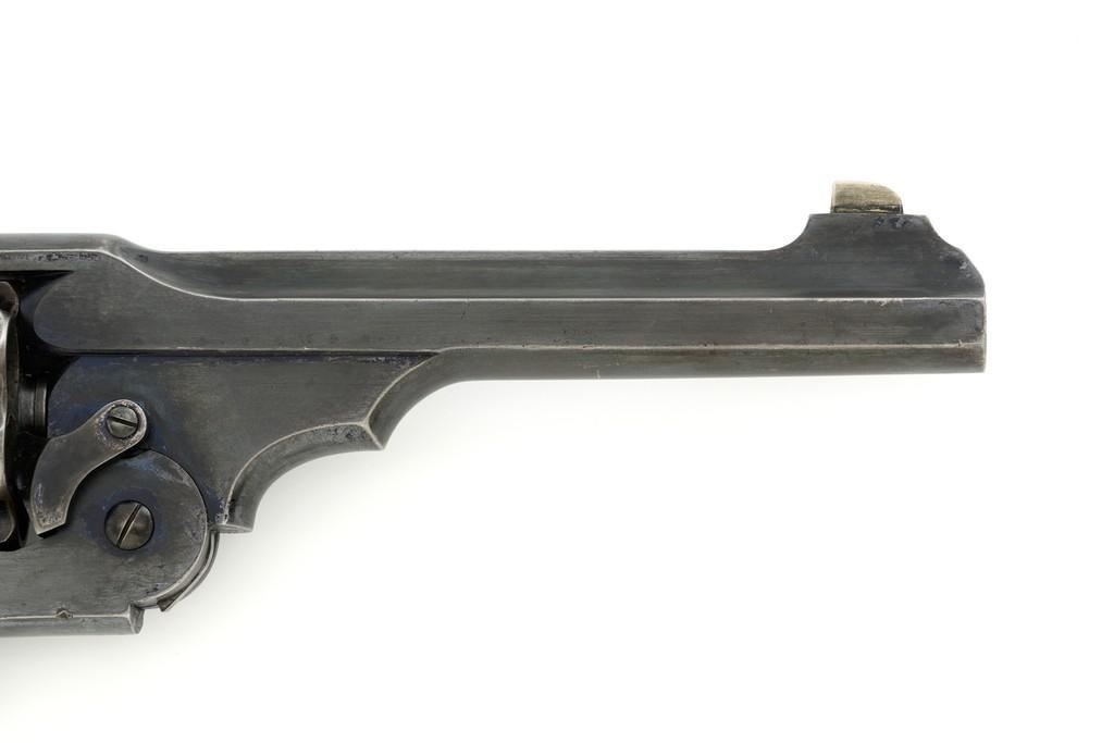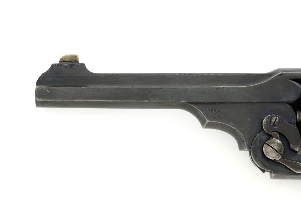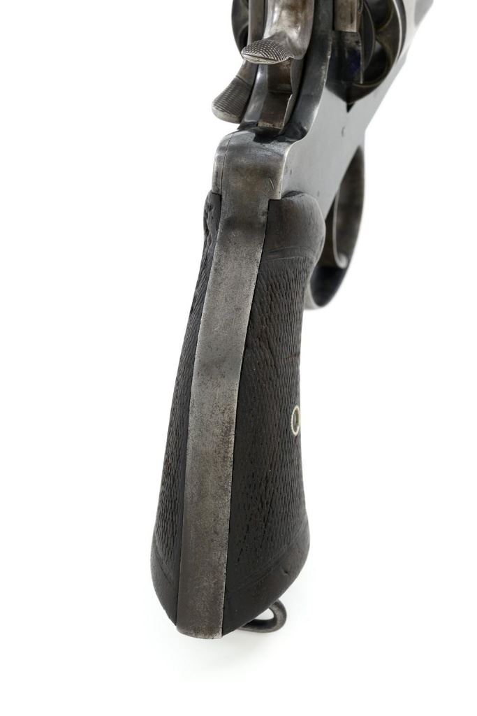 British Webley WG Army Model Double Action Revolver, #17562, .455/476 cal., 6'' flat sided barrel, blued /bright finish, checkered walnut grips, silver blade front sight, fixed rear sight with ''U''-notch, and swiveling lanyard loop. Left side of the frame is marked ''WEBLEY/PATENTS/(Winged Bullet)W&S''. Left side of the barrel strap with ''WG ARMY MODEL'' and left side of the cylinder rod housing with ''455/476''. Caliber ''.476'' marked on rear of the cylinder. Top of the barrel is marked ''ARMY & NAVL C.S.L.''. Matching numbers. No import marks. Condition overall is very good, retaining approx. 75%-80%, with scattered light marks from handling and use, finish wear primarily to the front and backstrap. Bright trigger and hammer have toned dark. Grips with chips missing from the lower forward edges on both sides, showing general handling marks and wear to the checkering detail. Action locks up, cycles, and extracts smoothly. Bright bore rates excellent with well-defined rifling. There are two small dark spots visible; otherwise, the chambers are clean and bright. Est.: $1,800-$2,400. (C&R/PPT)