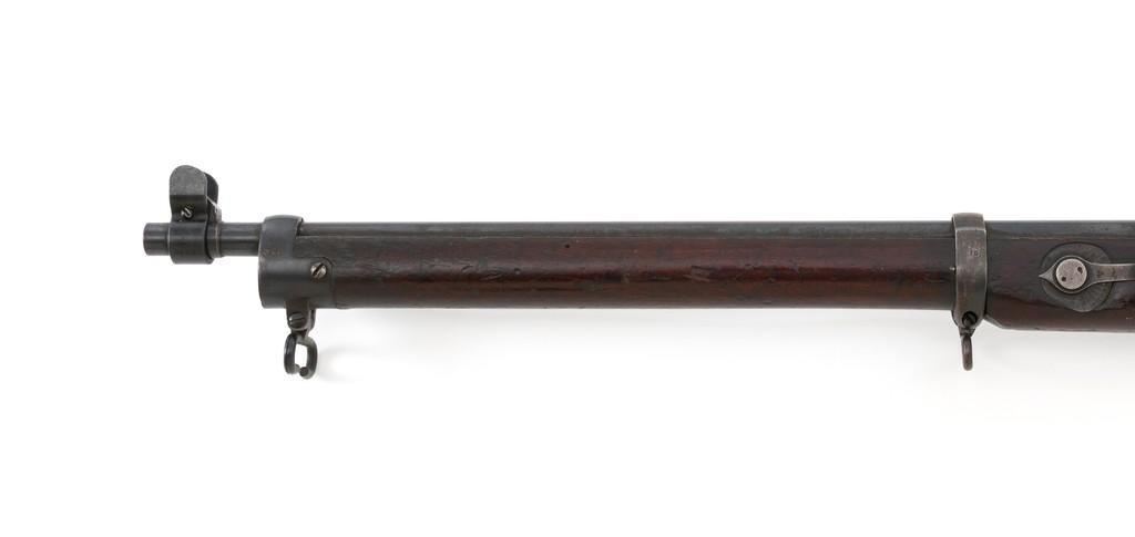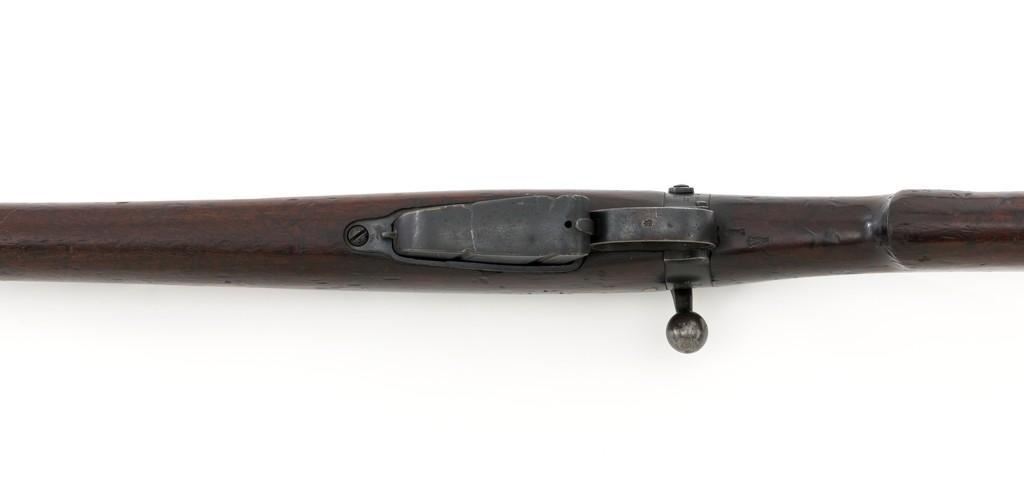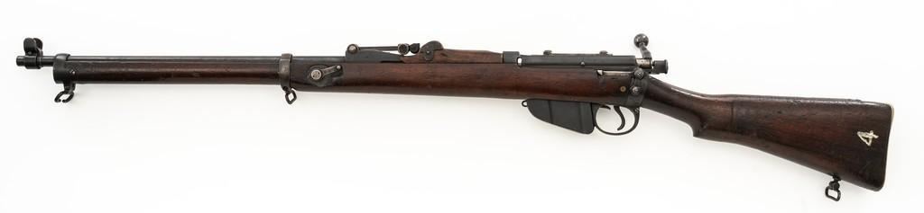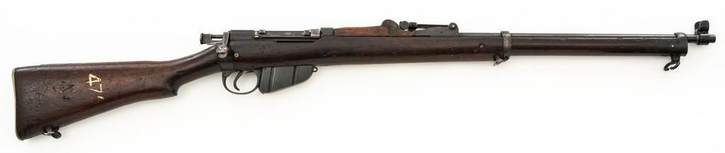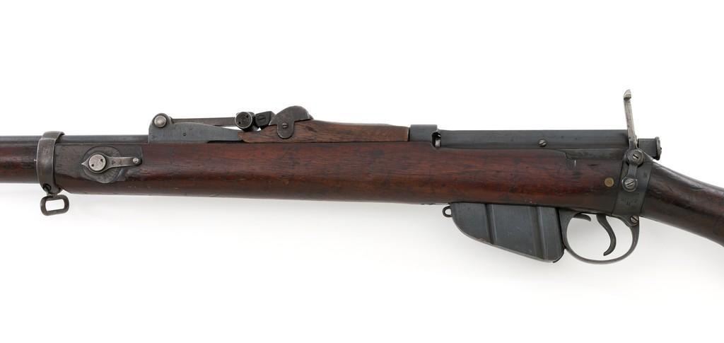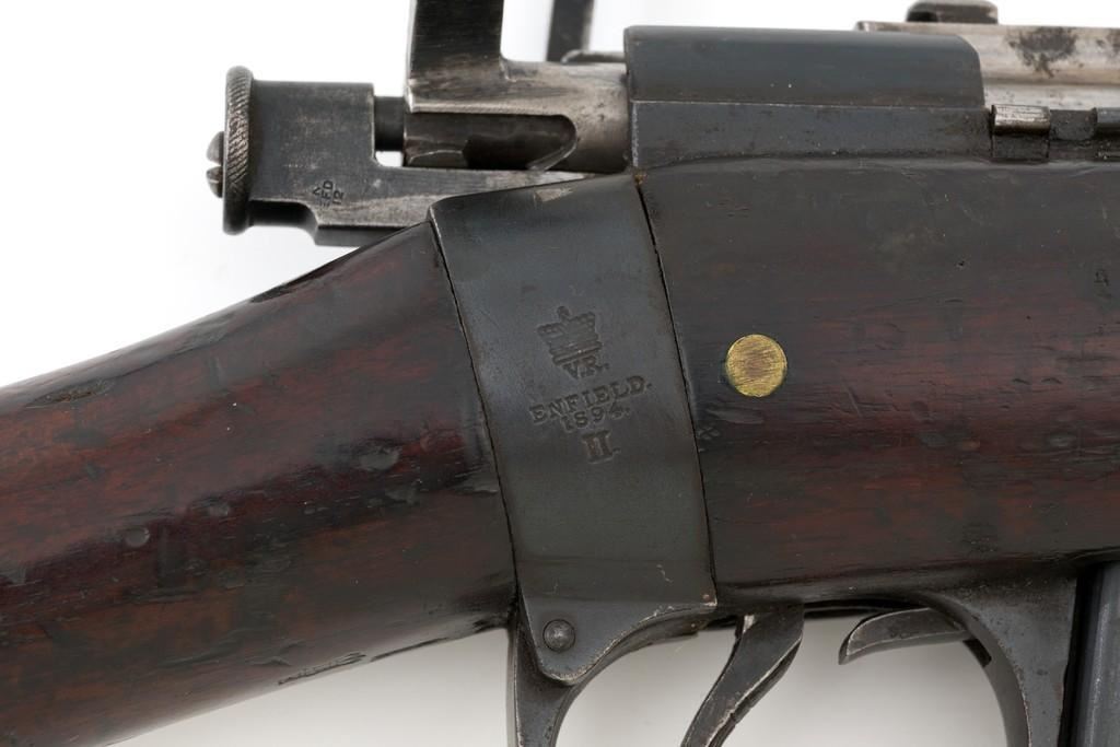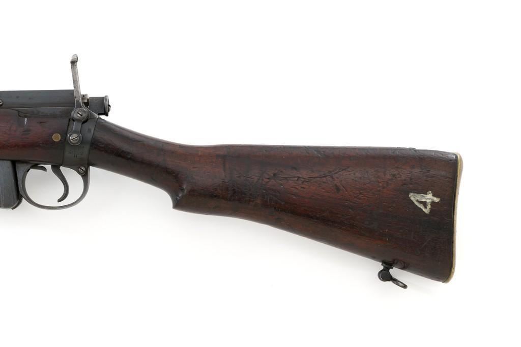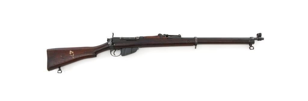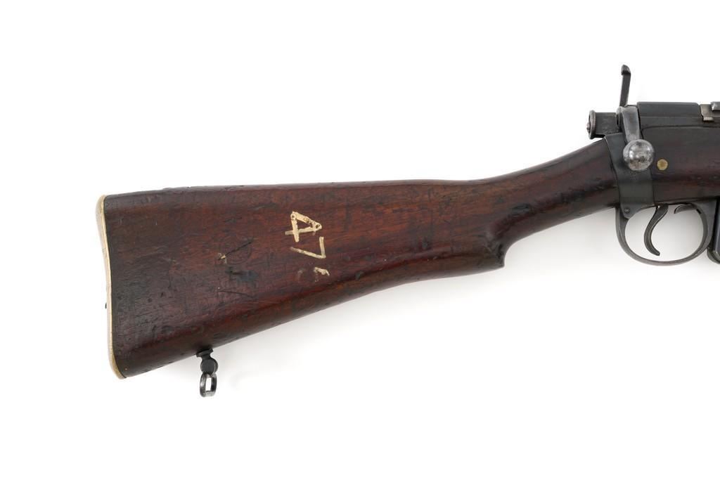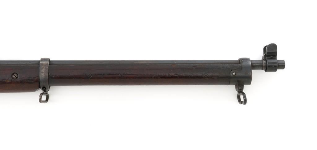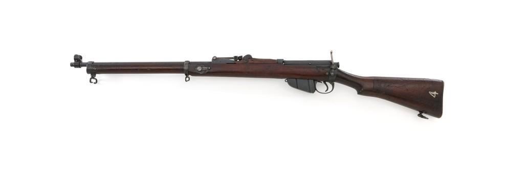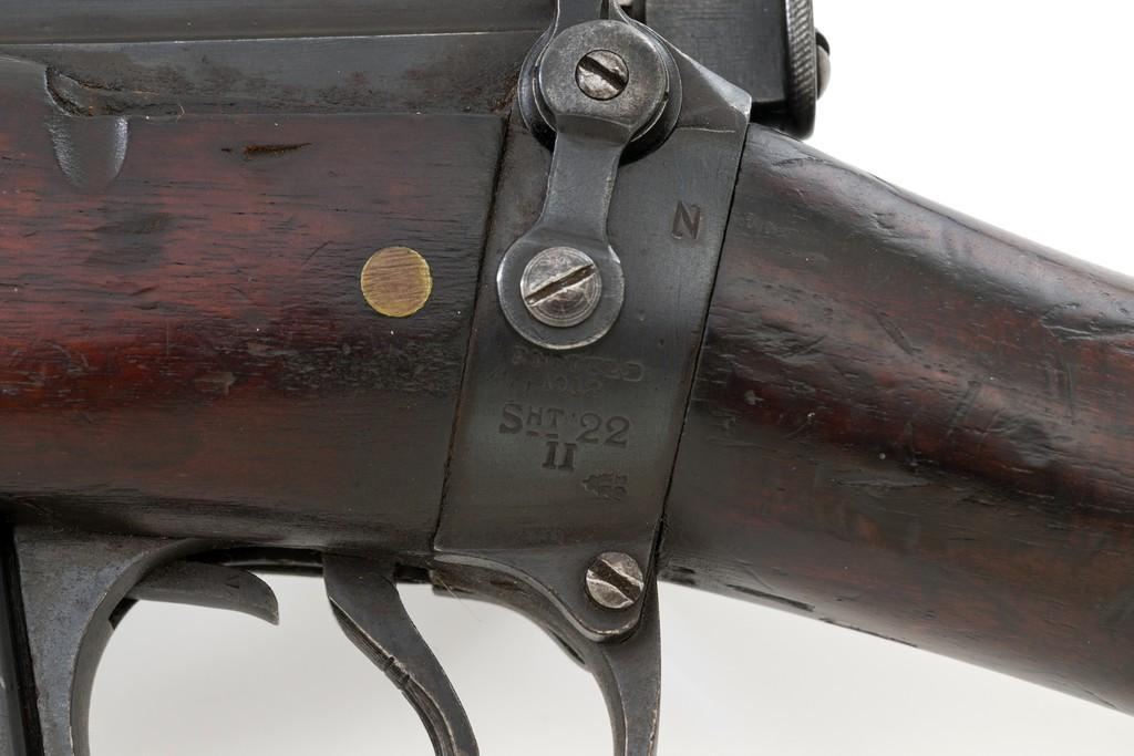 Rare British Royal Navy .22 Short Mk II Lee Enfield Bolt Action Training Rifle, #6978,.22 LR cal., 25.2'' barrel, blued finish, walnut stock set and handguard, blade front sight with rounded protectors, and tangent rear sight adjustable for windage and elevation, graduated to 2000 yards. Rifle was converted from a Mark II Lee Metford and is marked with original ''(Crown)/V.R./ENFIELD./1894/II.'' on right side of the action body and with ''ENFIELD/1912/SHT 22/II'' conversion markings on the left side below an ''N'' Naval property stamp. There are Victorian and Edwardian proof stamps on the receiver ring. There is a barred out ''RM SPARKBROOK/1.*'' roundel stamped on right side of the buttstock. Bolt does not match. Rifle retains early features including handguard with attached sight protectors, long range aperture sight and dial plate, early magazine assembly, bolt body with hooks, groove for steel dustcover, buttstock with long buttplate tang, and single point rear sling swivel. Condition overall is very good, retaining approx. 85% blue, showing wear, and toning with spots of patina to the bolt body. Wood is good with numerous impressions and handling marks scattered throughout. There is a white painted ''47'' rack number on right side of the buttstock. Action operates smoothly. Bore rates fair to poor with old pitting and visible rifling. A rare rifle as approximately 1,000 were produced, per ''THE LEE ENFIELD'' by Ian Skennerton, 2007 by Arms & Militaria Press. Est.:$1,000-$1,500. (Antique)