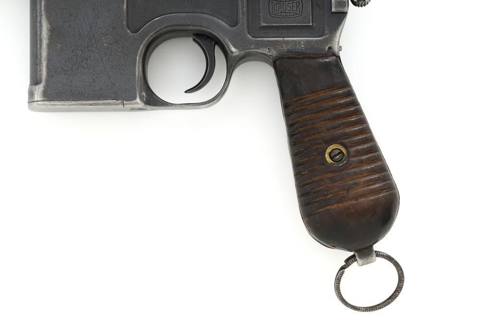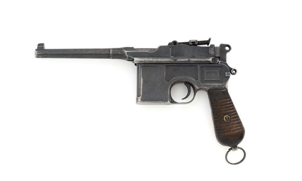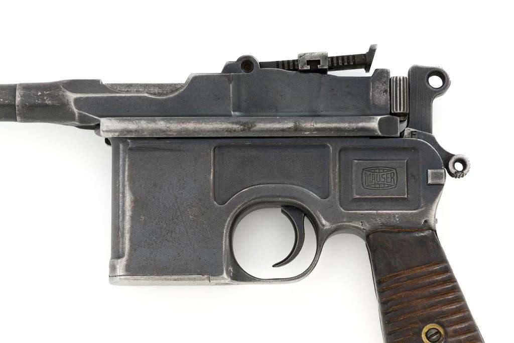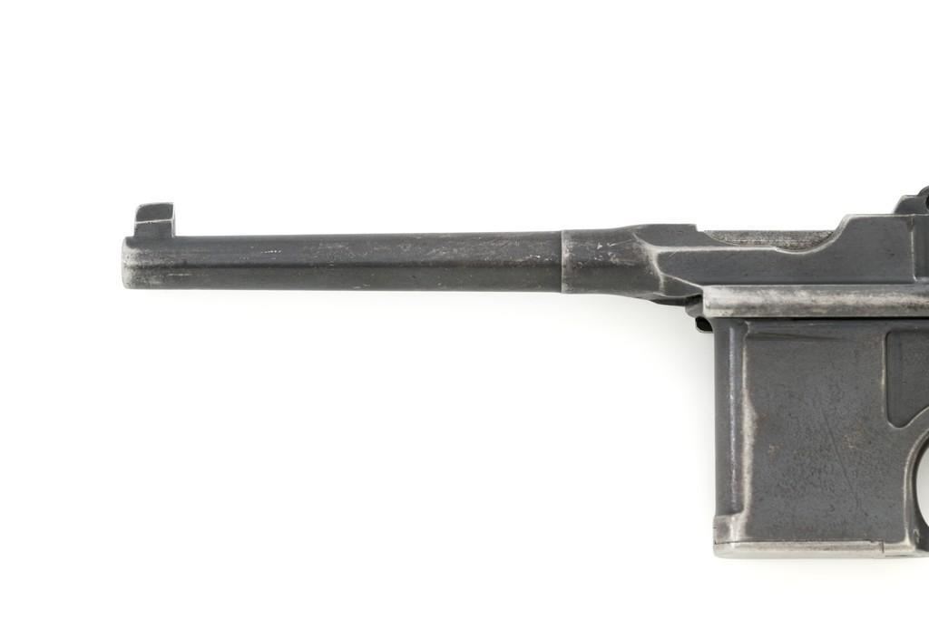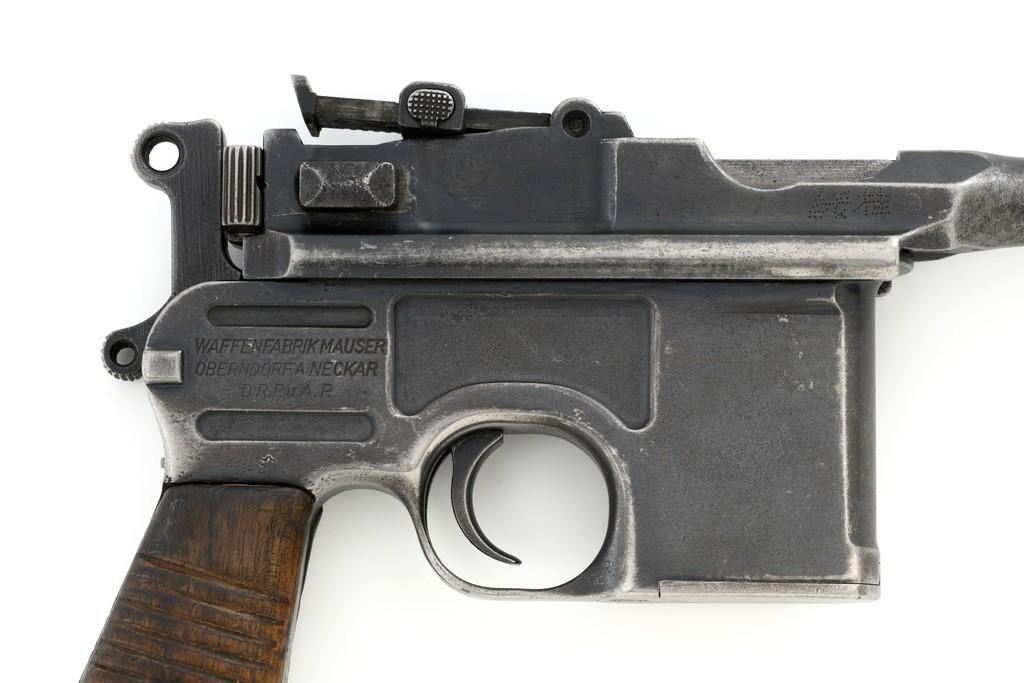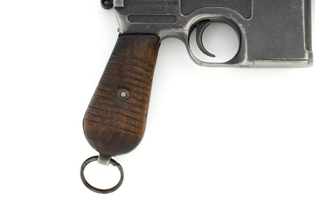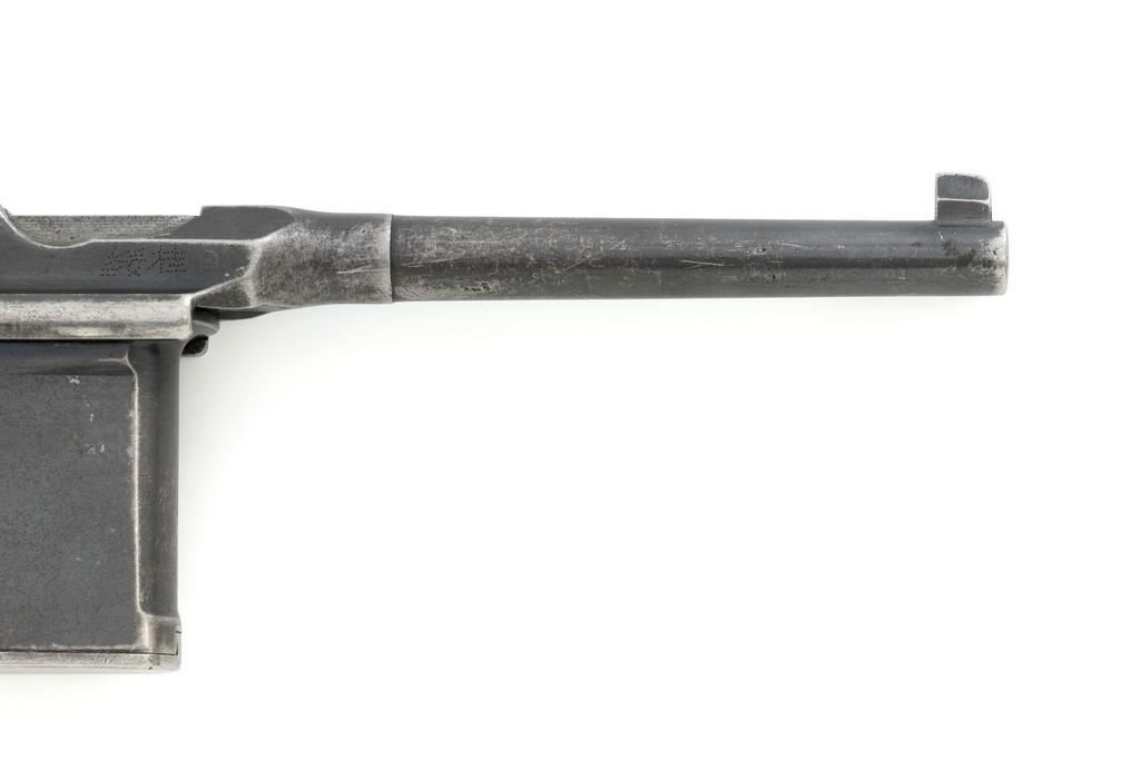 Chinese Marked C96 Mauser Broomhandle Semi-Automatic Pistol, #907039, .30 Mauser cal., 5.5'' barrel, blued finish, grooved hardwood grips, inverted-''V'' front sight, and adjustable tangent rear sight with ''V''-notch, graduated to 1000 meters. Backstrap is slotted for a shoulder stock and a loose lanyard ring is mounted to the butt. Marked with a ''MAUSER'' logo on left side of the frame and ''WAFFENFABRIK MAUSER/OBERNDORF A.NECKAR/D.R.P.u.A.P. on the right side. Top of the chamber is marked ''WAFFENFABRIK MAUSER OBERNDORF A/N''. With simple Chinese characters on the right side below the chamber. Numbers do not match. No visible import marks. Condition overall is very good, retaining approx. 70% thinning and toning blue, with light pitting to the front and backstrap. Grips show signs of moderate age and handling wear. Action functions smoothly but the safety is not functioning properly and needs to be repaired prior to firing. Bore rates fair to good, showing more than average wear to the rifling, which is common for these pistols. Est.: $1,000-$1,500. (C&R/PPT)