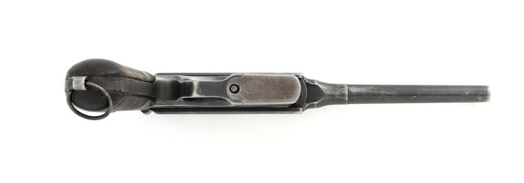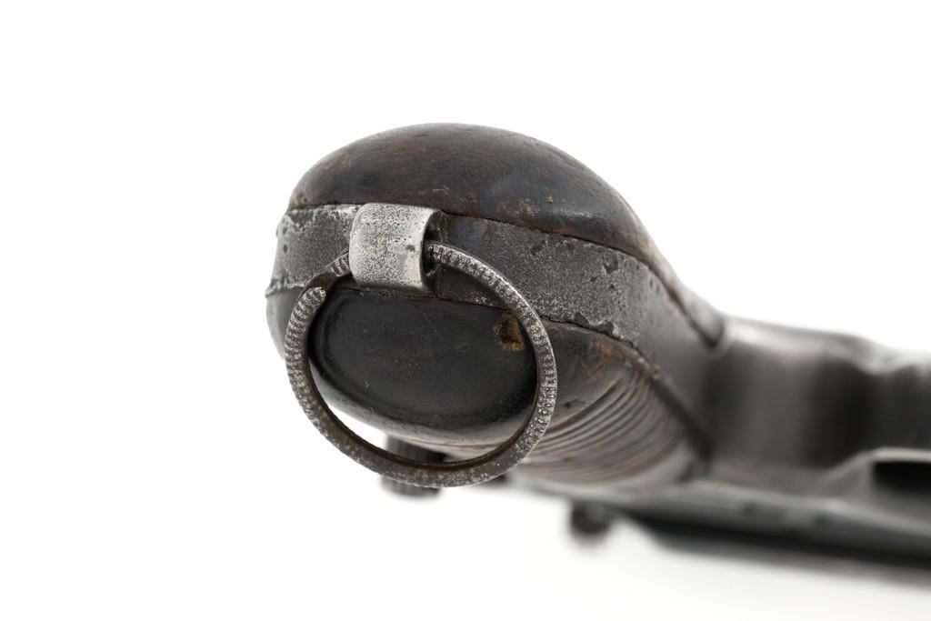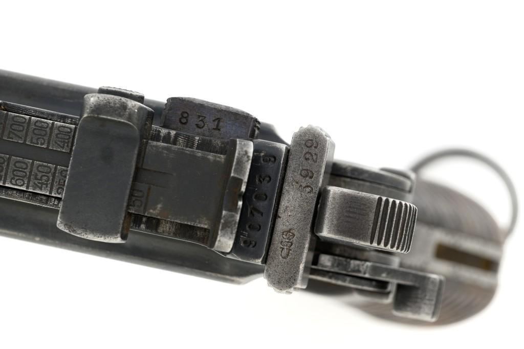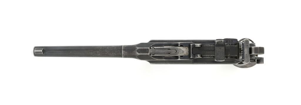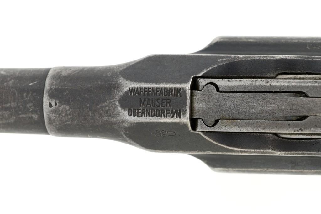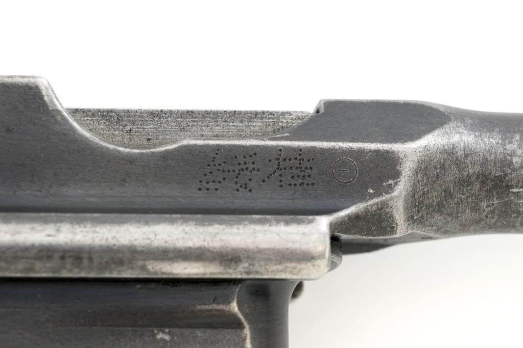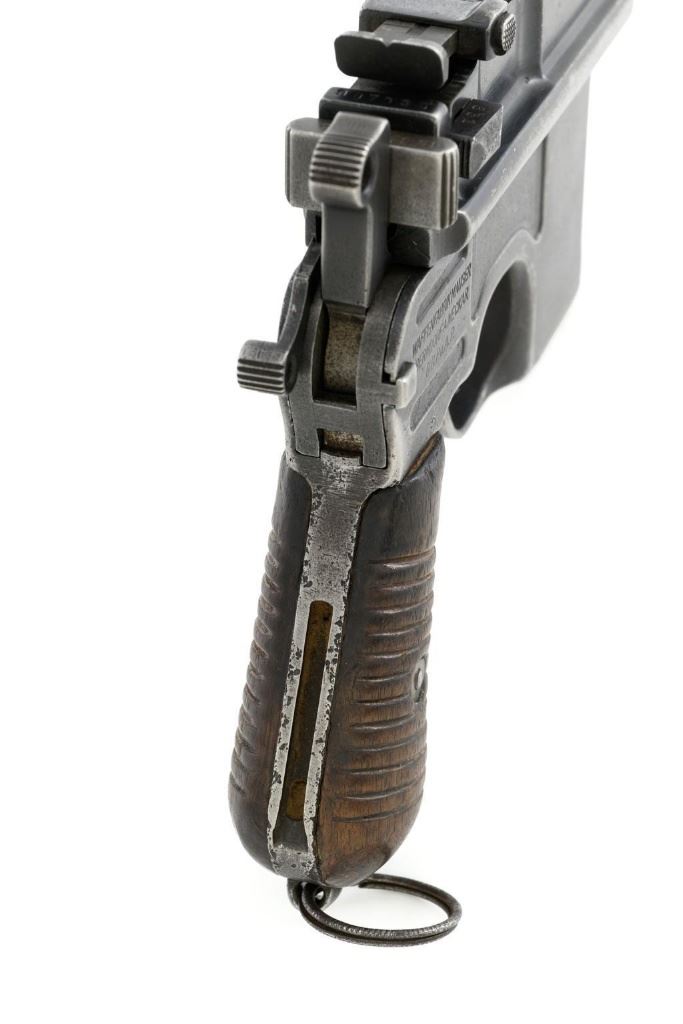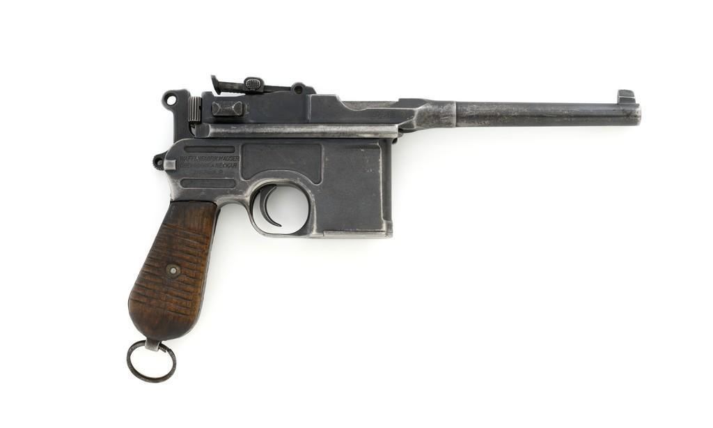 Chinese Marked C96 Mauser Broomhandle Semi-Automatic Pistol, #907039, .30 Mauser cal., 5.5'' barrel, blued finish, grooved hardwood grips, inverted-''V'' front sight, and adjustable tangent rear sight with ''V''-notch, graduated to 1000 meters. Backstrap is slotted for a shoulder stock and a loose lanyard ring is mounted to the butt. Marked with a ''MAUSER'' logo on left side of the frame and ''WAFFENFABRIK MAUSER/OBERNDORF A.NECKAR/D.R.P.u.A.P. on the right side. Top of the chamber is marked ''WAFFENFABRIK MAUSER OBERNDORF A/N''. With simple Chinese characters on the right side below the chamber. Numbers do not match. No visible import marks. Condition overall is very good, retaining approx. 70% thinning and toning blue, with light pitting to the front and backstrap. Grips show signs of moderate age and handling wear. Action functions smoothly but the safety is not functioning properly and needs to be repaired prior to firing. Bore rates fair to good, showing more than average wear to the rifling, which is common for these pistols. Est.: $1,000-$1,500. (C&R/PPT)