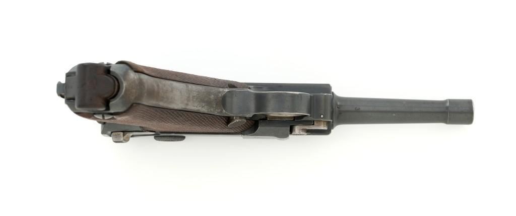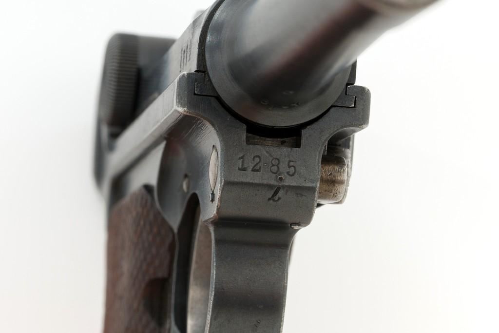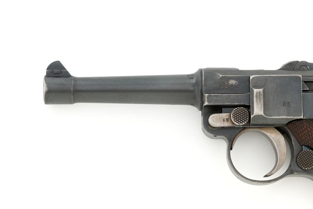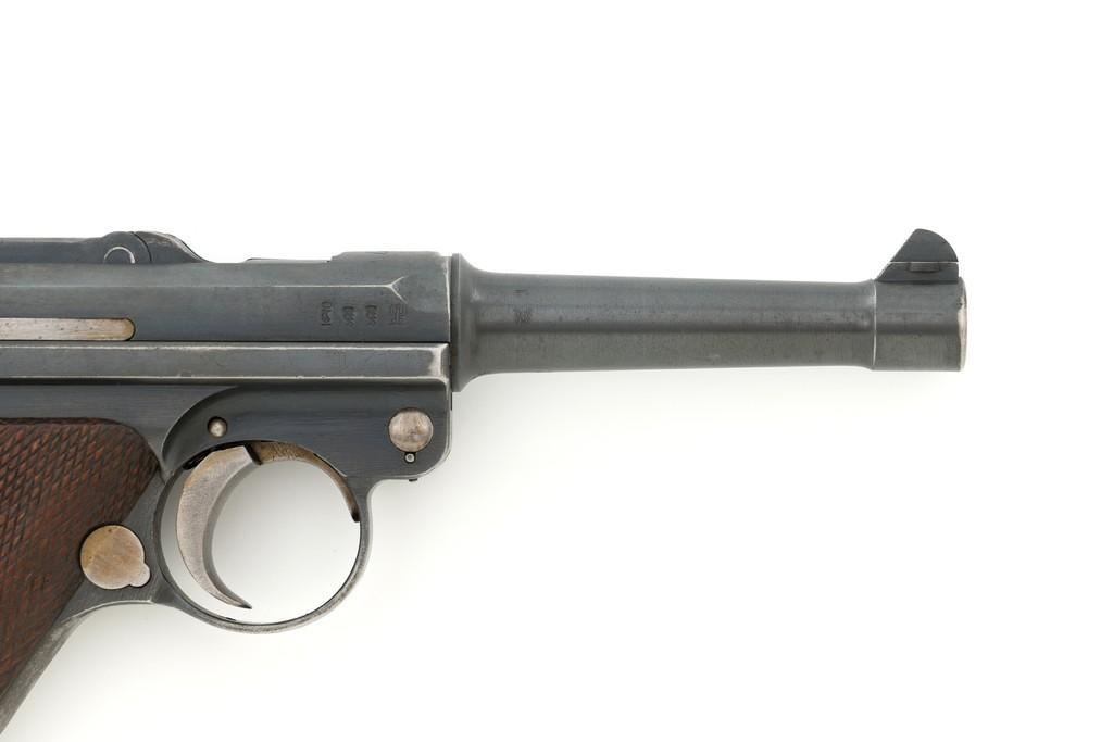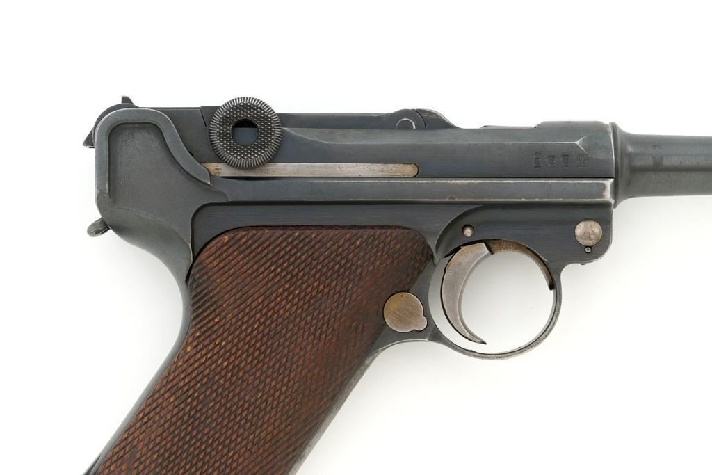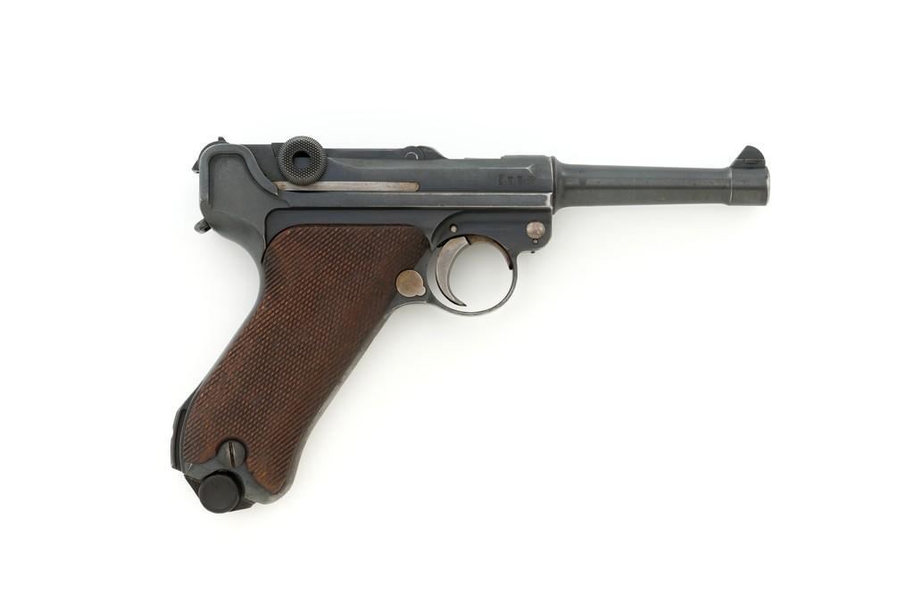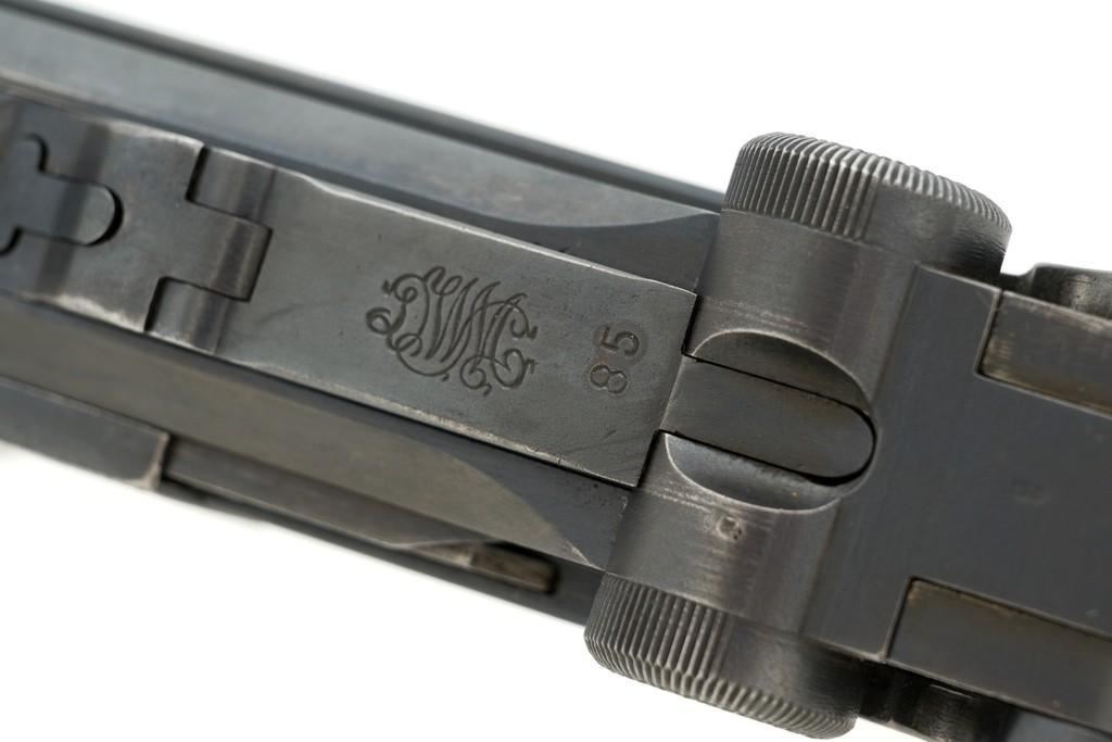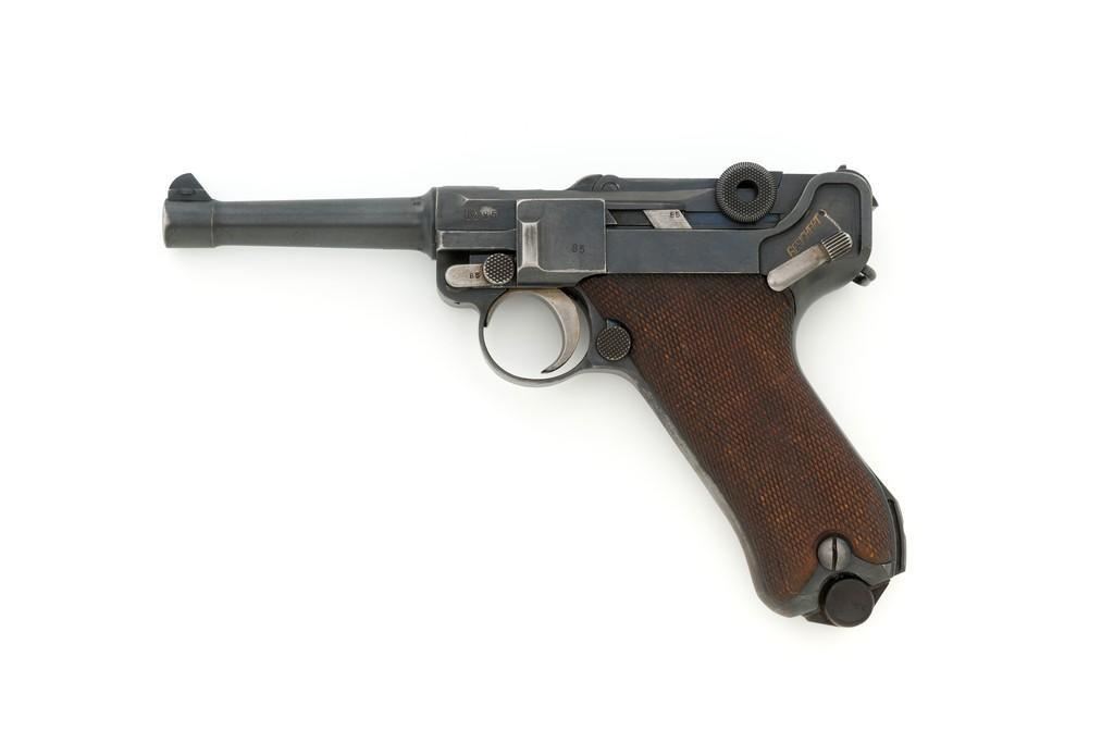 1917 Dated Reworked DWM Luger Semi-Automatic Pistol, #1285i, 9mm cal., 4'' barrel, rust blue finish, straw colored small parts, checkered walnut grips, inverted-"V" front sight, fixed rear sight with small "V"-notched groove, with stock lug. Includes one unnumbered blued magazine with wood base; base is marked with illegible ''crowned'' gothic letter. Pistol is marked DWM'' on toggle with ''1917'' date on top of chamber. Right side of receiver with three ''(crown)/script letter'' military proofs and test fire proof mark. There is light ''PTV'' and ''(eagle) on right side of the barrel; ''(eagle)33'' and ''(eagle)RC'' on the upper left side. All visible numbers matching except for the barrel, which was replaced and is stamped with a larger ''3'' on the underside. Grip numbers are faint but appear to match. Condition is good, retaining approx. 80% blue, showing general edge and muzzle wear, backstrap has worn to gray, with scattered mild frosting. Factory lettering and proof marks are mostly clear, the exception being the marks on right side of the barrel. Small parts retain little finish and are now mostly silver. Grips show expected age and wear that matches the overall condition of this pistol. Action functions smoothly; hold open does not function with this particular magazine. Bore with mild erosion throughout and the grooves are dark; rifling is still clearly defined. Magazine body is lightly pitted and frosted, with patina and finish loss along the back half. Est.: $1,200-$1,500. (C&R/PPT)