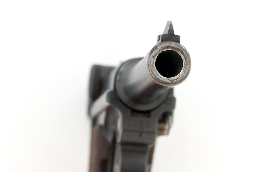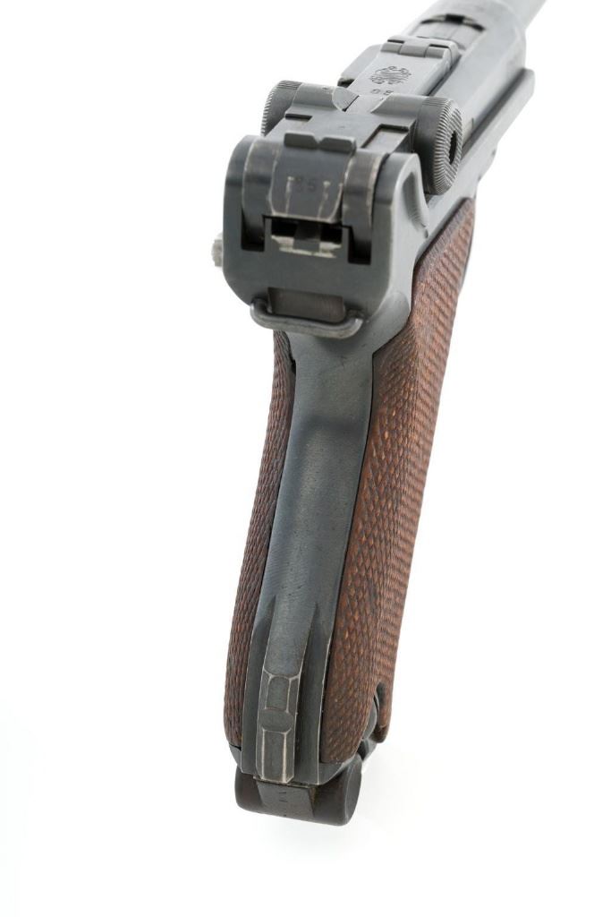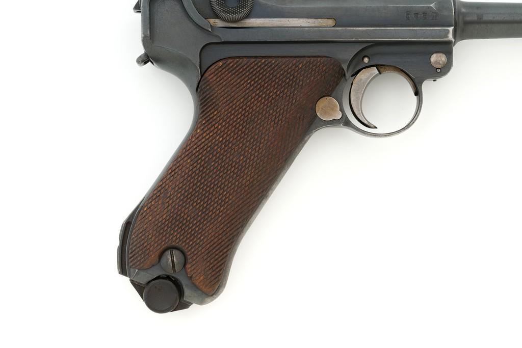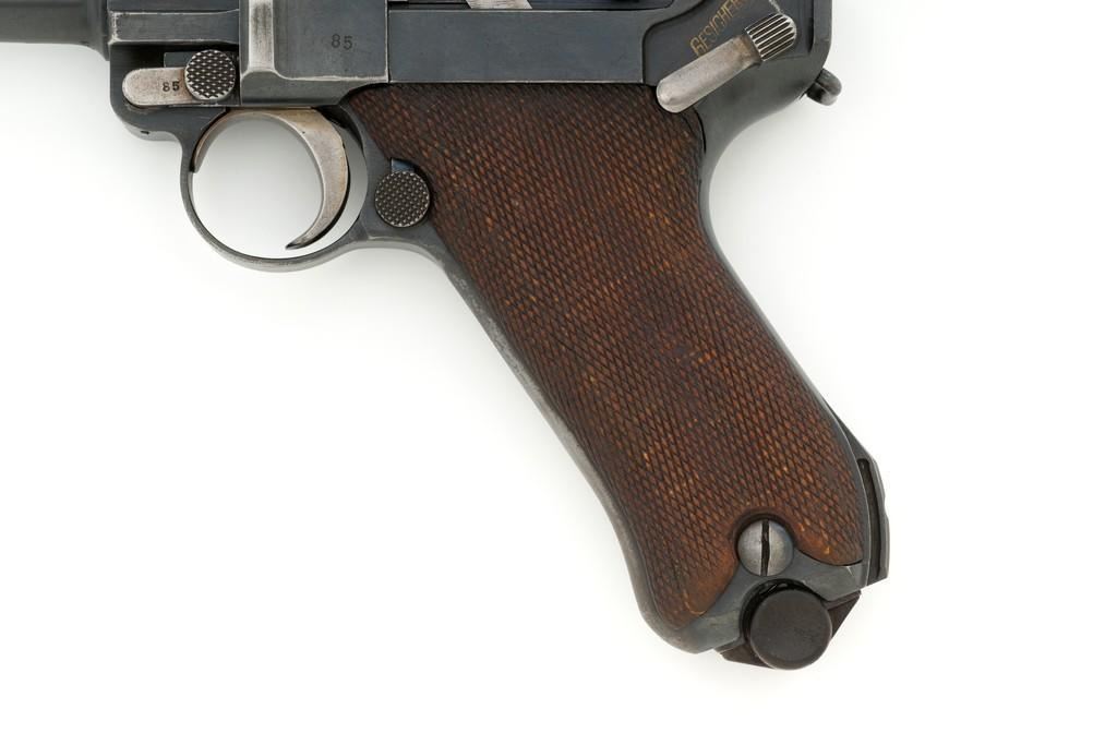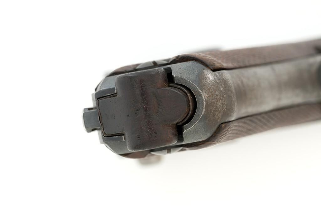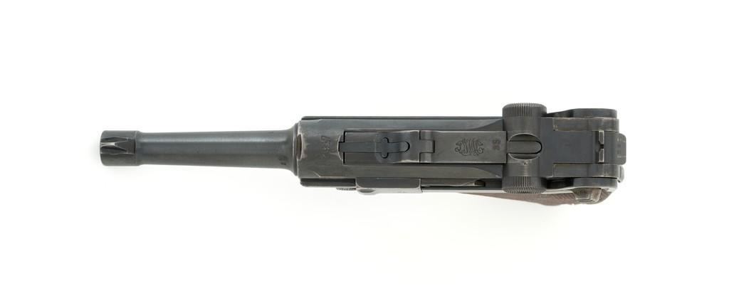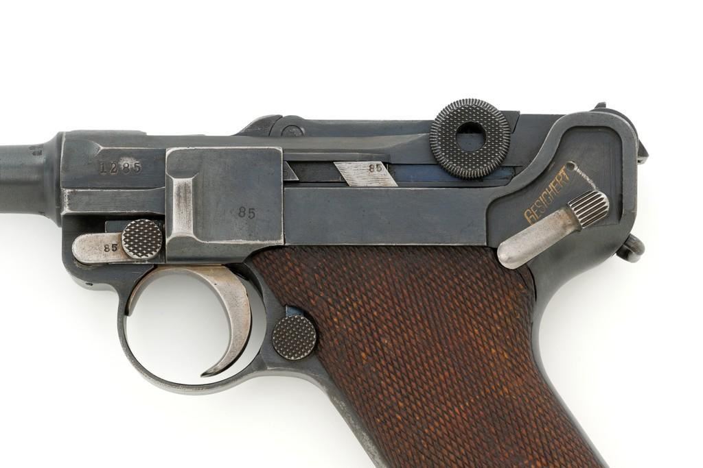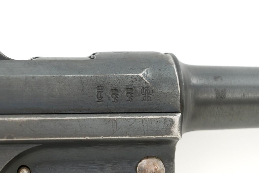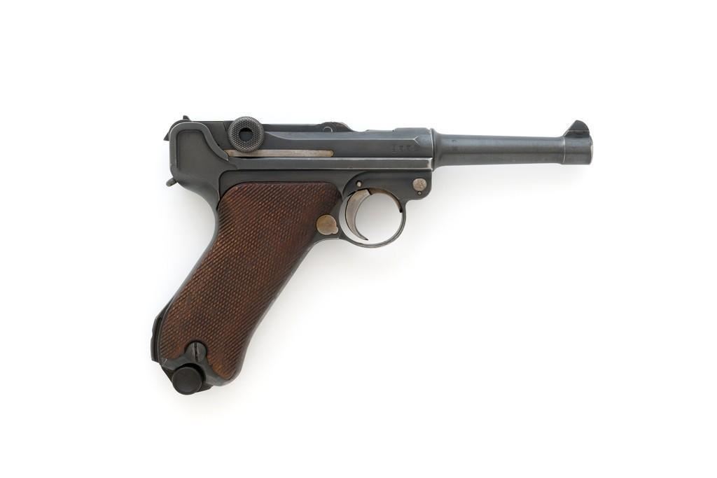 1917 Dated Reworked DWM Luger Semi-Automatic Pistol, #1285i, 9mm cal., 4'' barrel, rust blue finish, straw colored small parts, checkered walnut grips, inverted-"V" front sight, fixed rear sight with small "V"-notched groove, with stock lug. Includes one unnumbered blued magazine with wood base; base is marked with illegible ''crowned'' gothic letter. Pistol is marked DWM'' on toggle with ''1917'' date on top of chamber. Right side of receiver with three ''(crown)/script letter'' military proofs and test fire proof mark. There is light ''PTV'' and ''(eagle) on right side of the barrel; ''(eagle)33'' and ''(eagle)RC'' on the upper left side. All visible numbers matching except for the barrel, which was replaced and is stamped with a larger ''3'' on the underside. Grip numbers are faint but appear to match. Condition is good, retaining approx. 80% blue, showing general edge and muzzle wear, backstrap has worn to gray, with scattered mild frosting. Factory lettering and proof marks are mostly clear, the exception being the marks on right side of the barrel. Small parts retain little finish and are now mostly silver. Grips show expected age and wear that matches the overall condition of this pistol. Action functions smoothly; hold open does not function with this particular magazine. Bore with mild erosion throughout and the grooves are dark; rifling is still clearly defined. Magazine body is lightly pitted and frosted, with patina and finish loss along the back half. Est.: $1,200-$1,500. (C&R/PPT)