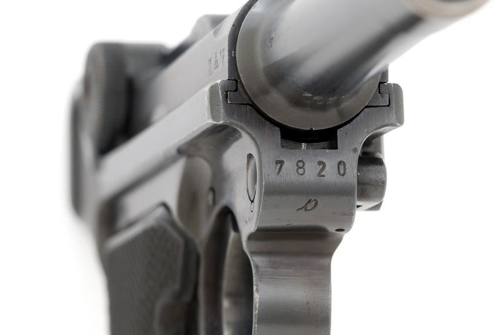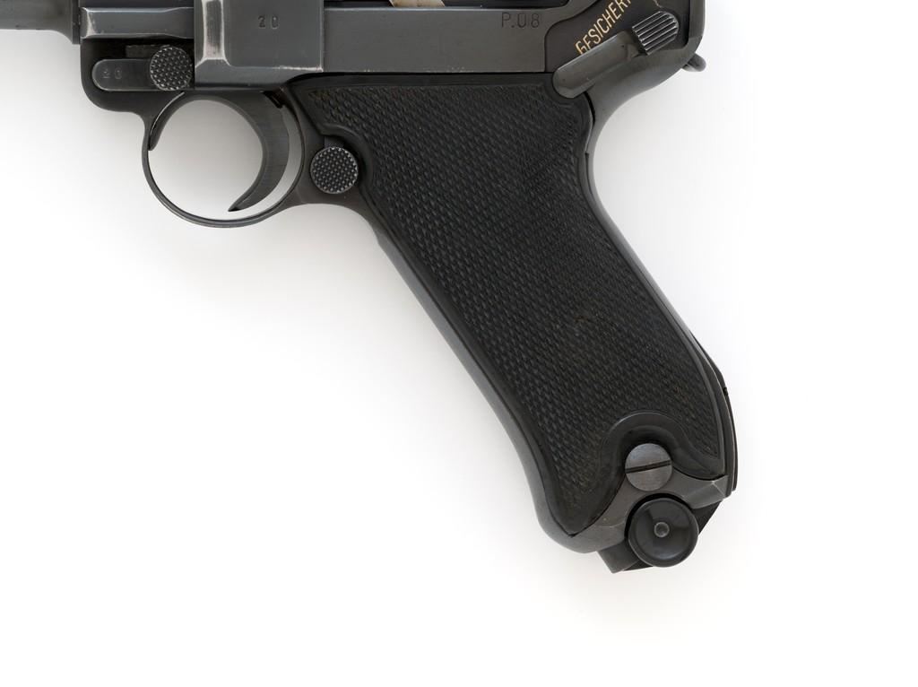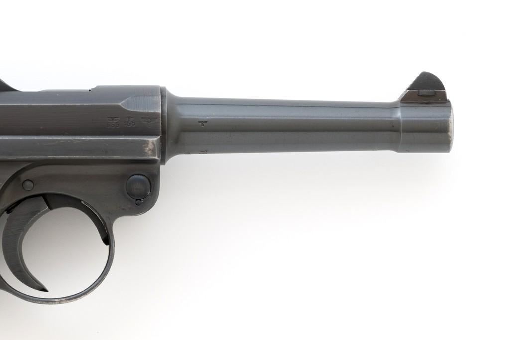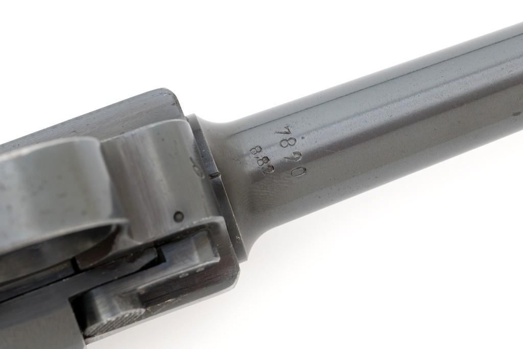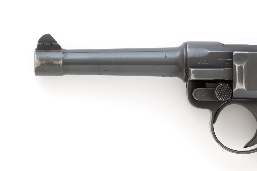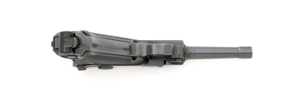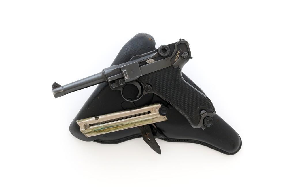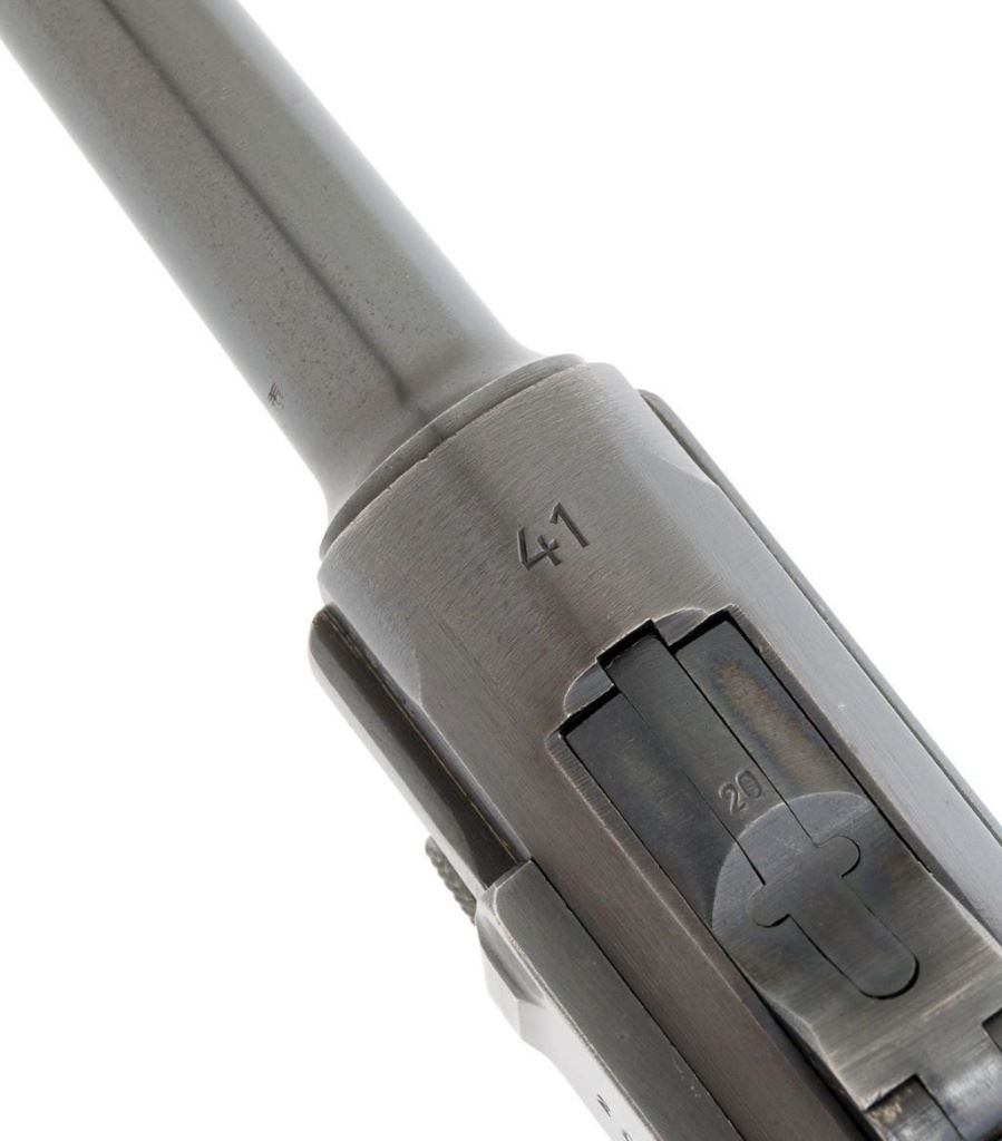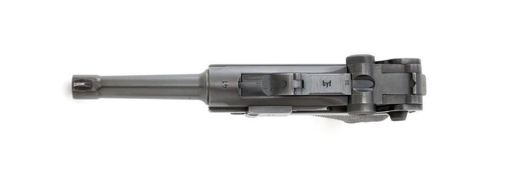 Mauser byf 41 ''Black Widow'' Luger with Genschow 1938 Dated Holster, #7820v, 9mm, 4'' barrel, dark blued finish including small parts, checkered black plastic grips, inverted-''V'' front and fixed rear sight with small ''V''-notch, and stock lug. With one blued steel magazine with black plastic base; left side of the body is marked ''fxo'', ''(eagle)37'', and ''P.08''. Includes a 1938 dated black leather ''Genschow & Co., Berlin'' marked holster, ''42'' code Luger tool, and an extra post-war magazine. Magazine has a bright plated body, plastic base, and the spine is marked ''Erma/Made In Germany''. The pistols toggle is marked ''byf'' and ''41'' above the chamber. Right side of receiver and barrel with Nazi eagle firing proofs; right side of receiver also has two ''(eagle)655'' acceptance marks. There is also a small ''(eagle)655'' on left side of the barrel. Left side of the frame is marked ''P.08''. All visible matching numbers. Pistol is in fine overall condition, retaining approx. 93%-94% original blue; displaying moderate holster wear at the muzzle and high points, small spot of wear to the front grip strap, and wear to the stock lug. There are intermittent specks of mild frosting on the front and backstrap. Factory lettering and proof marks are clear. Grips show moderate handling wear, which is more noticeable at the bottom of the left panel; no chips or cracks. Action and hold open function properly. There is very mild pitting scattered throughout the bore; otherwise, bright with very good, defined rifling. Original magazine has a little normal light scratching and rub wear to the body. Extra post-war magazine appears to be in near excellent condition but the body is heavily greased. Holster is in good condition, with age cracking scattered throughout, heavier on the backside. Maker's marks and date are legible; Waffenamt barely visible. Stitching is complete. Pull strap is present and functions properly. Est.: $2,500-$3,000. (C&R/PPT)