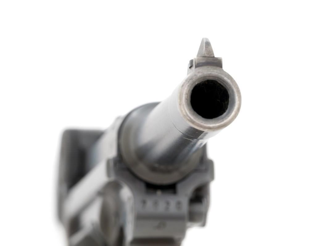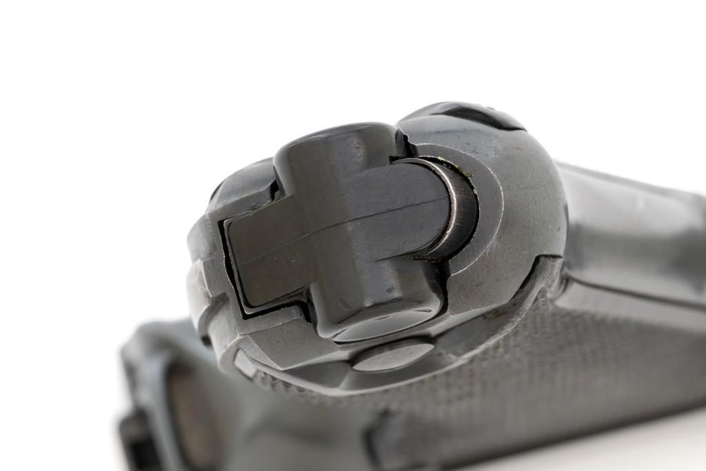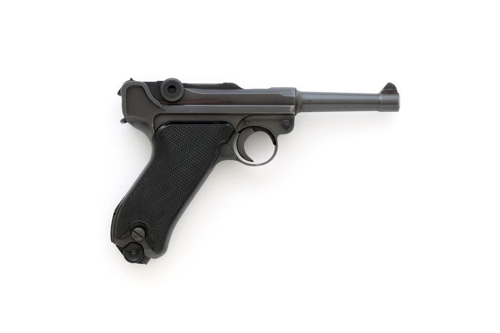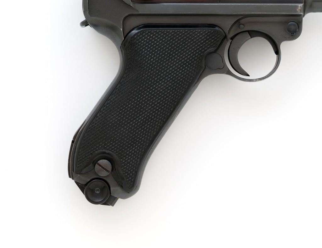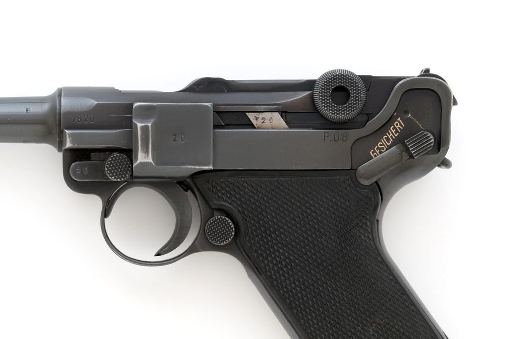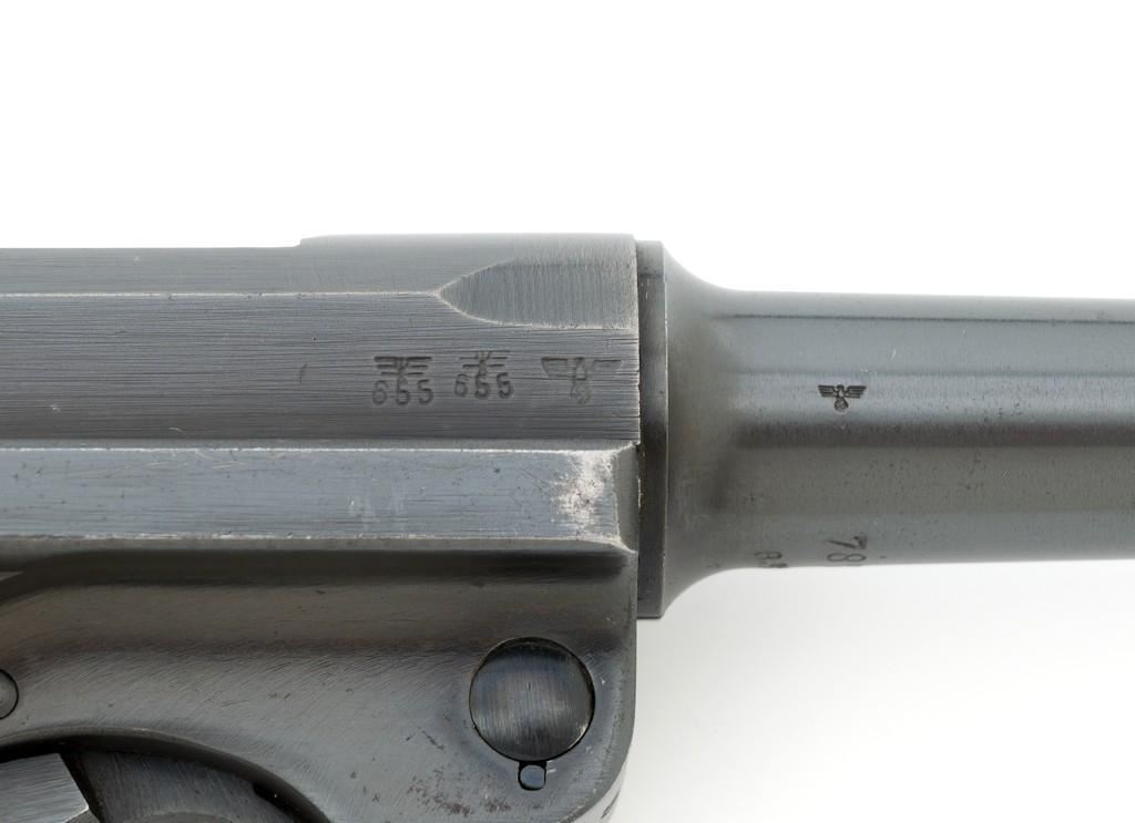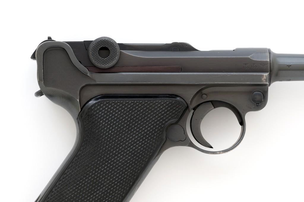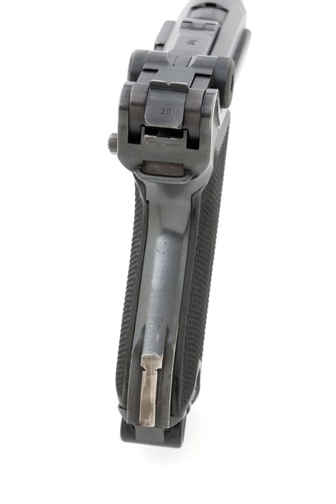 Mauser byf 41 ''Black Widow'' Luger with Genschow 1938 Dated Holster, #7820v, 9mm, 4'' barrel, dark blued finish including small parts, checkered black plastic grips, inverted-''V'' front and fixed rear sight with small ''V''-notch, and stock lug. With one blued steel magazine with black plastic base; left side of the body is marked ''fxo'', ''(eagle)37'', and ''P.08''. Includes a 1938 dated black leather ''Genschow & Co., Berlin'' marked holster, ''42'' code Luger tool, and an extra post-war magazine. Magazine has a bright plated body, plastic base, and the spine is marked ''Erma/Made In Germany''. The pistols toggle is marked ''byf'' and ''41'' above the chamber. Right side of receiver and barrel with Nazi eagle firing proofs; right side of receiver also has two ''(eagle)655'' acceptance marks. There is also a small ''(eagle)655'' on left side of the barrel. Left side of the frame is marked ''P.08''. All visible matching numbers. Pistol is in fine overall condition, retaining approx. 93%-94% original blue; displaying moderate holster wear at the muzzle and high points, small spot of wear to the front grip strap, and wear to the stock lug. There are intermittent specks of mild frosting on the front and backstrap. Factory lettering and proof marks are clear. Grips show moderate handling wear, which is more noticeable at the bottom of the left panel; no chips or cracks. Action and hold open function properly. There is very mild pitting scattered throughout the bore; otherwise, bright with very good, defined rifling. Original magazine has a little normal light scratching and rub wear to the body. Extra post-war magazine appears to be in near excellent condition but the body is heavily greased. Holster is in good condition, with age cracking scattered throughout, heavier on the backside. Maker's marks and date are legible; Waffenamt barely visible. Stitching is complete. Pull strap is present and functions properly. Est.: $2,500-$3,000. (C&R/PPT)