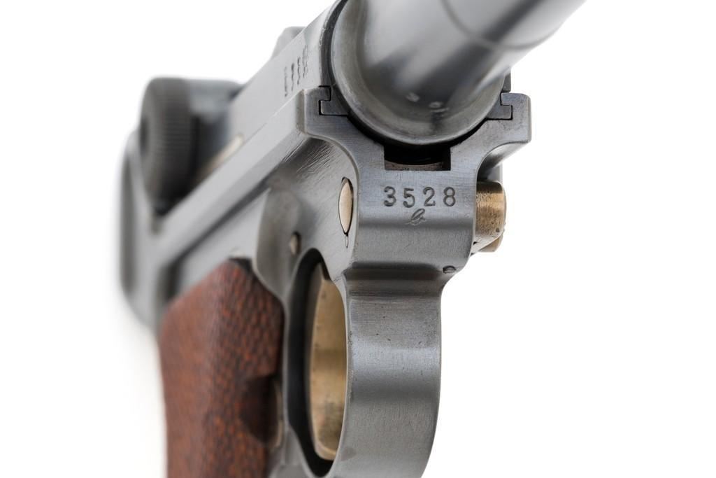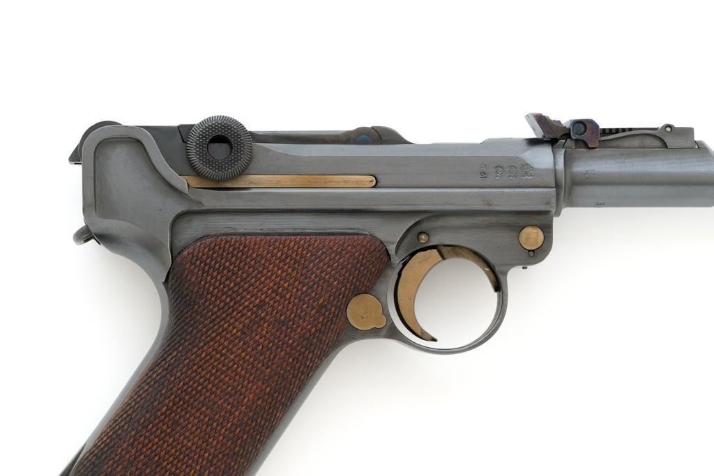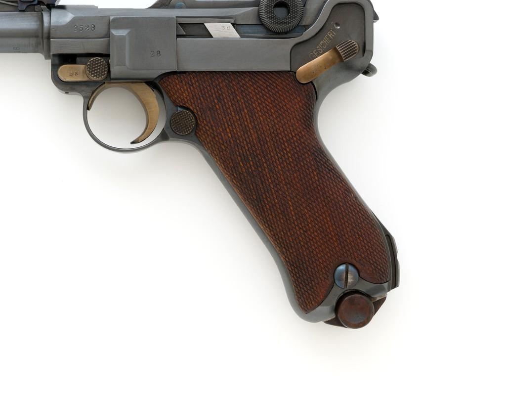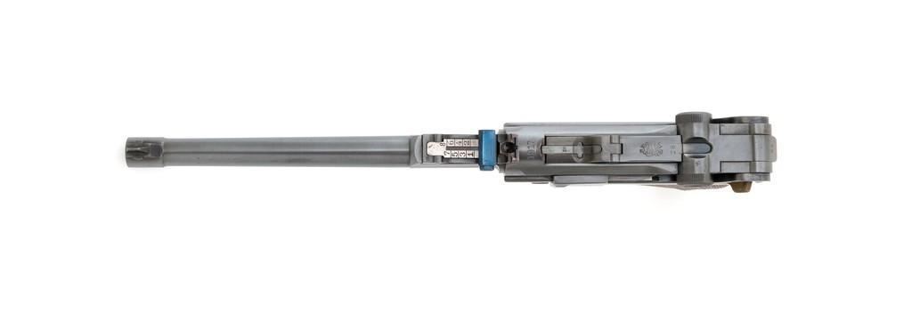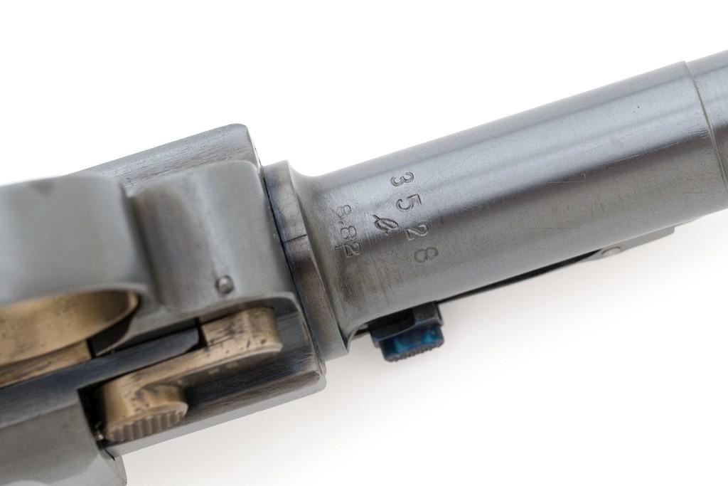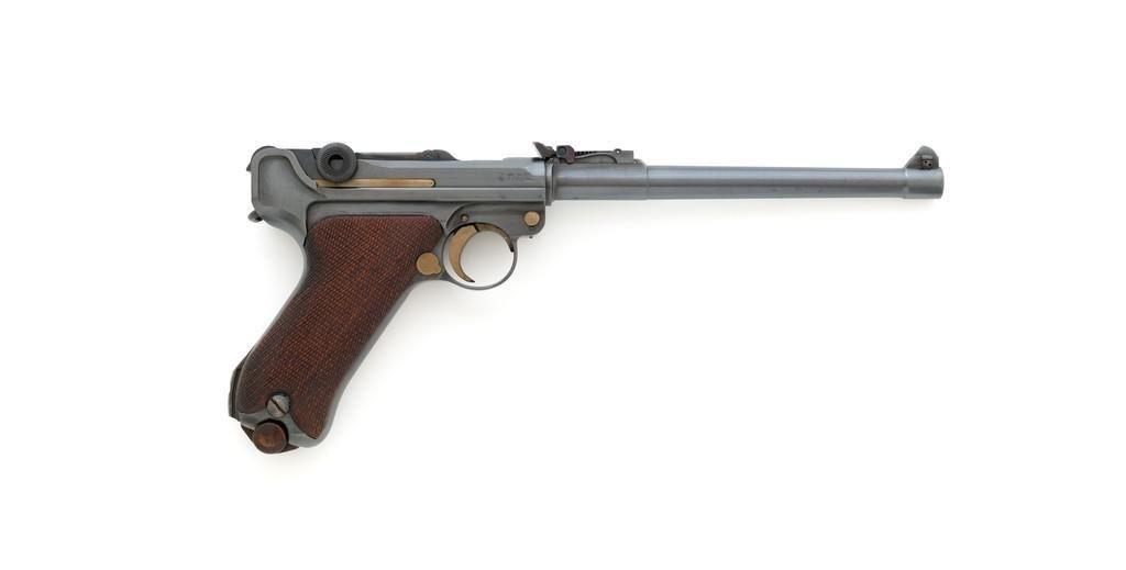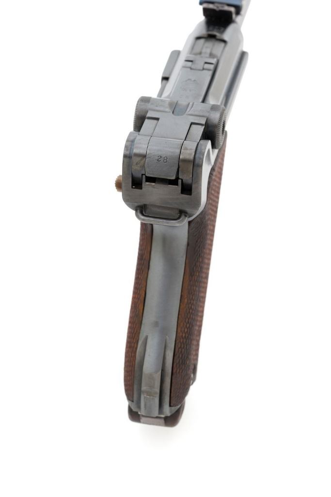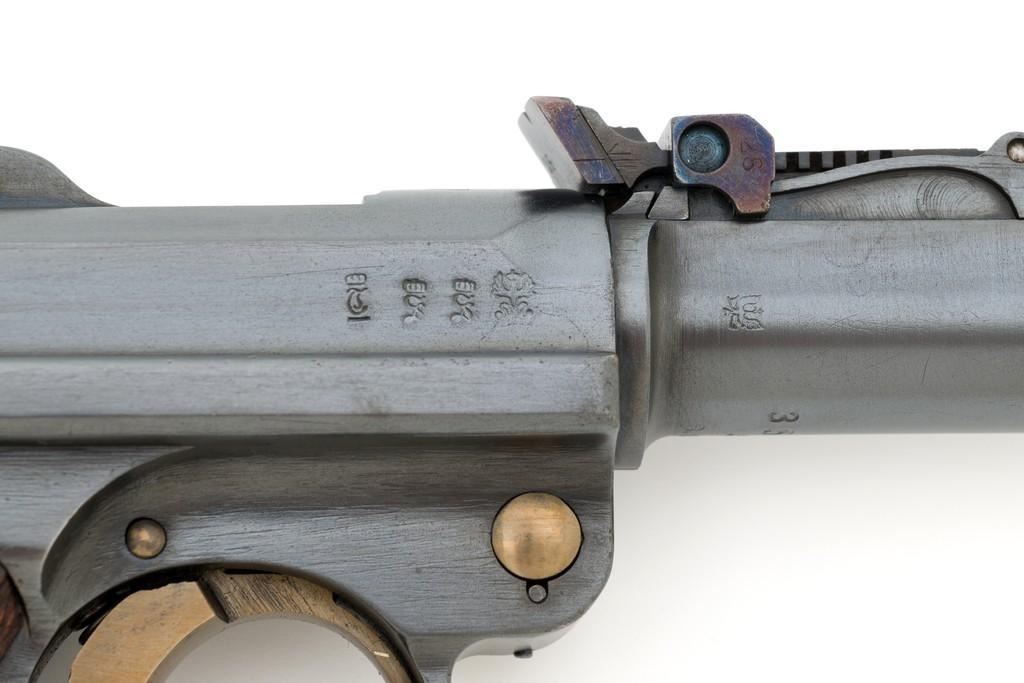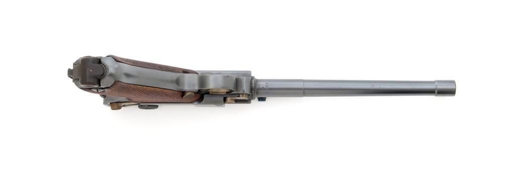 WWI 1917 Dated DWM Artillery Luger with Stock, #3528b, 9mm cal., 8'' barrel, blued finish, straw colored small parts, checkered walnut grips, dovetailed inverted-''V'' front sight, adjustable tangent rear sight with small ''V''-notched groove, and stock lug. Includes one unmarked tin plated magazine with wood base. Pistol is marked ''DWM'' on the toggle with ''1917'' date on the chamber. Right side of receiver with three ''crowned'' gothic letters and Imperial firing proof. Right side of rear sight base also with firing proof. All visible numbers matching, including the back of the left grip; right grip has ''D ROSE'' scratched into the back and there is no visible serial number. Includes an unmarked reproduction wooden flat board stock. Pistol is in near excellent overall condition as professionally restored, retaining approx. 98% reblued finish and straw colors; applied over intermittent salt and pepper pitting on the barrel. Serial numbers, maker's and proof marks are primarily crisp. Grips show moderate age and handling wear. Action and hold open function properly. Bore rates near excellent overall and is bright throughout with well-defined rifling. Magazine shows moderate age and rub wear to body, small dents and scratches to the base. Stock is in excellent condition, with a few small impressions and handling marks. There is no wear to the finish on the metal hardware. Est.: $1,800-2,400. (C&R)