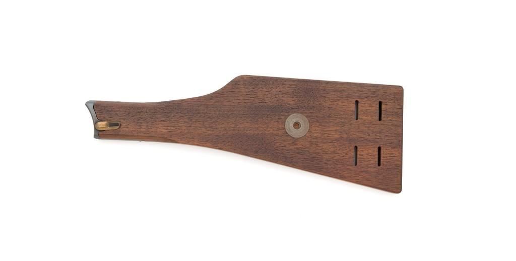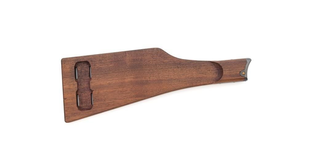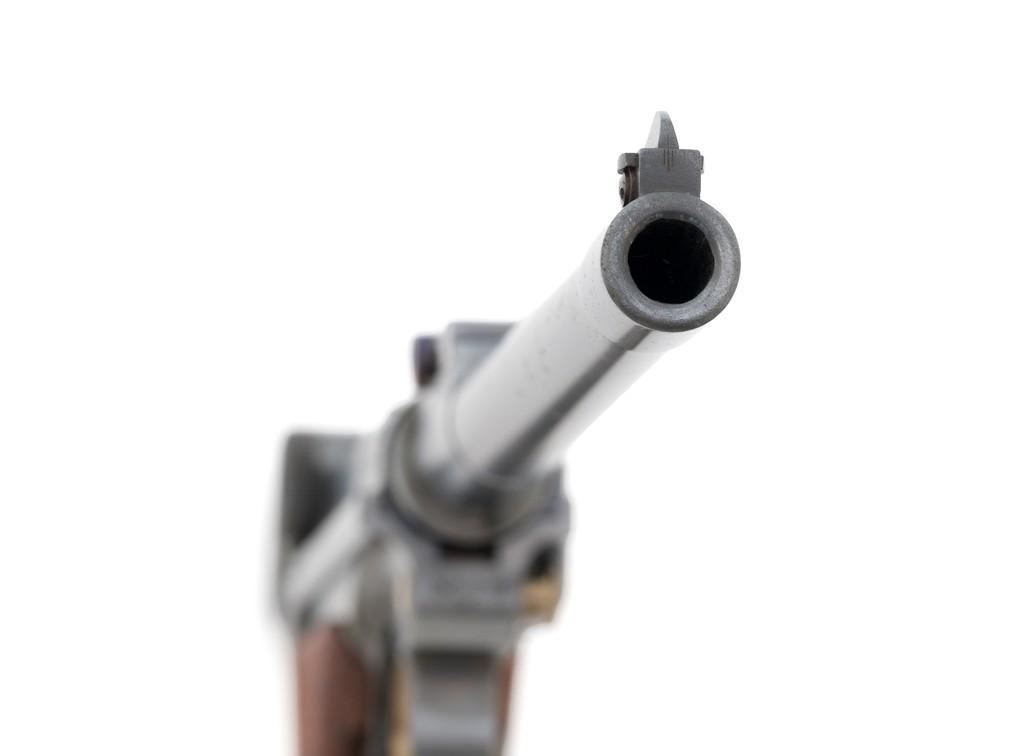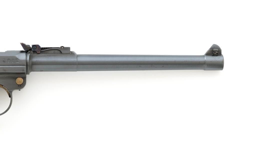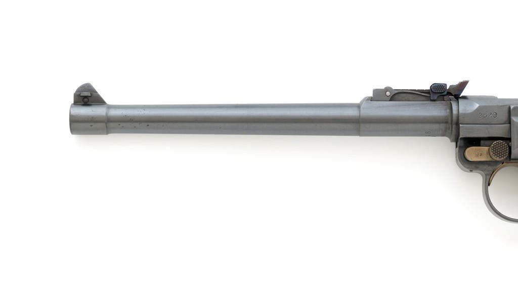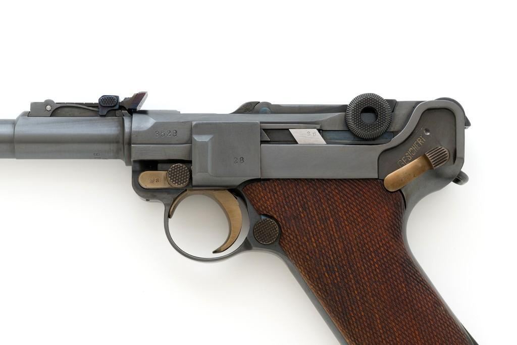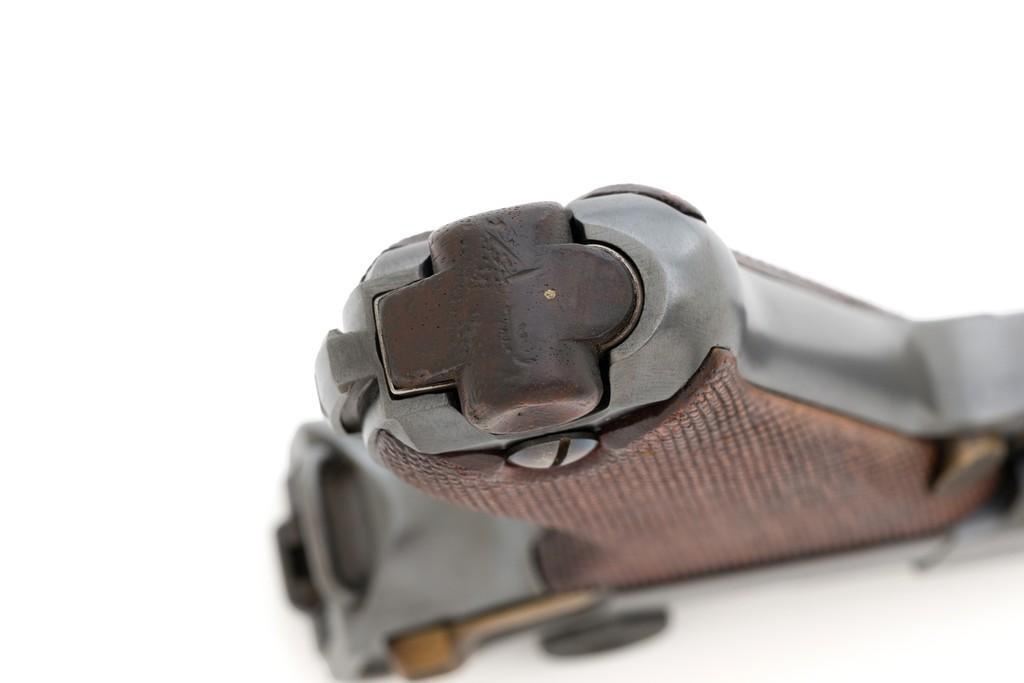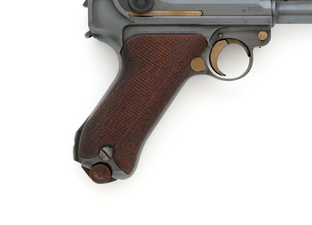 WWI 1917 Dated DWM Artillery Luger with Stock, #3528b, 9mm cal., 8'' barrel, blued finish, straw colored small parts, checkered walnut grips, dovetailed inverted-''V'' front sight, adjustable tangent rear sight with small ''V''-notched groove, and stock lug. Includes one unmarked tin plated magazine with wood base. Pistol is marked ''DWM'' on the toggle with ''1917'' date on the chamber. Right side of receiver with three ''crowned'' gothic letters and Imperial firing proof. Right side of rear sight base also with firing proof. All visible numbers matching, including the back of the left grip; right grip has ''D ROSE'' scratched into the back and there is no visible serial number. Includes an unmarked reproduction wooden flat board stock. Pistol is in near excellent overall condition as professionally restored, retaining approx. 98% reblued finish and straw colors; applied over intermittent salt and pepper pitting on the barrel. Serial numbers, maker's and proof marks are primarily crisp. Grips show moderate age and handling wear. Action and hold open function properly. Bore rates near excellent overall and is bright throughout with well-defined rifling. Magazine shows moderate age and rub wear to body, small dents and scratches to the base. Stock is in excellent condition, with a few small impressions and handling marks. There is no wear to the finish on the metal hardware. Est.: $1,800-2,400. (C&R)