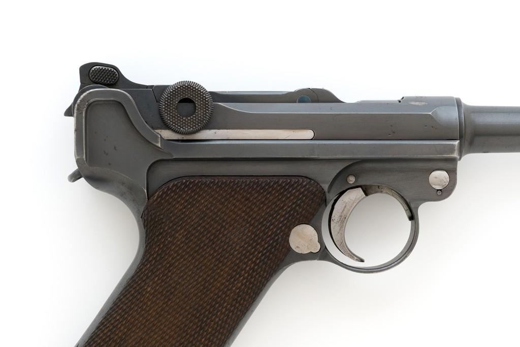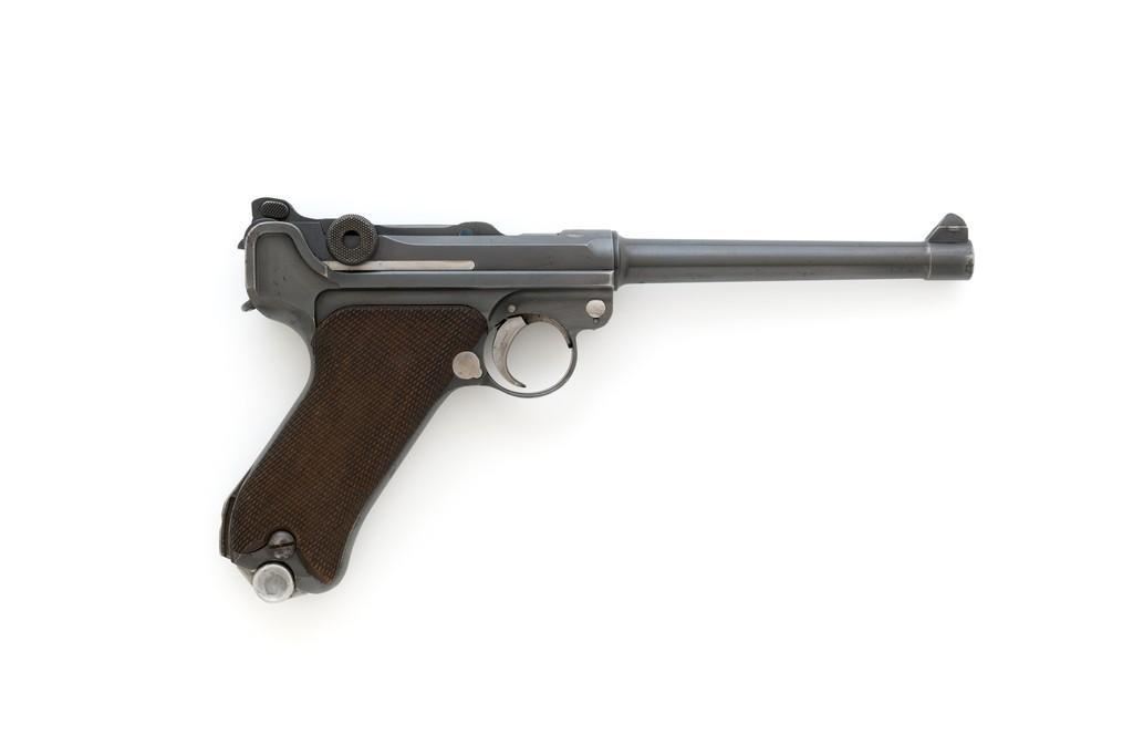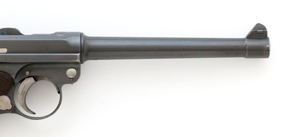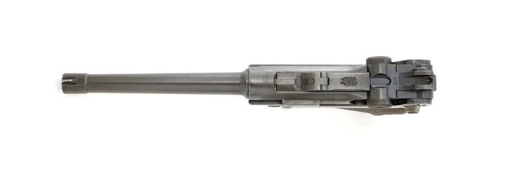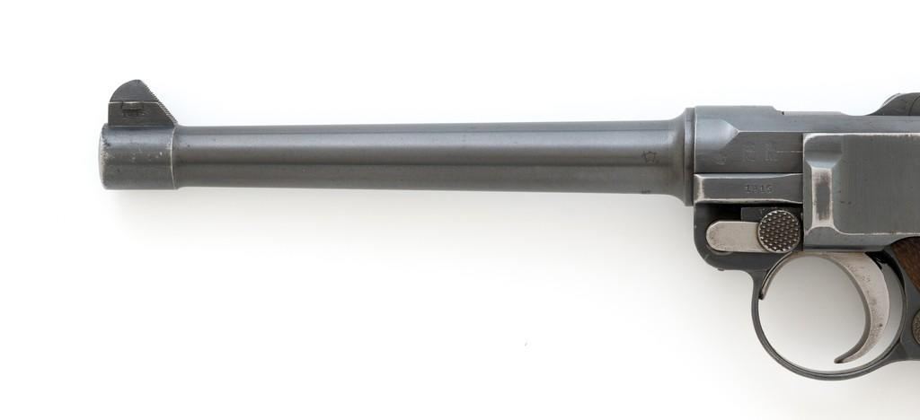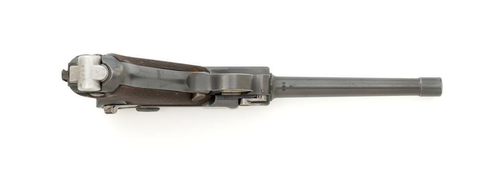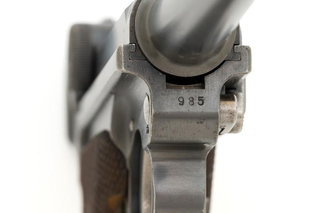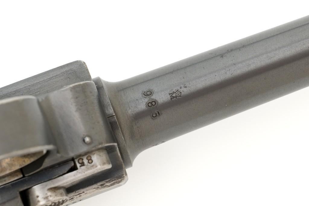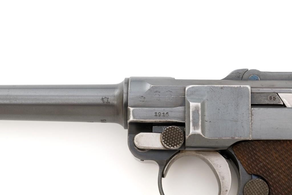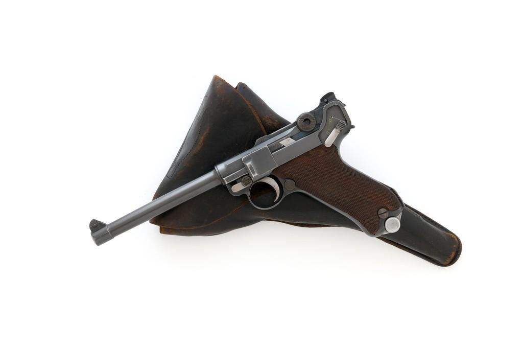 WWI Imperial German 1916 Dated Navy Luger with Holster, #985, 9mm cal., 6'' barrel, rust blue finish, straw colored small parts, checkered walnut grips, dovetailed inverted-''V'' front, and two-position adjustable rear sight with ''V''-notch, and stock lug. Includes one mismatched aluminum based Haenel Schmeisser magazine. Also included is a period modified, unmarked black leather holster. The exterior cleaning rod holder and interior compartment for the takedown tool have both been removed. The original belt loop has also been replaced, extra hole added to the front flat for the closing stud, and the lifting strap removed. Holster has no visible maker's marks but the inside of the flap has what appears to be a German name written in pencil. The pistols toggle is marked ''DWM'' with a ''1916'' chamber date. Imperial Navy proof mark and two ''(crown)M'' acceptance marks are visible on the left side of the receiver. Left side of barrel with Imperial Navy ''(crown)'' proof mark, bottom with ''(crown)M''; ''1916'' on left side of the front sight base and left edge of the frame, above the takedown lever. All visible numbers matching (excluding the magazine); grips and firing pin are not numbered. Pistol is in fine overall condition, retaining approx. 92%-94% original blue with light wear at the muzzle, sideplate, and stock lug accounting for most the finish loss. There is mild frosting present on the front and backstrap. Factory lettering and proof marks are clear. Straw colored parts are almost completely silver colored. Grips display normal signs of age and light handling wear; checkering detail is primarily crisp. Action and hold open function properly. Bore with scattered light erosion and is otherwise bright; rifling is very good. Magazine shows typical light rub wear and small marks from use. Holster is in fair condition as modified. The flap needs to be repaired and is holding on by only a few threads. Otherwise, leather remains supple and has general moderate scuffs, scratches, and some age cracking. Est: $2,500-$3,500. (C&R/PPT)